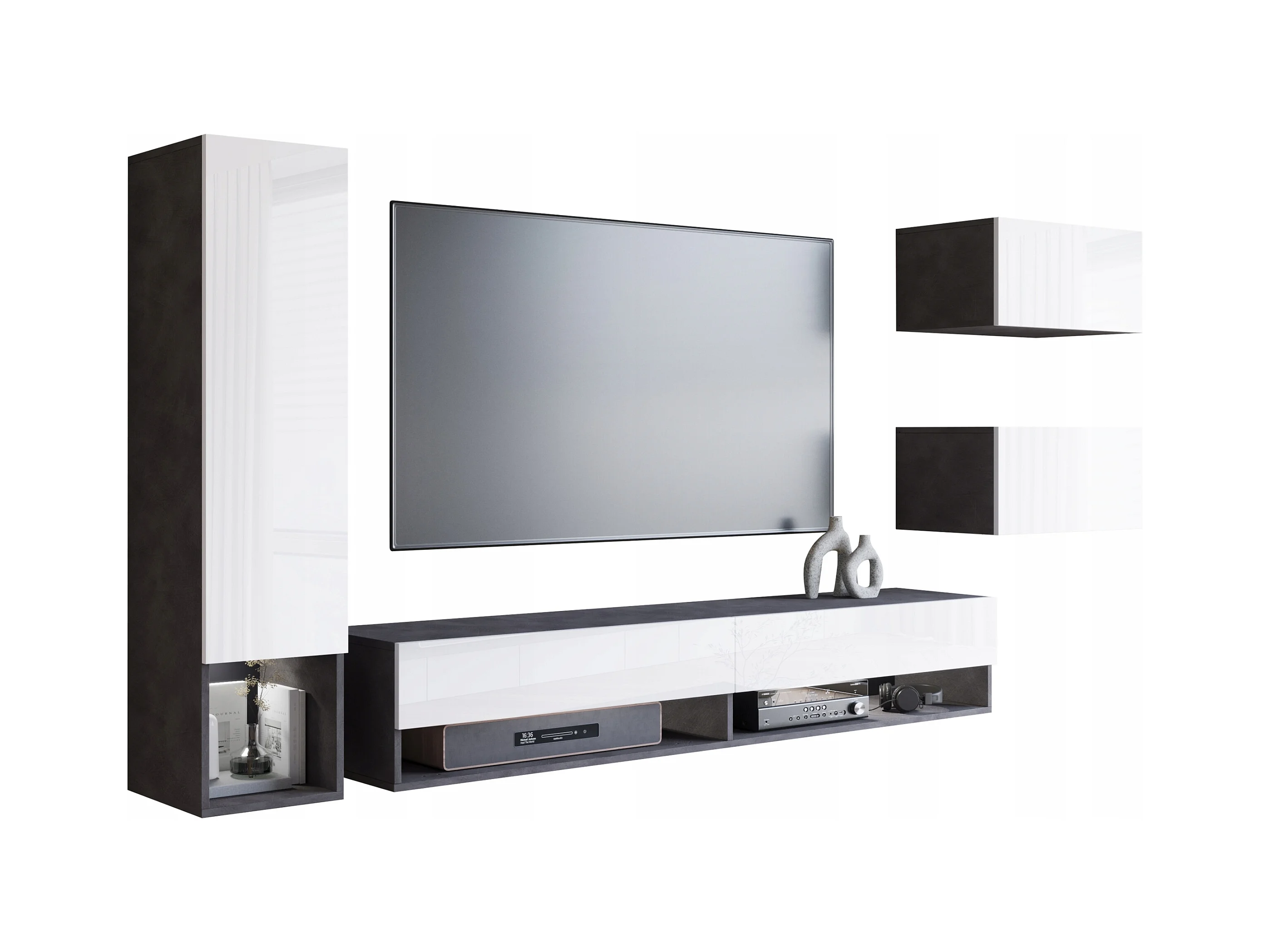 Meuble mural moderne avec LED 4 éléments – ensemble suspendu TV 180 cm, colonne, 2 meubles, corps anthracite, façades blanc brillant