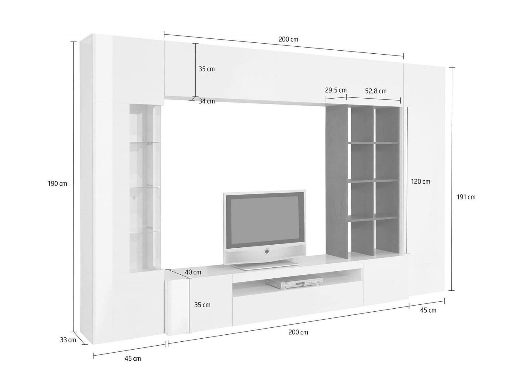 Ensemble mural Ocean, meuble TV pour salon, meuble de salon polyvalent avec lumière LED, 100% Made in Italy, 290x40h192 cm, blanc brillant et ardoise