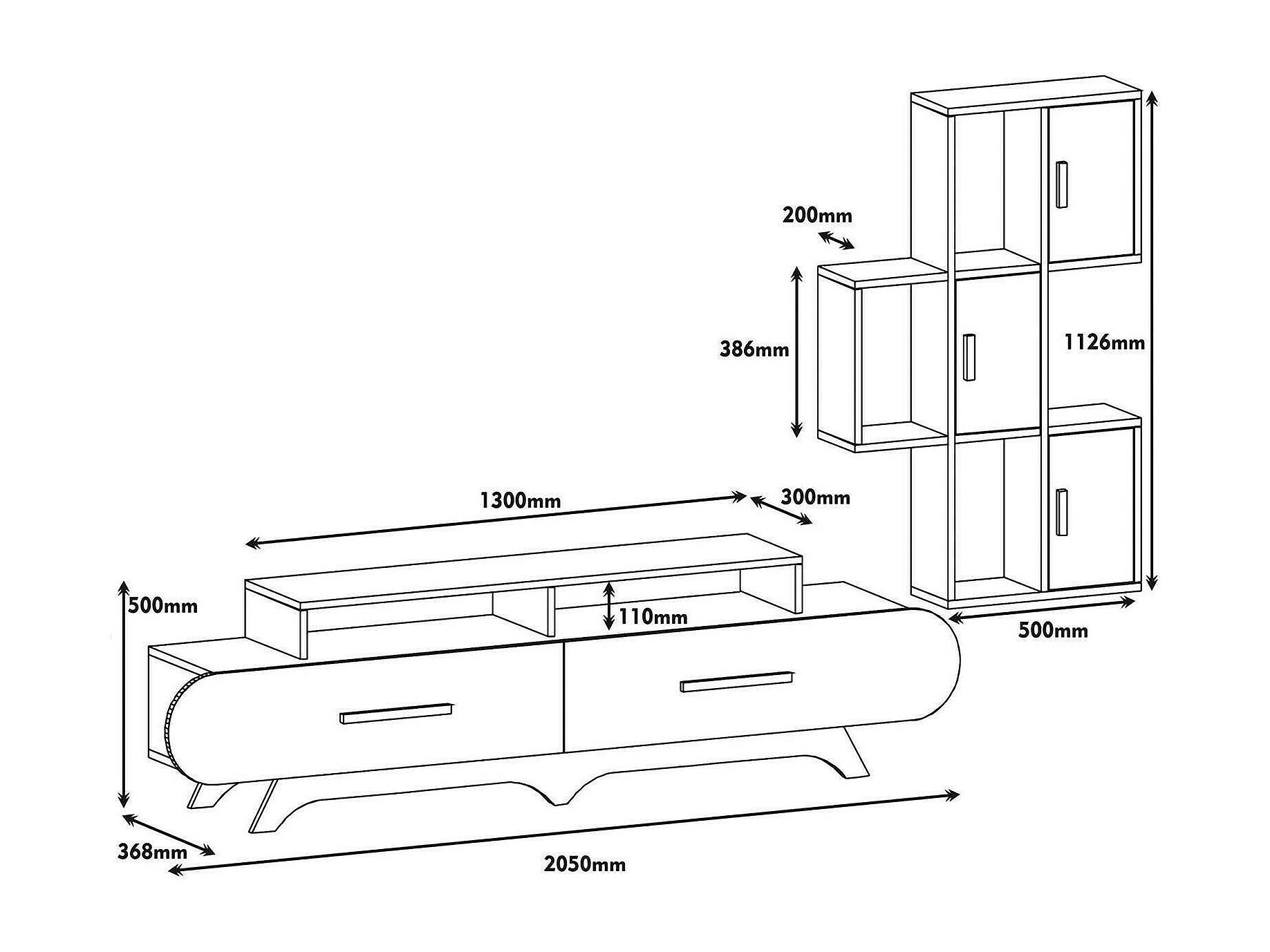 Meuble Mural Zephyria, Composition du salon, Meubles de salon polyvalents, Meuble télé, 205x37h50 cm, Noyer et Blanc