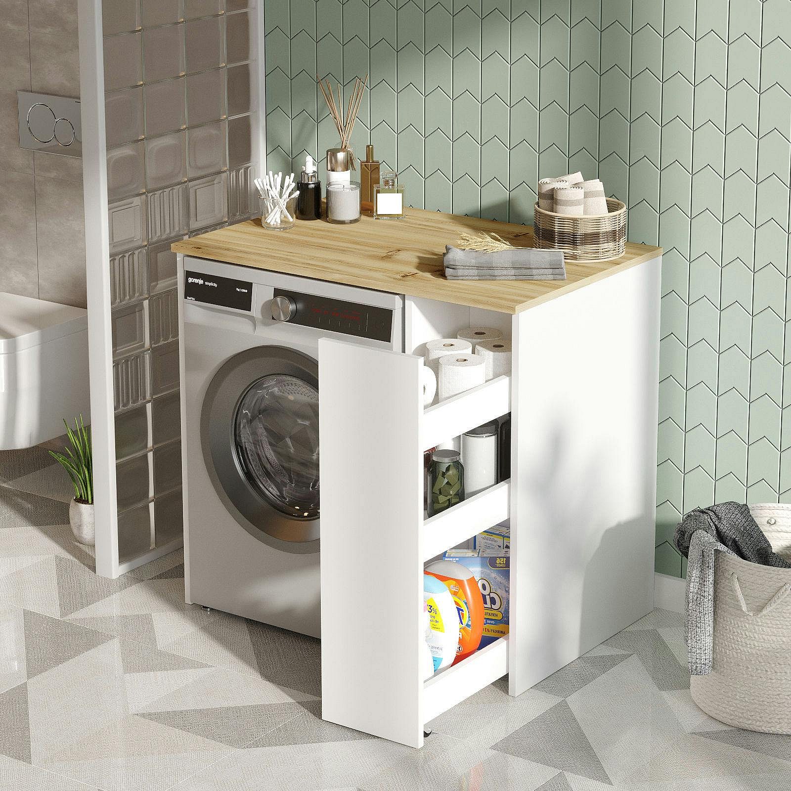 Meuble pour lave-linge 1 tiroir, blanc & bois clair MARFA