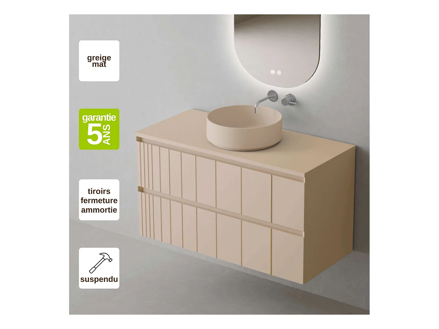 Meuble Salle de Bain POLE (61 cm x H54 x P45 cm), Plan Vasque Marin ROLL G.Mat, 2 Tiroirs, Laqué Greige Mat