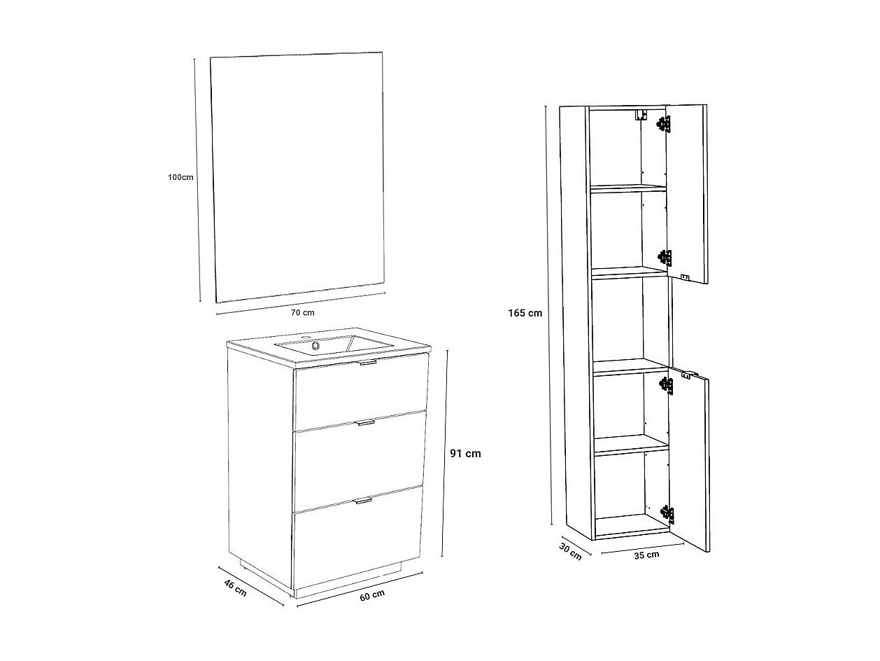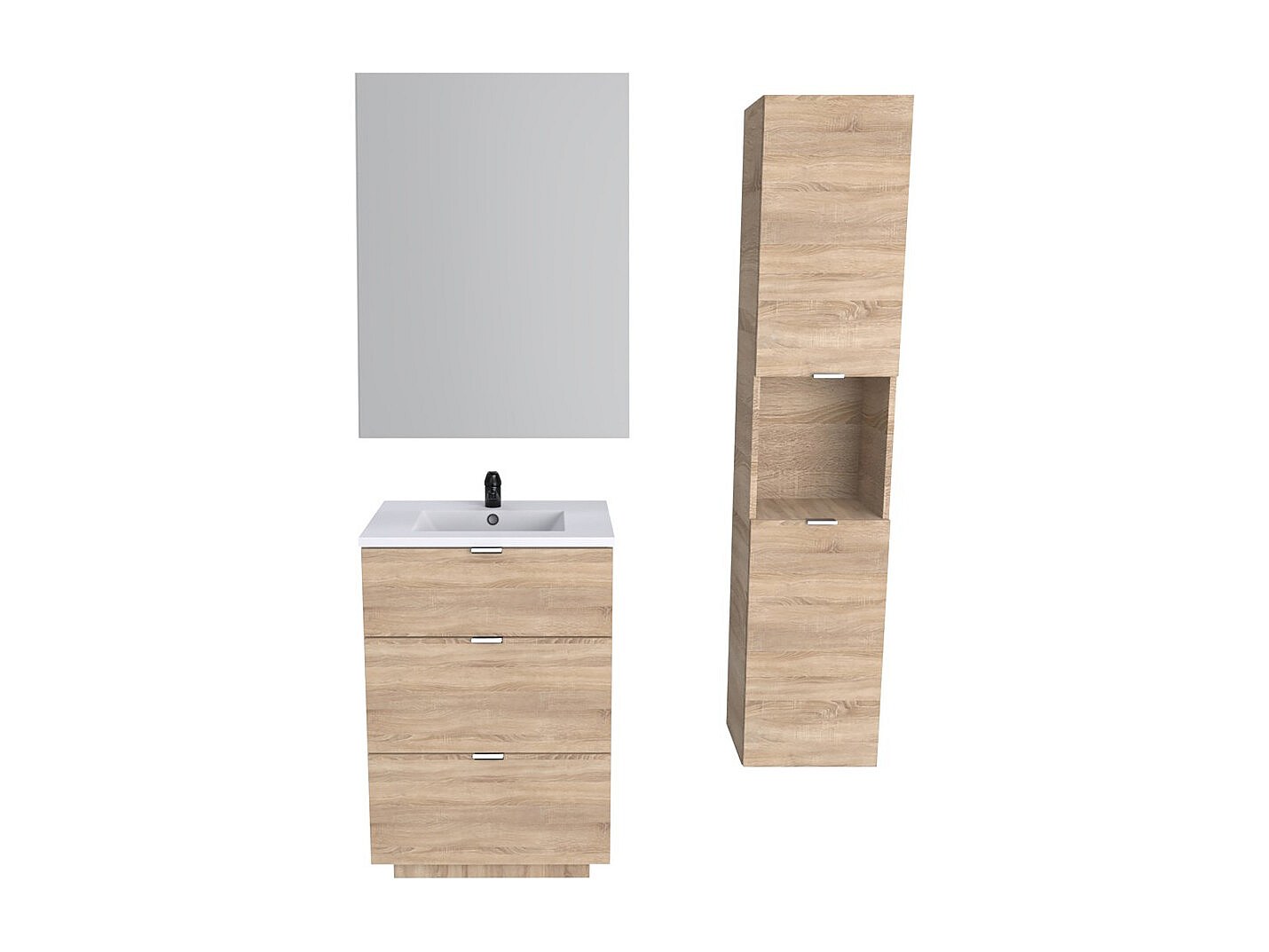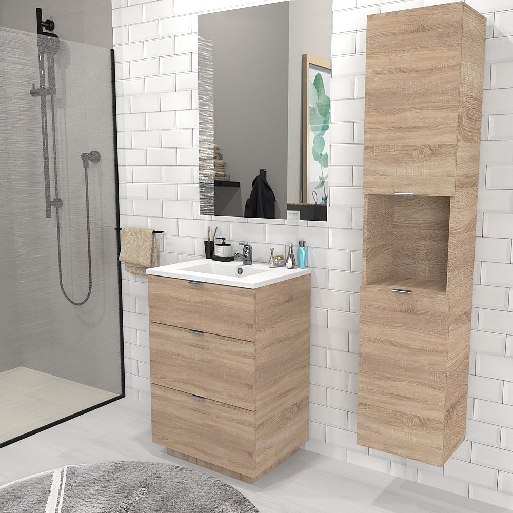 Meuble sous vasque MARBELLA 60 cm + vasque + miroir + colonne / Décor Chêne blanchi