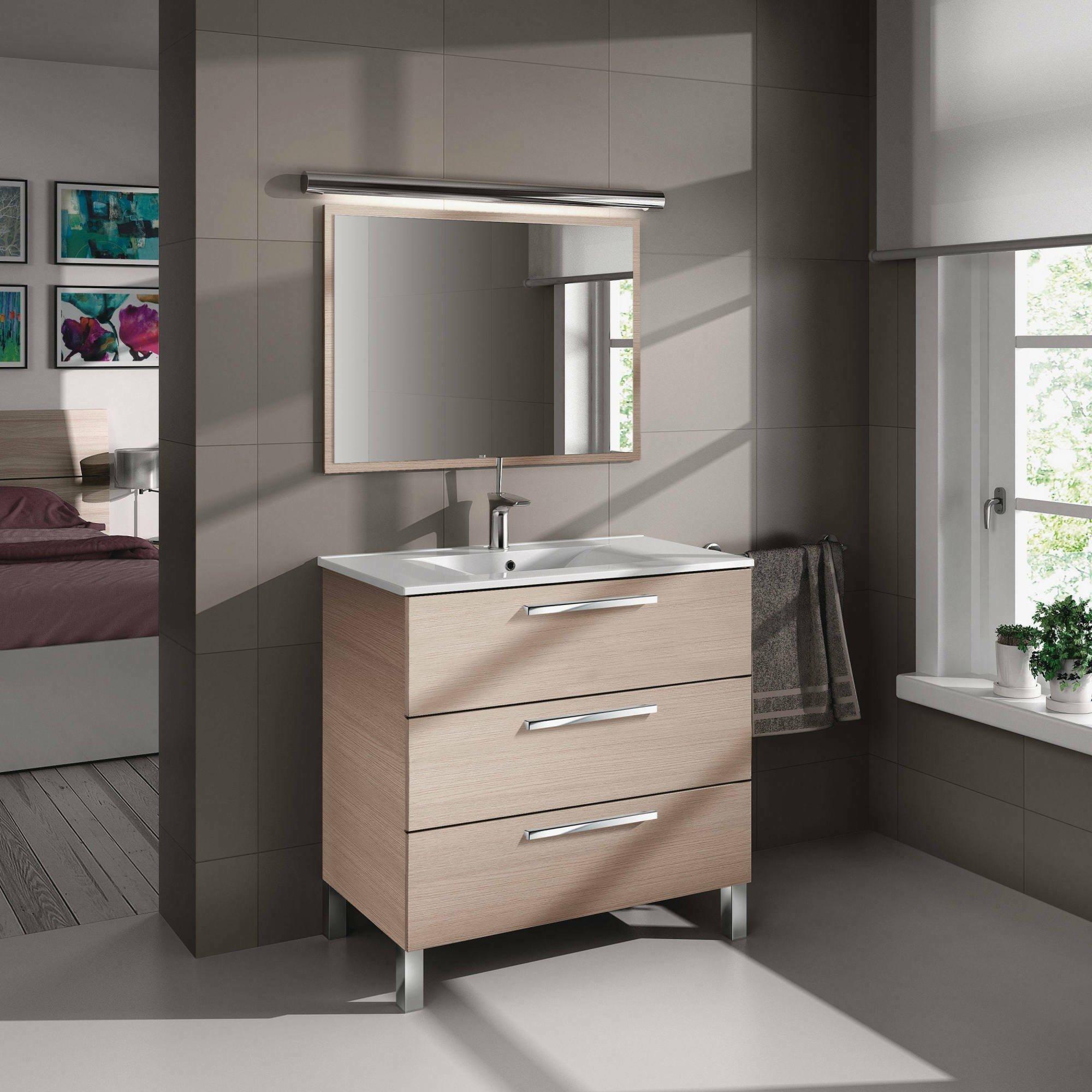 Meuble sous-vasque Palmdale, Meuble de salle de bain, Meuble avec 3 tiroirs et miroir, lavabo non inclus, 80x45h86 cm, Chêne
