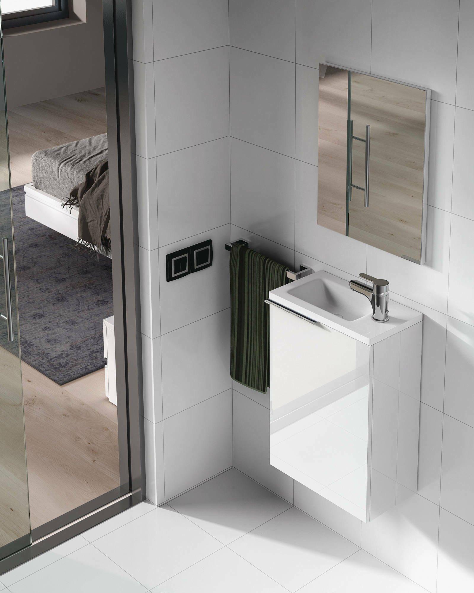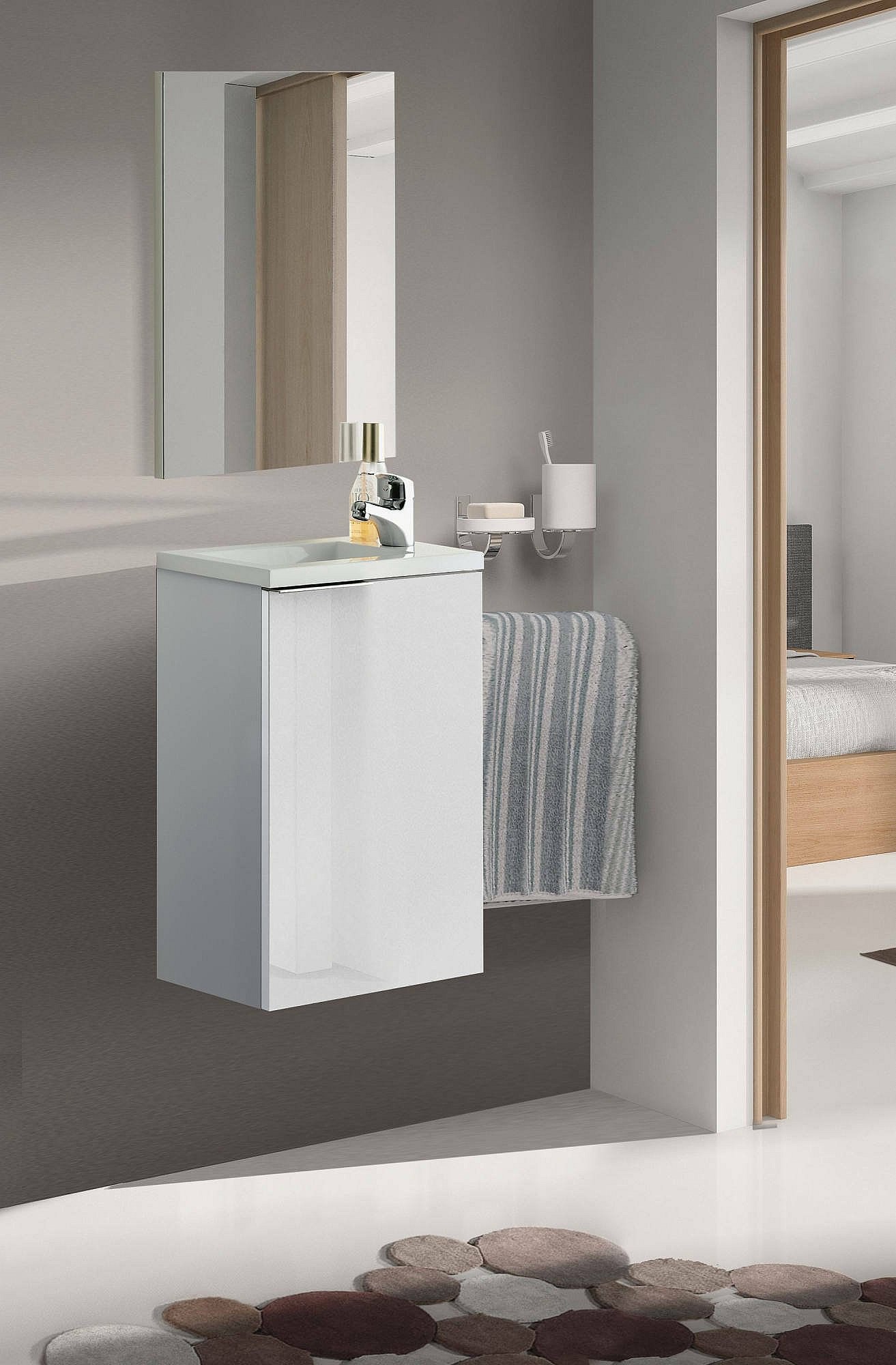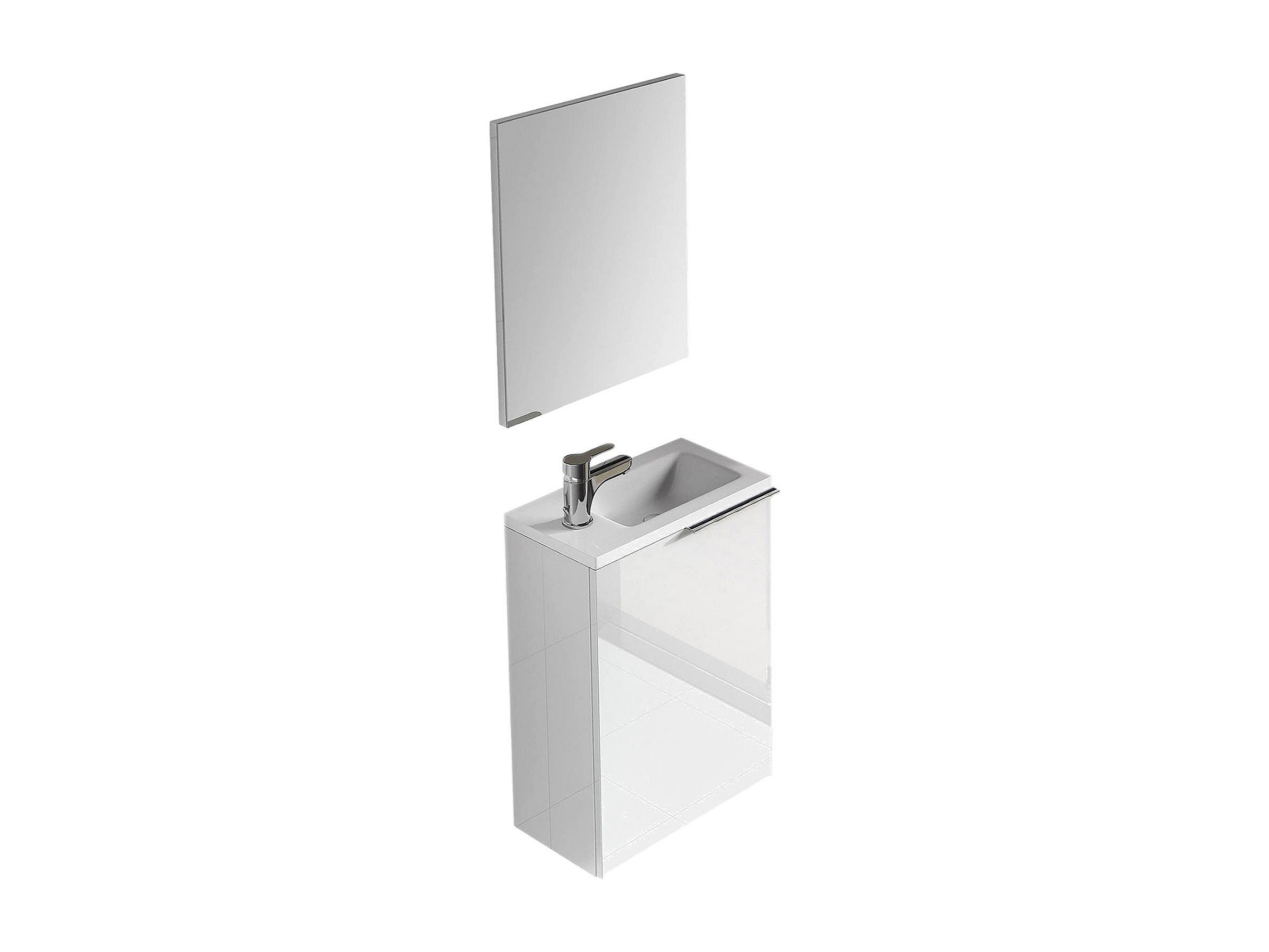 Meuble sous-vasque Peoria, Meuble de salle de bain suspendu, armoire 1 porte avec miroir et lavabo, 40x22h58 cm, Blanc brillant