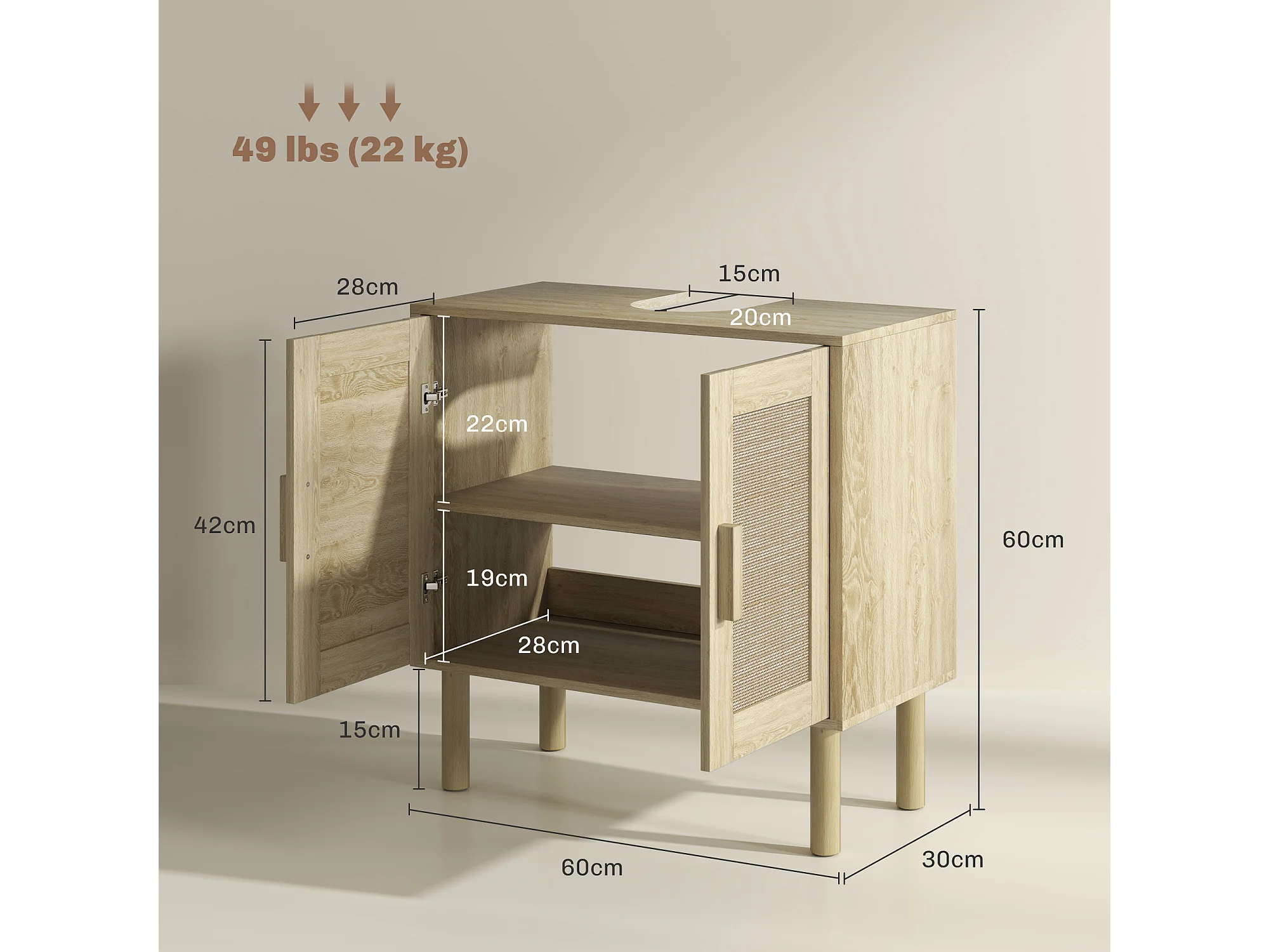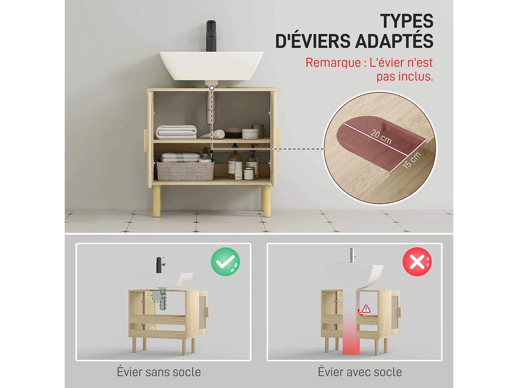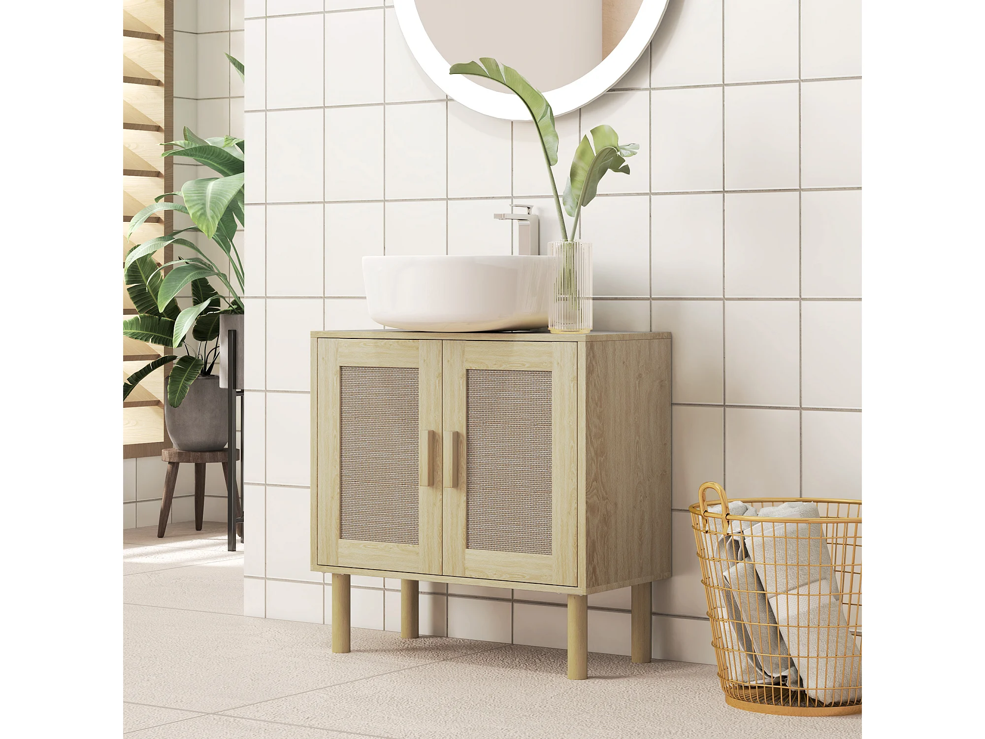 Meuble sous vasque style bohème - 2 portes, étagère - effet rotin bois clair