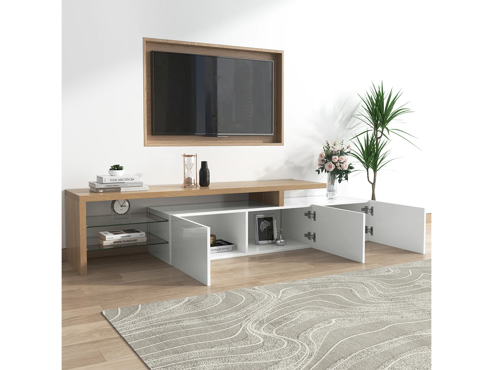 Meuble TV 197 cm avec LED, 3 Portes et Étagères en Verre, Meuble Télé Longueur pour Salon, Blanc