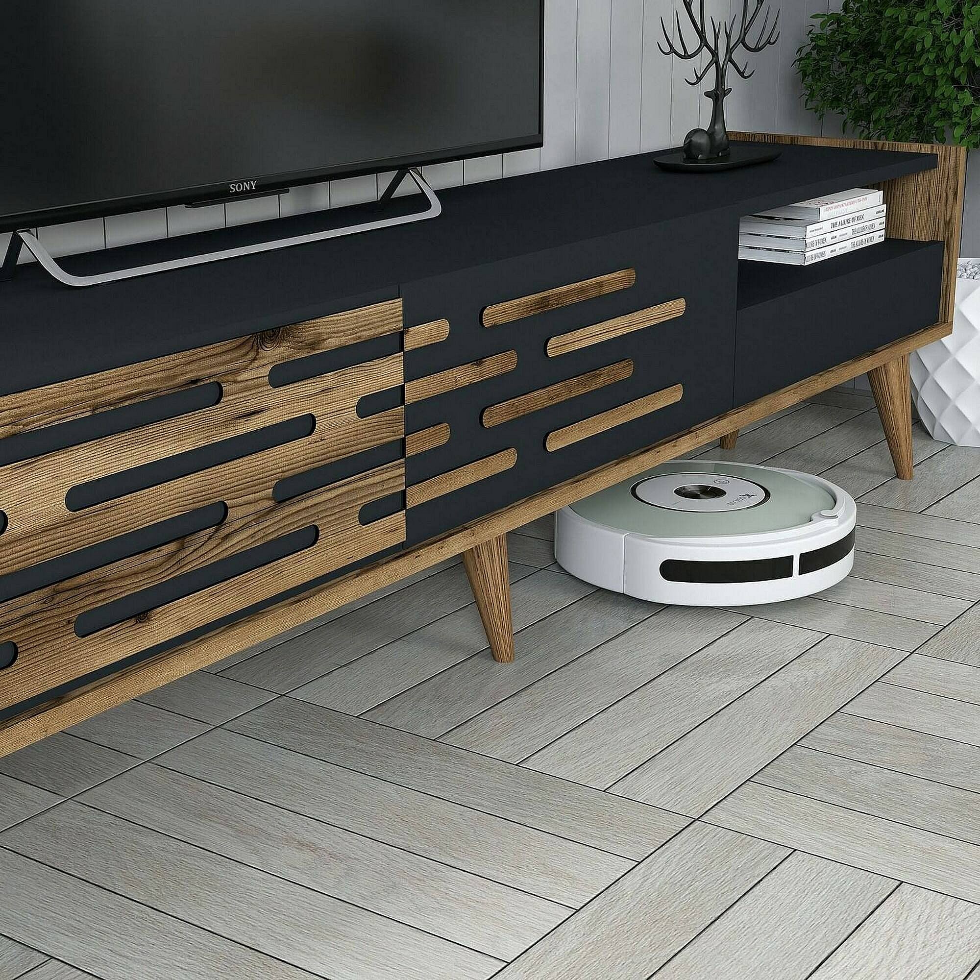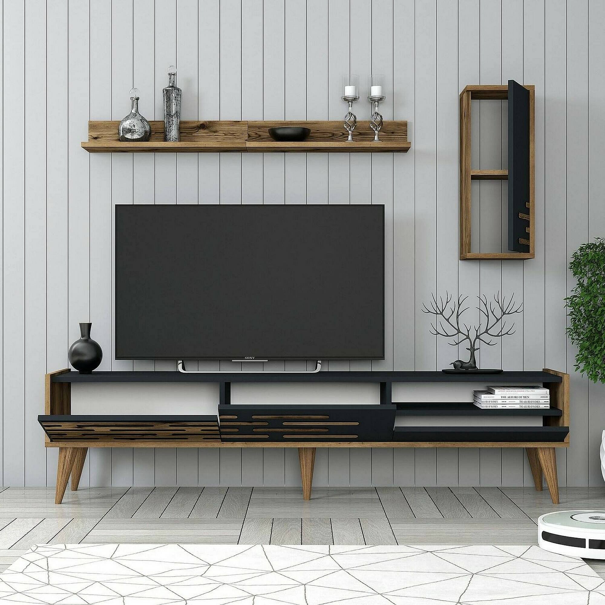 Meuble TV Alnilam, Buffet de salon, Armoire basse pour TV, Base murale de rangement, 180x45h35 cm, Anthracite et Noyer