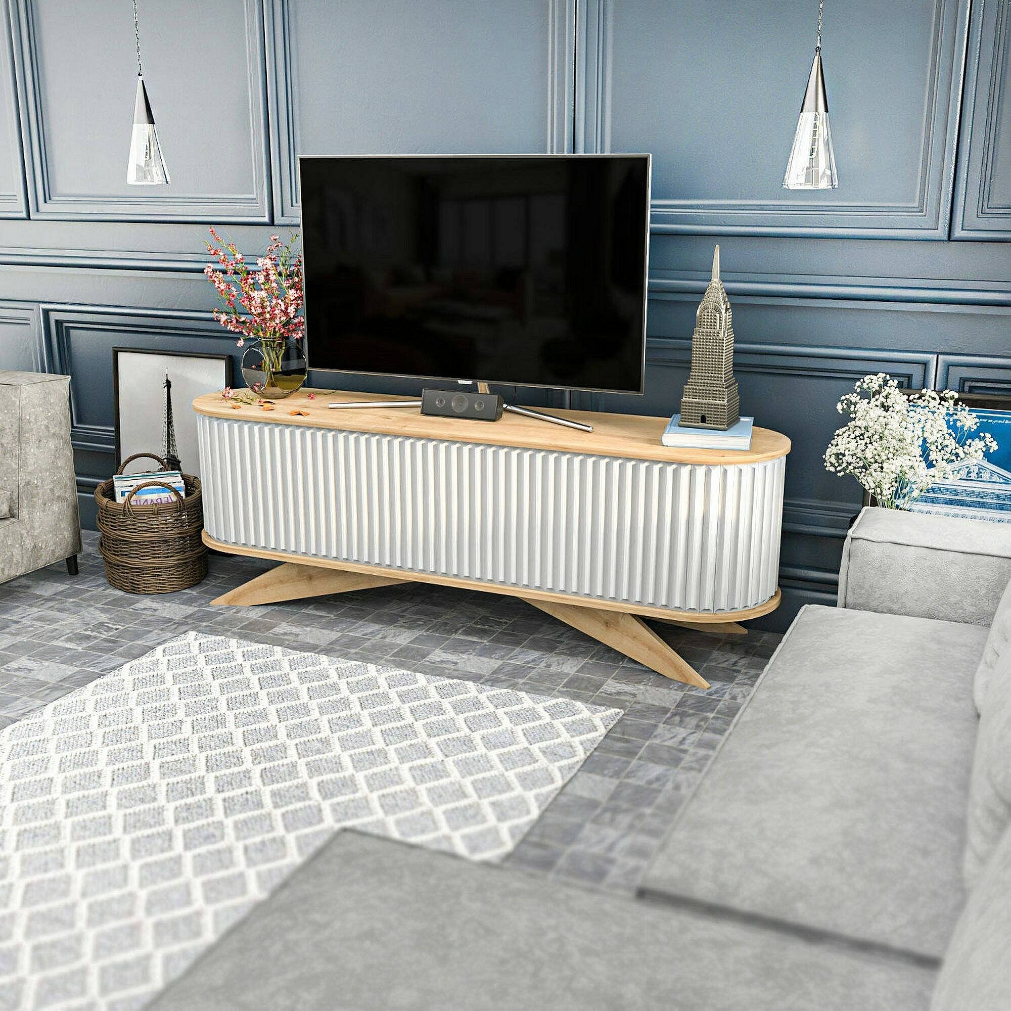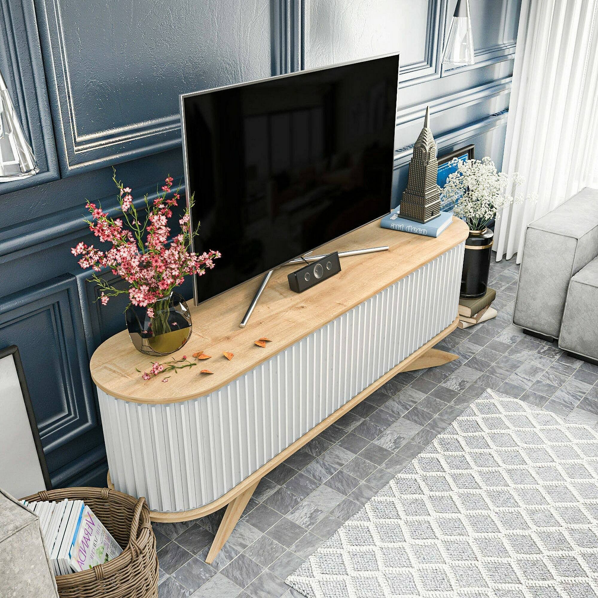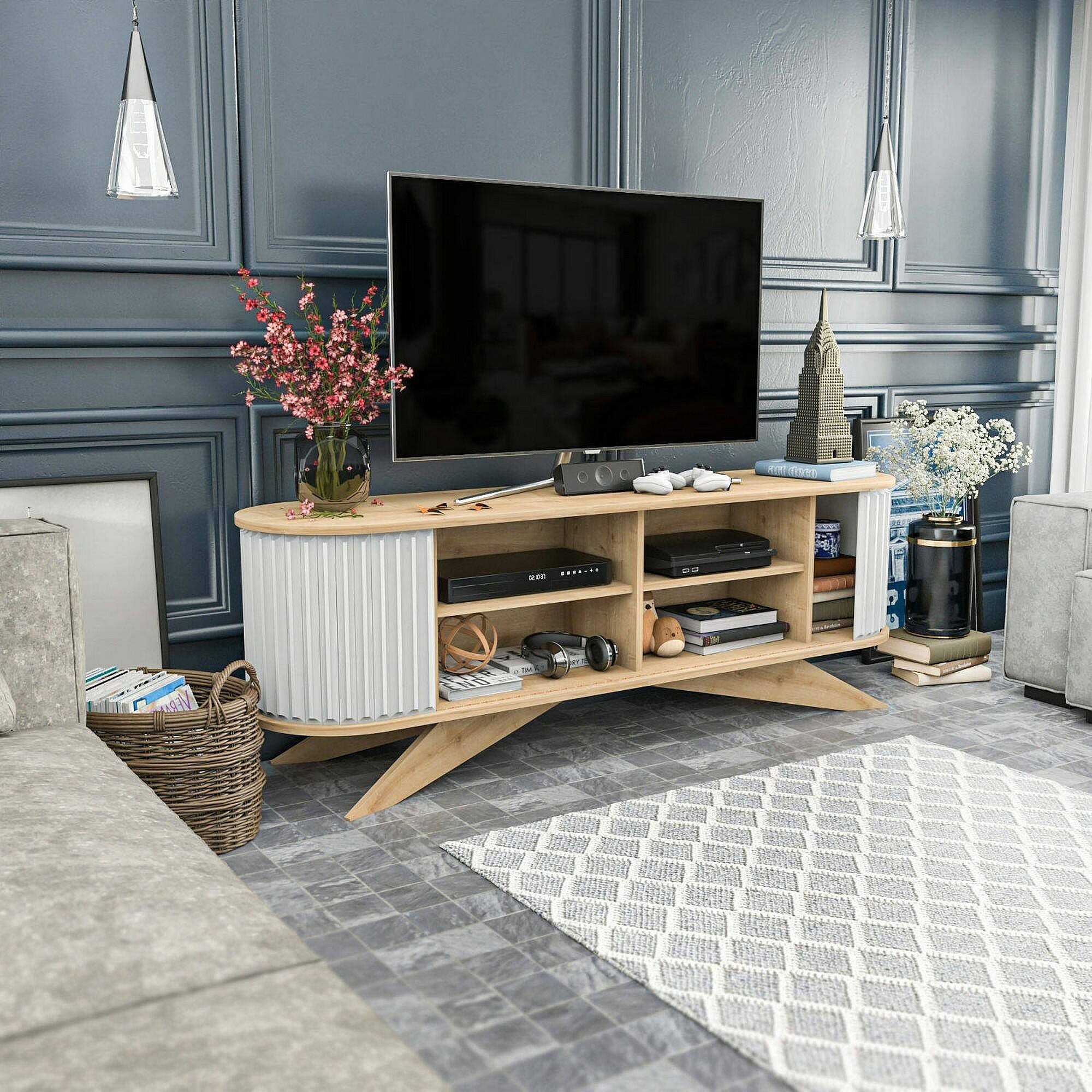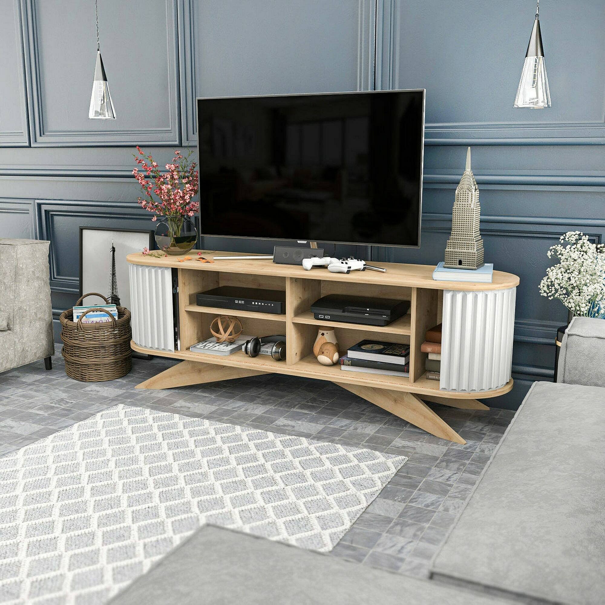 Meuble TV Aludra, Buffet de salon, Armoire basse pour TV, Base murale de rangement, 180x43h60 cm, Chêne et Blanc