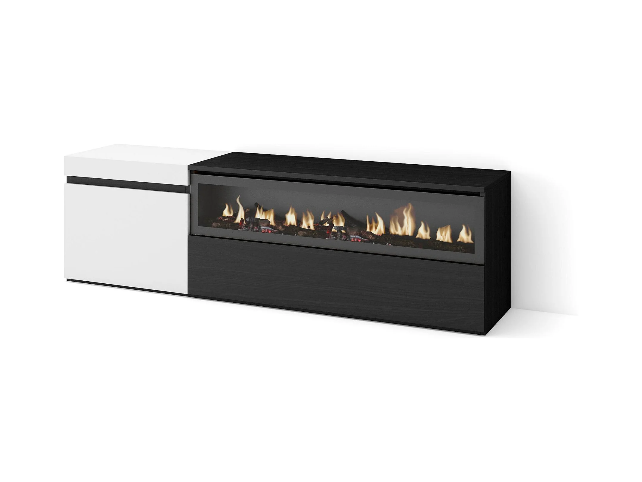 Meuble TV, Banc Télé, 150x35x45cm, Pour les TV jusqu'à 65", Cheminée électrique, Blanc et noir