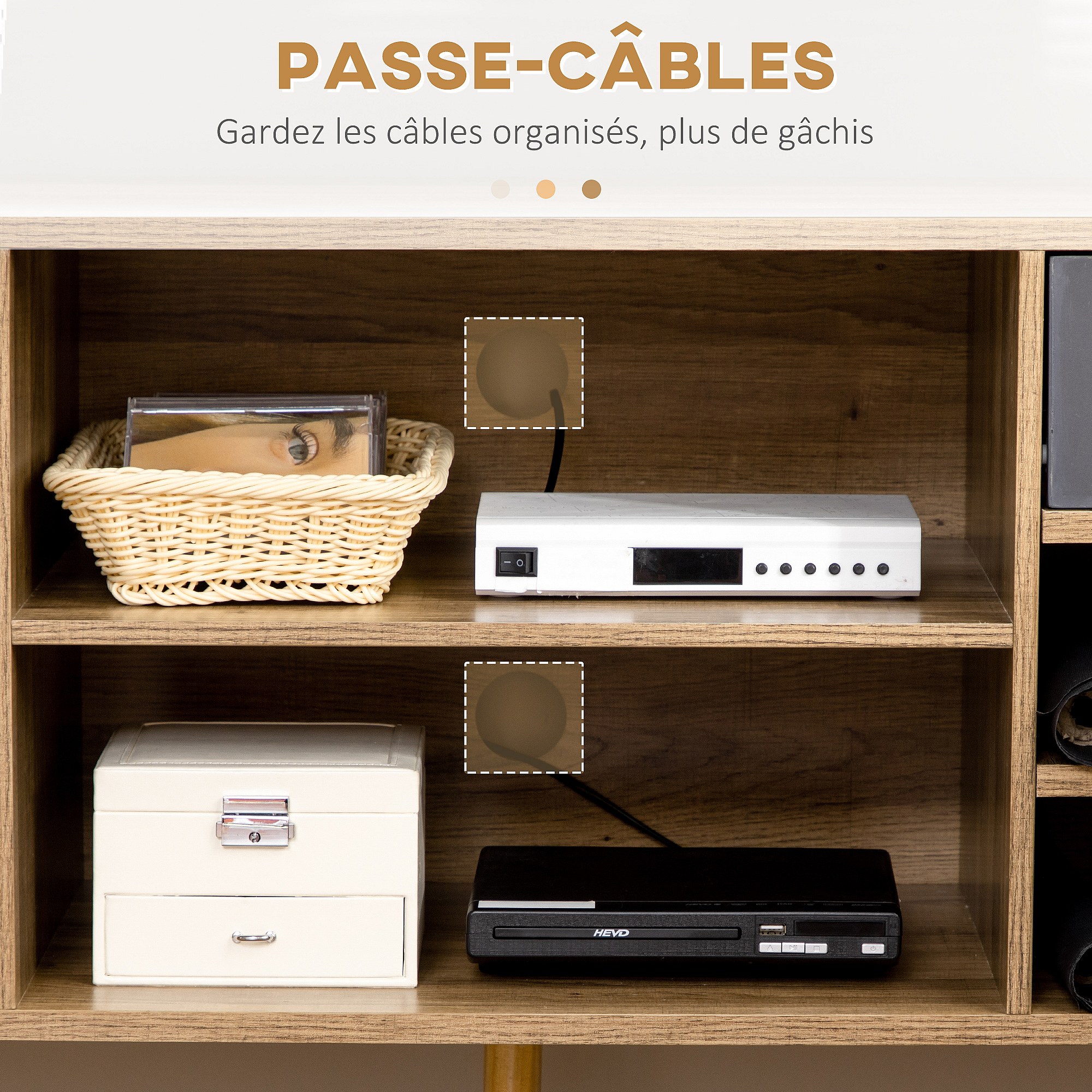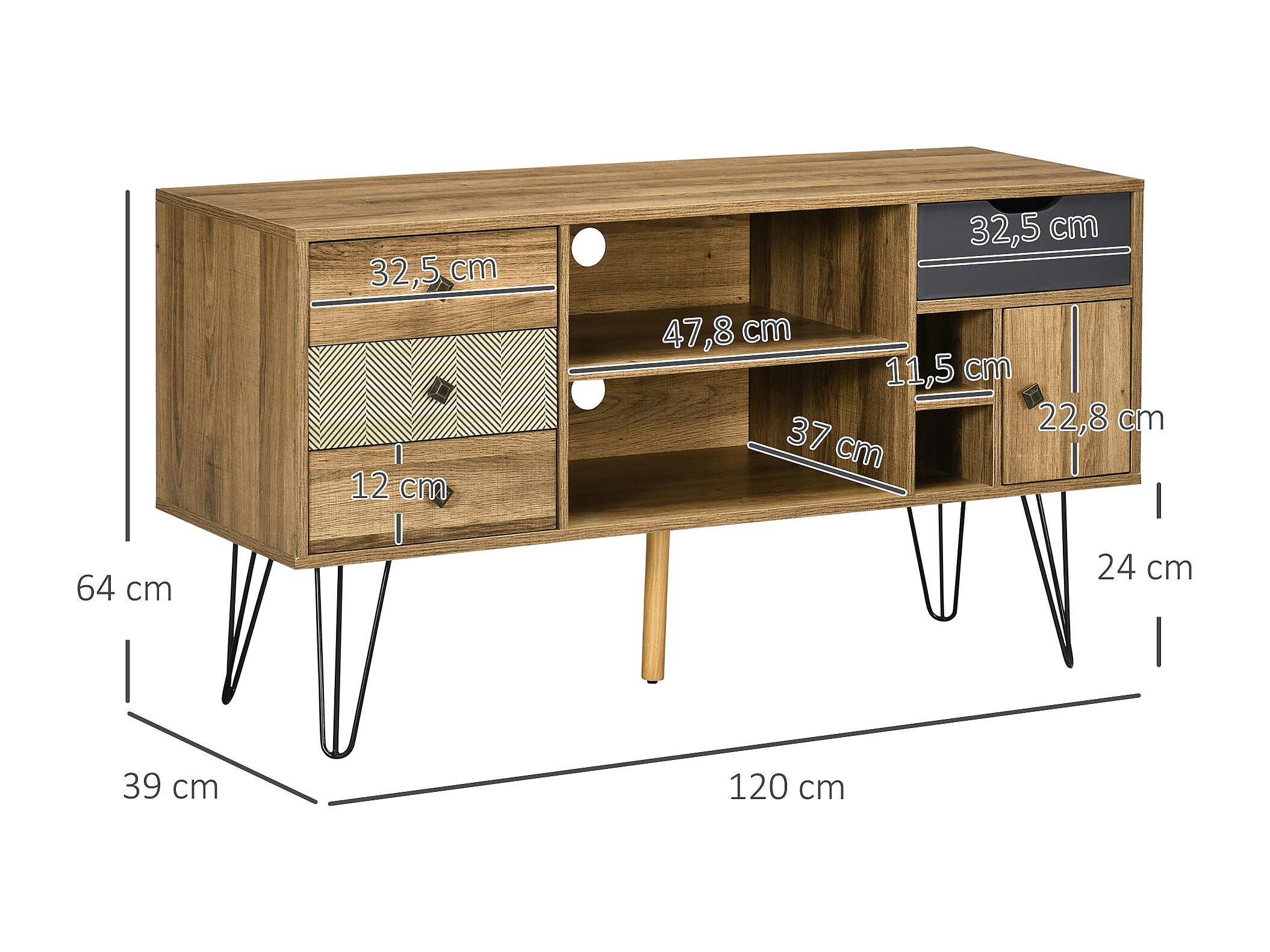 Meuble TV banc TV design industriel graphique - 4 tiroirs, 4 niches, porte - piètement épingle métal noir aspect bois