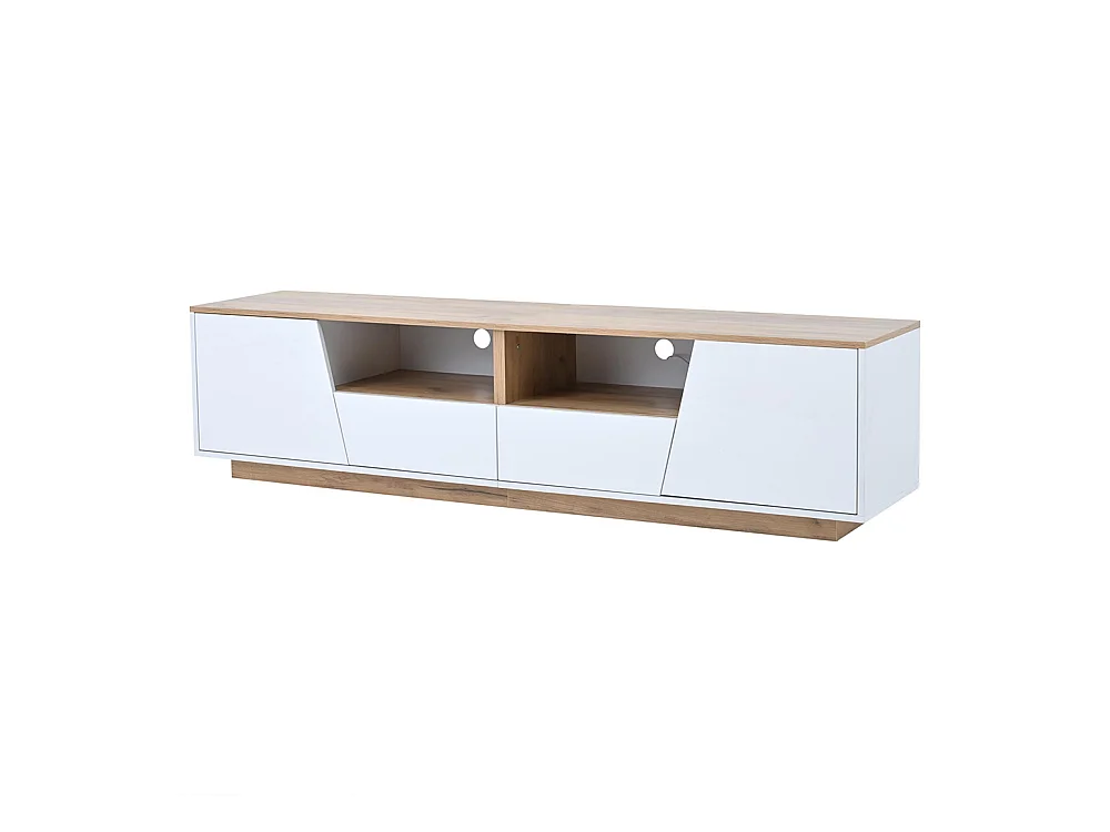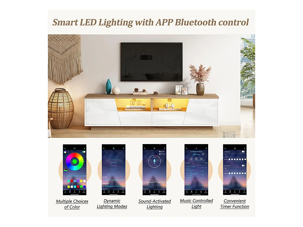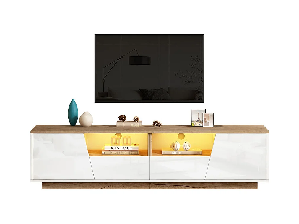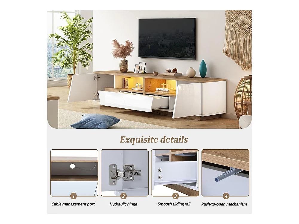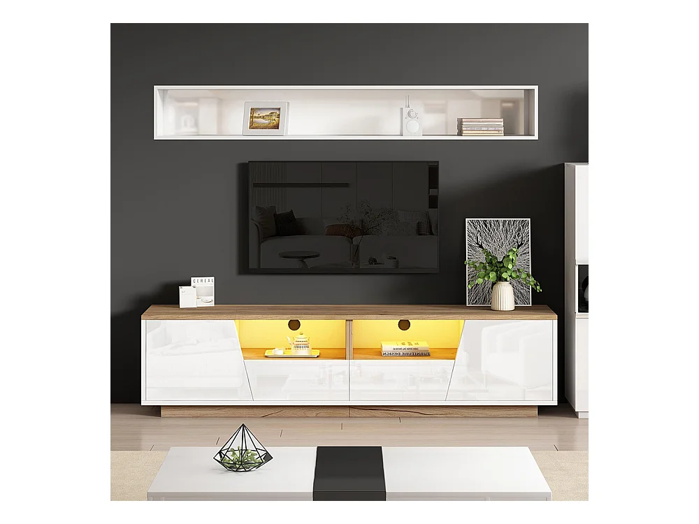 Meuble TV bas brillant 2 tiroirs 2 armoires LED TV 75 pouces blanc+couleur bois