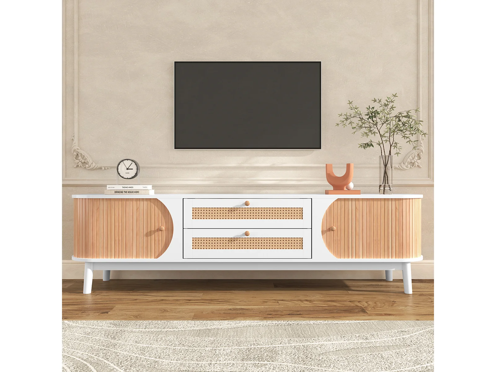 Meuble TV Bas en Bois Massif et Rotin - 2 Tiroirs, 2 Portes Coulissantes - Pour Salon - Naturel