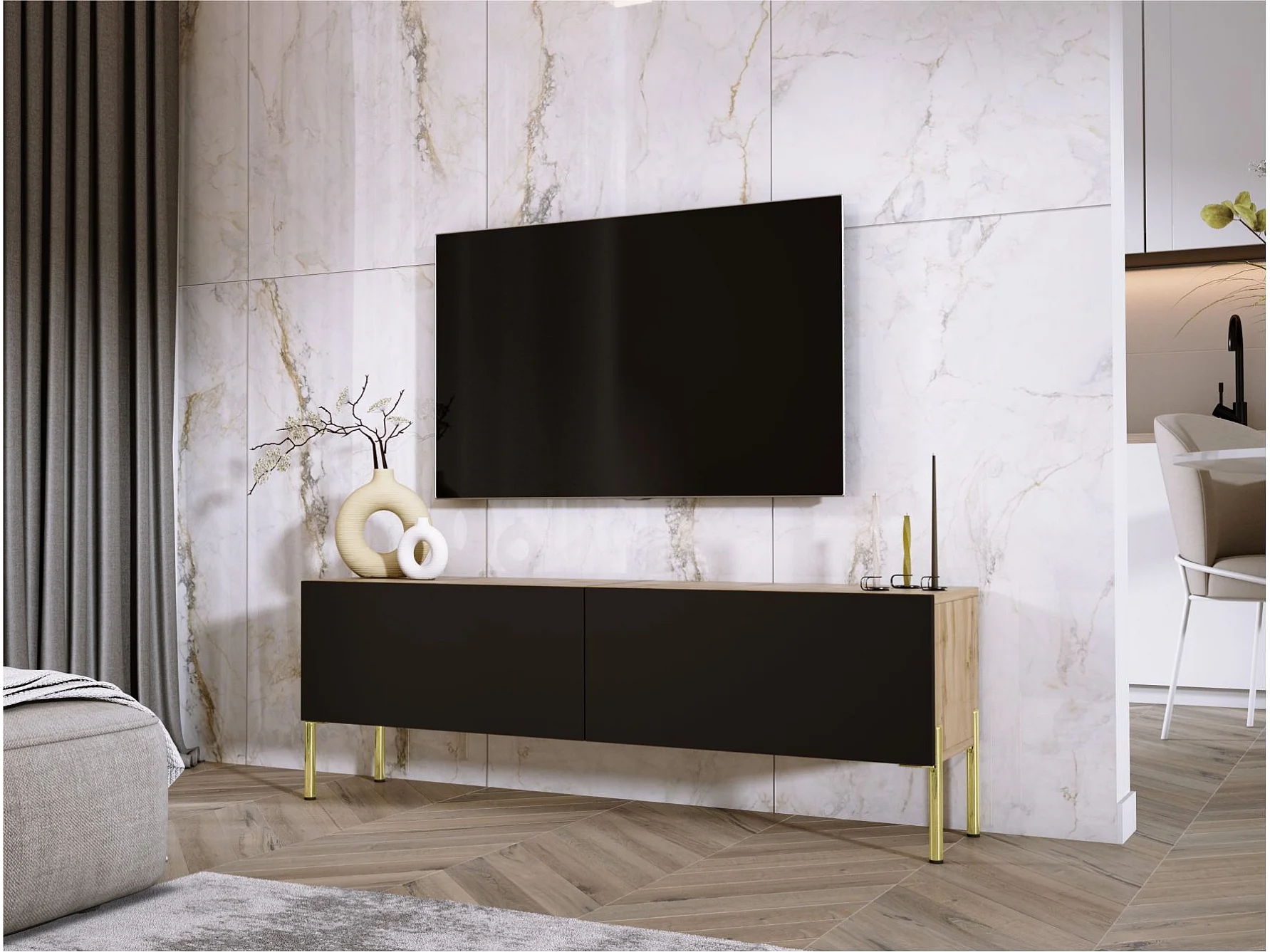 Meuble TV : Chêne Wotan / Noir Mat, pieds dorées, 140 x 52 x 32 cm