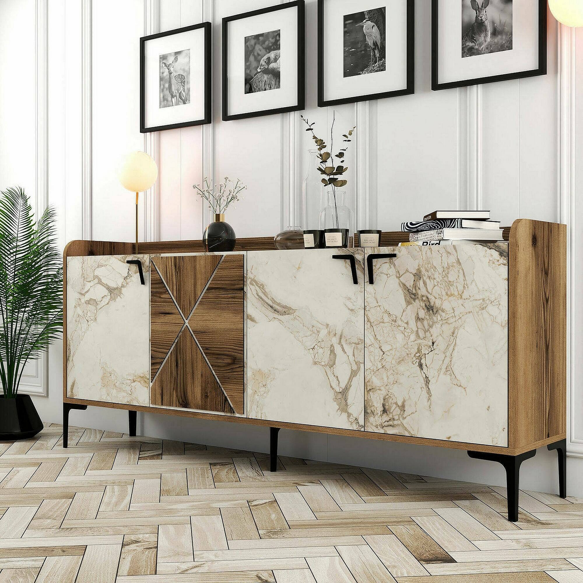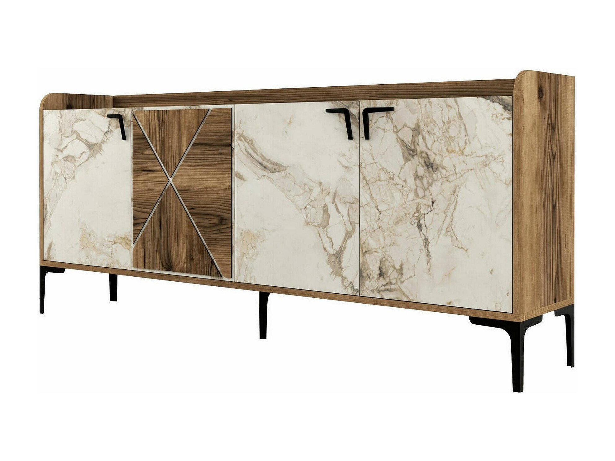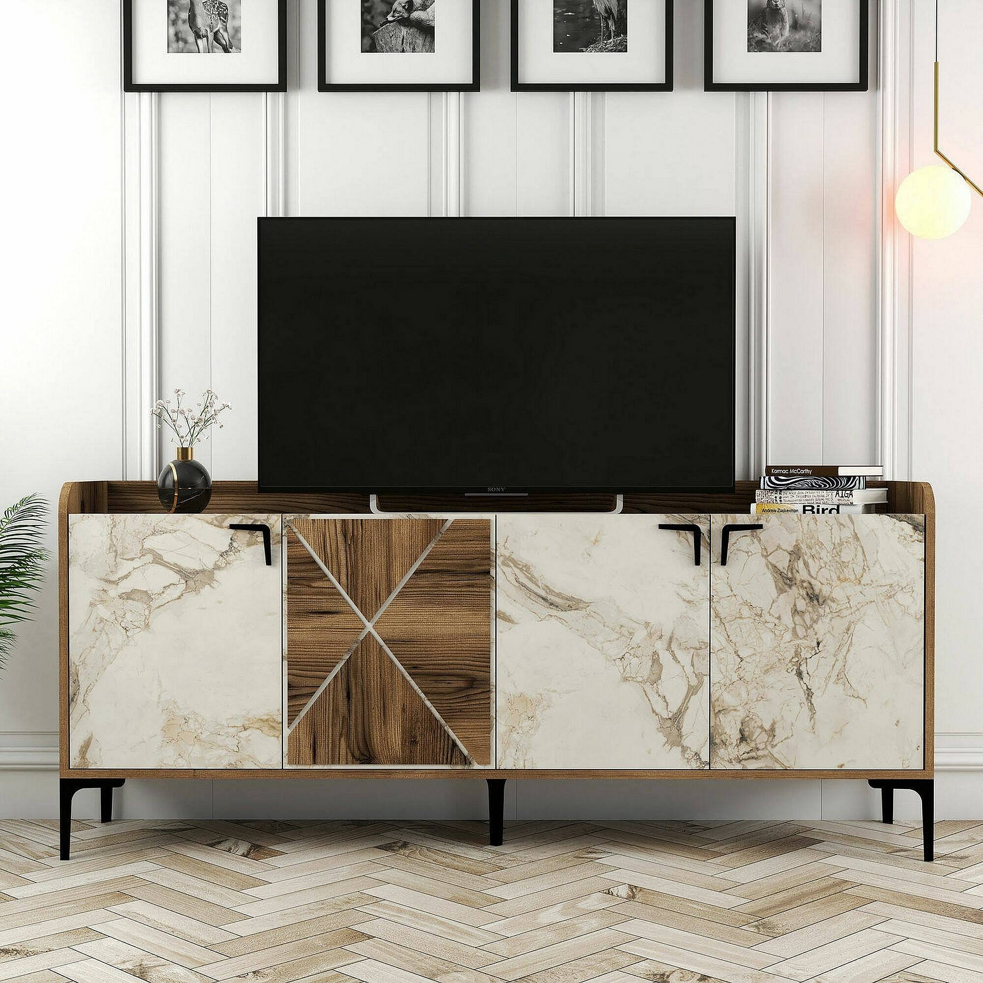 Meuble TV Deneb, Buffet de salon, Armoire basse pour TV, Base murale de rangement, 180x35 h78 cm, Noyer et Marbre Blanc