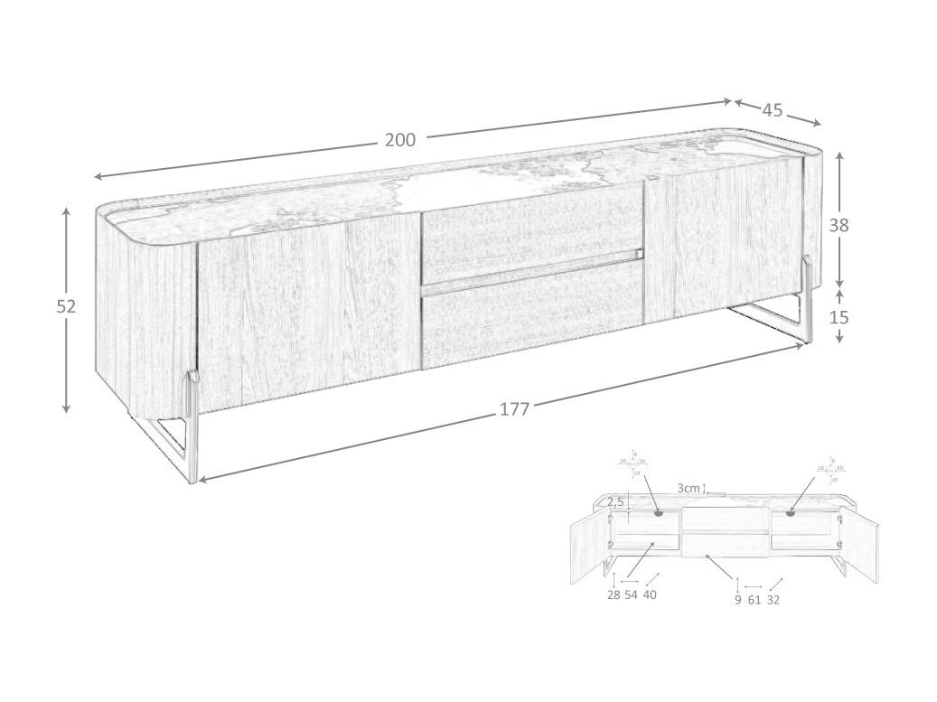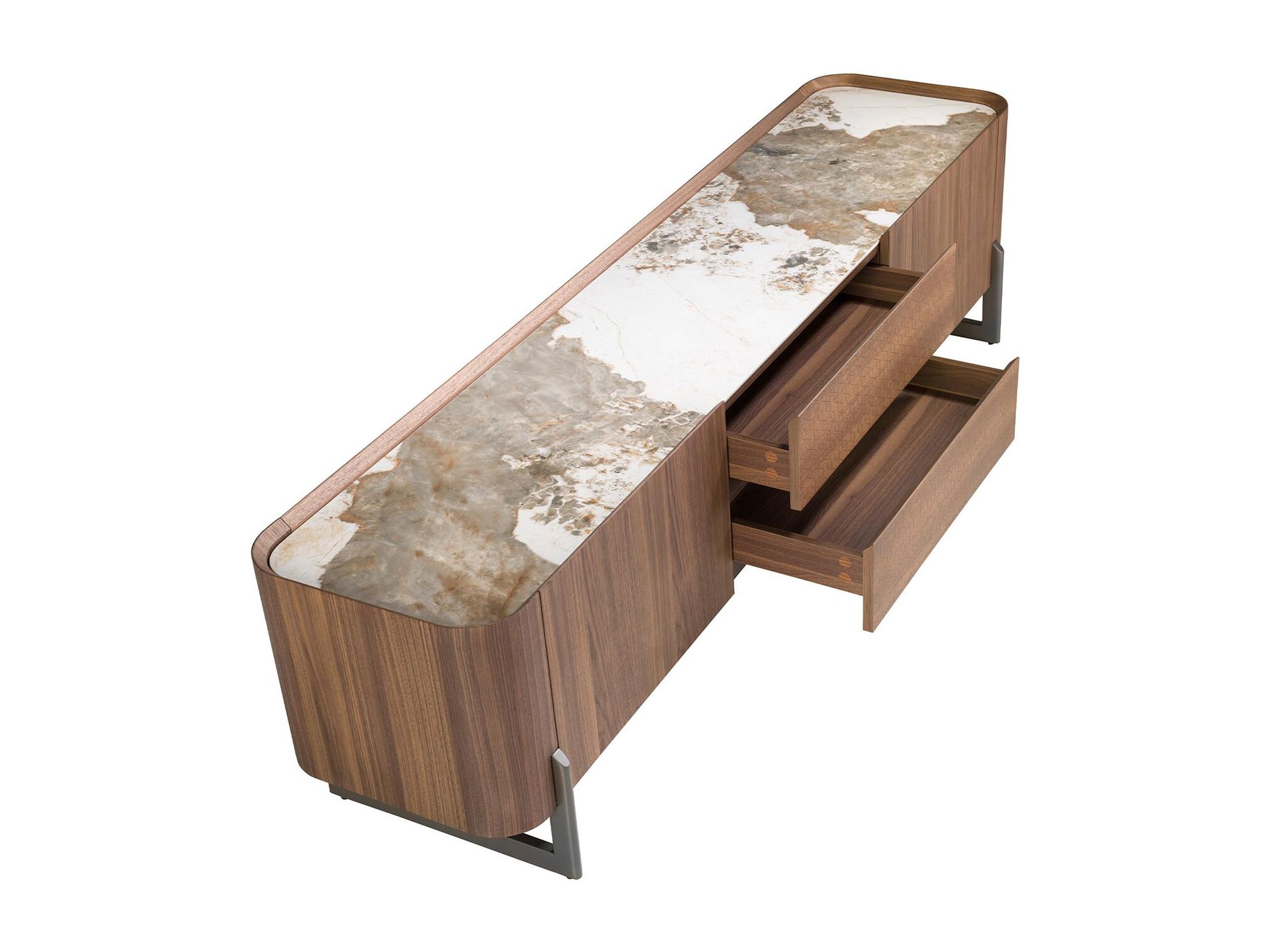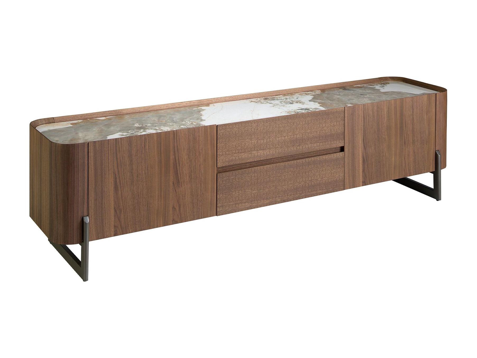 Meuble TV en noyer et acier métallisé foncé avec dessus en marbre de porcelaine