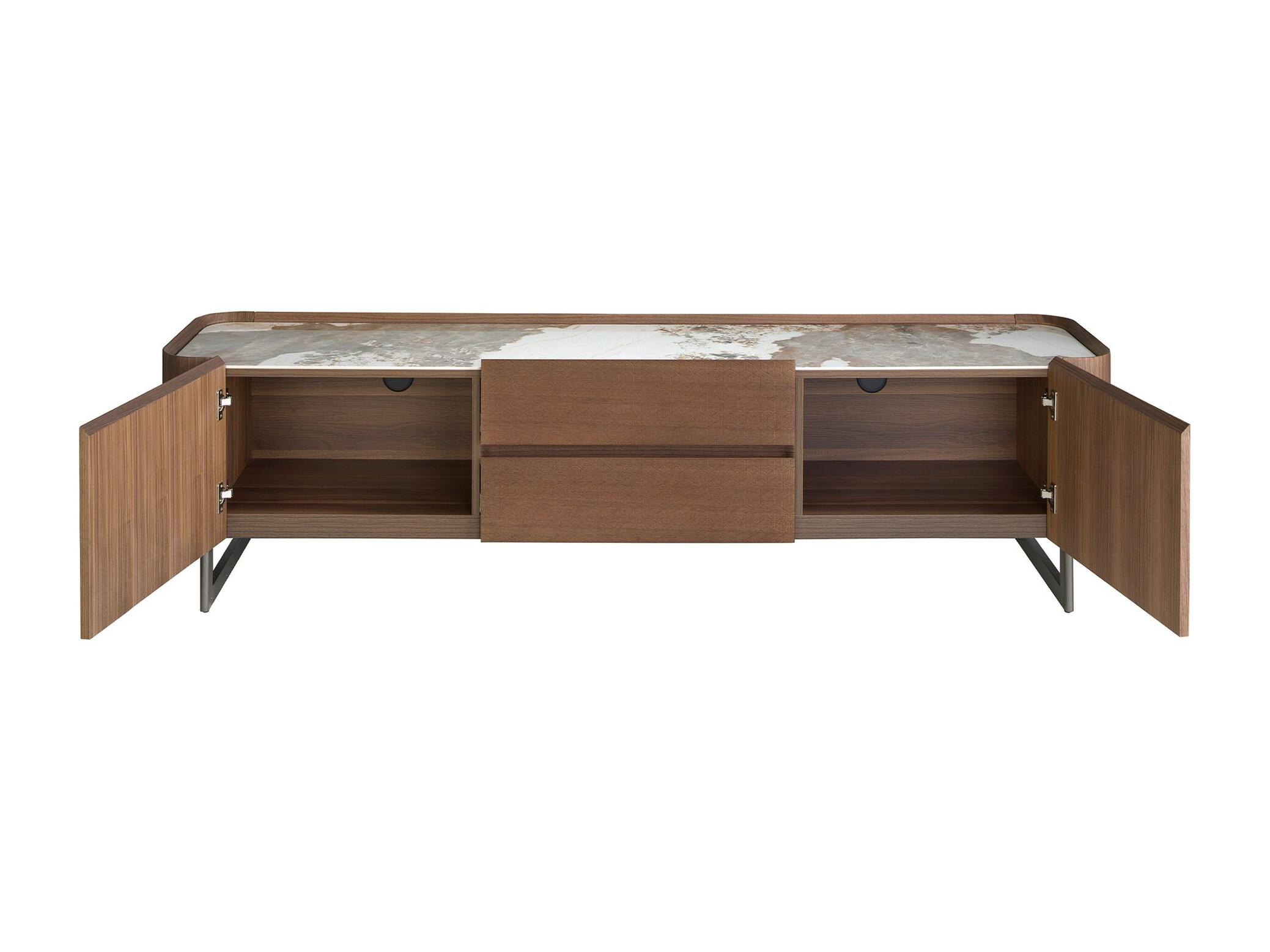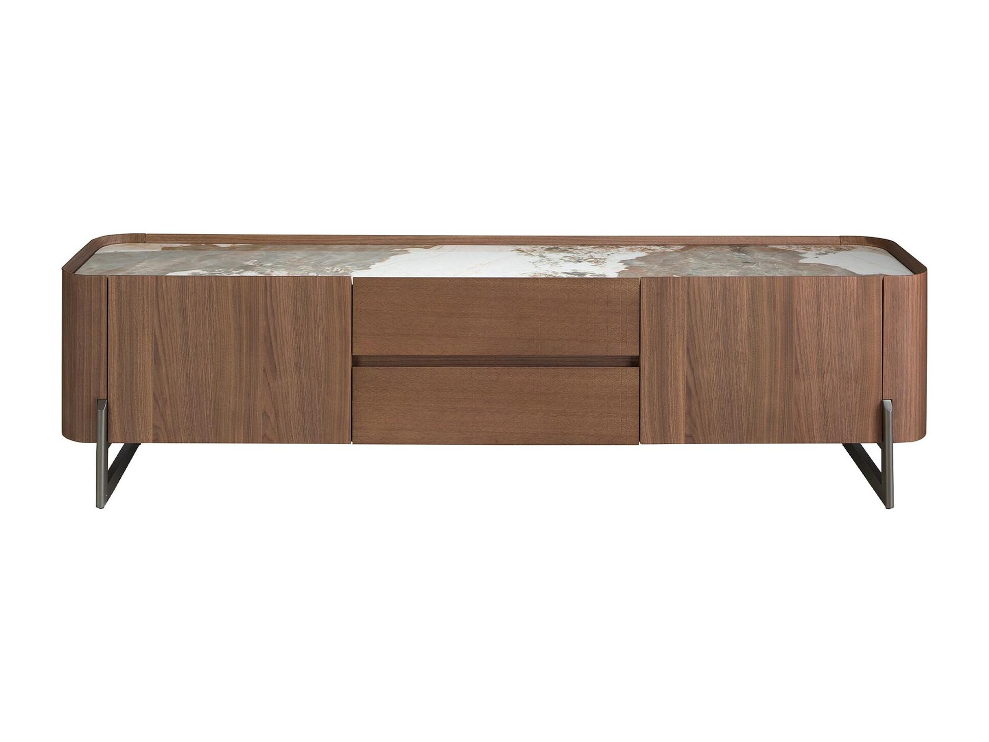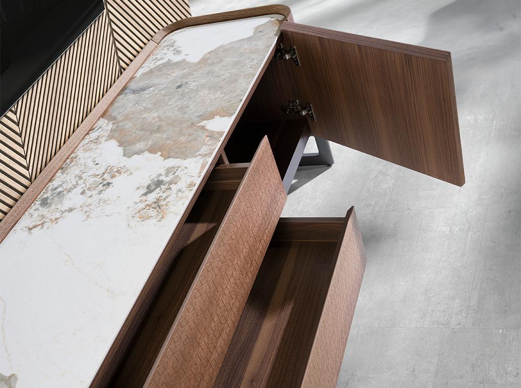 Meuble TV en noyer et acier métallisé foncé avec dessus en marbre de porcelaine