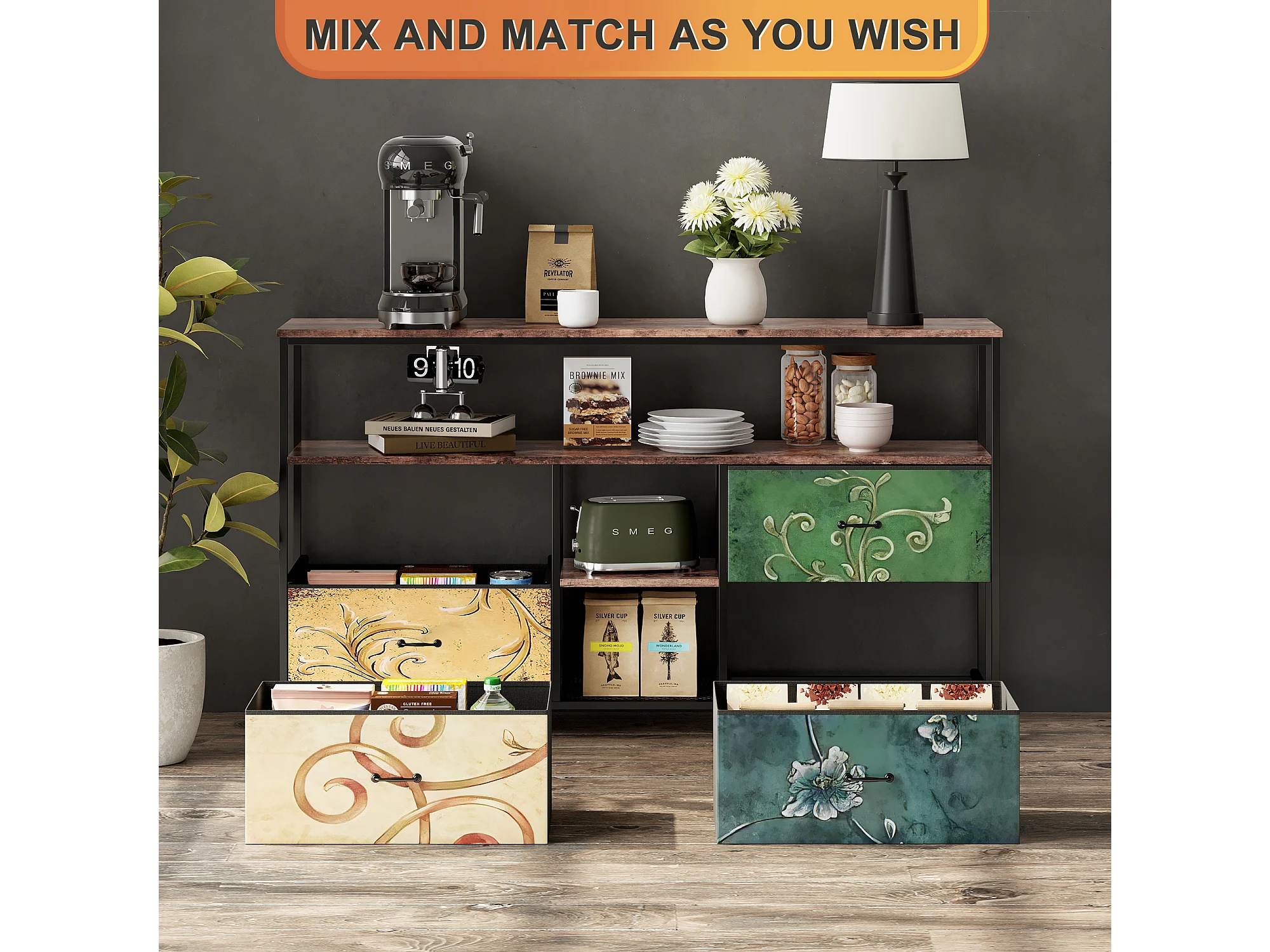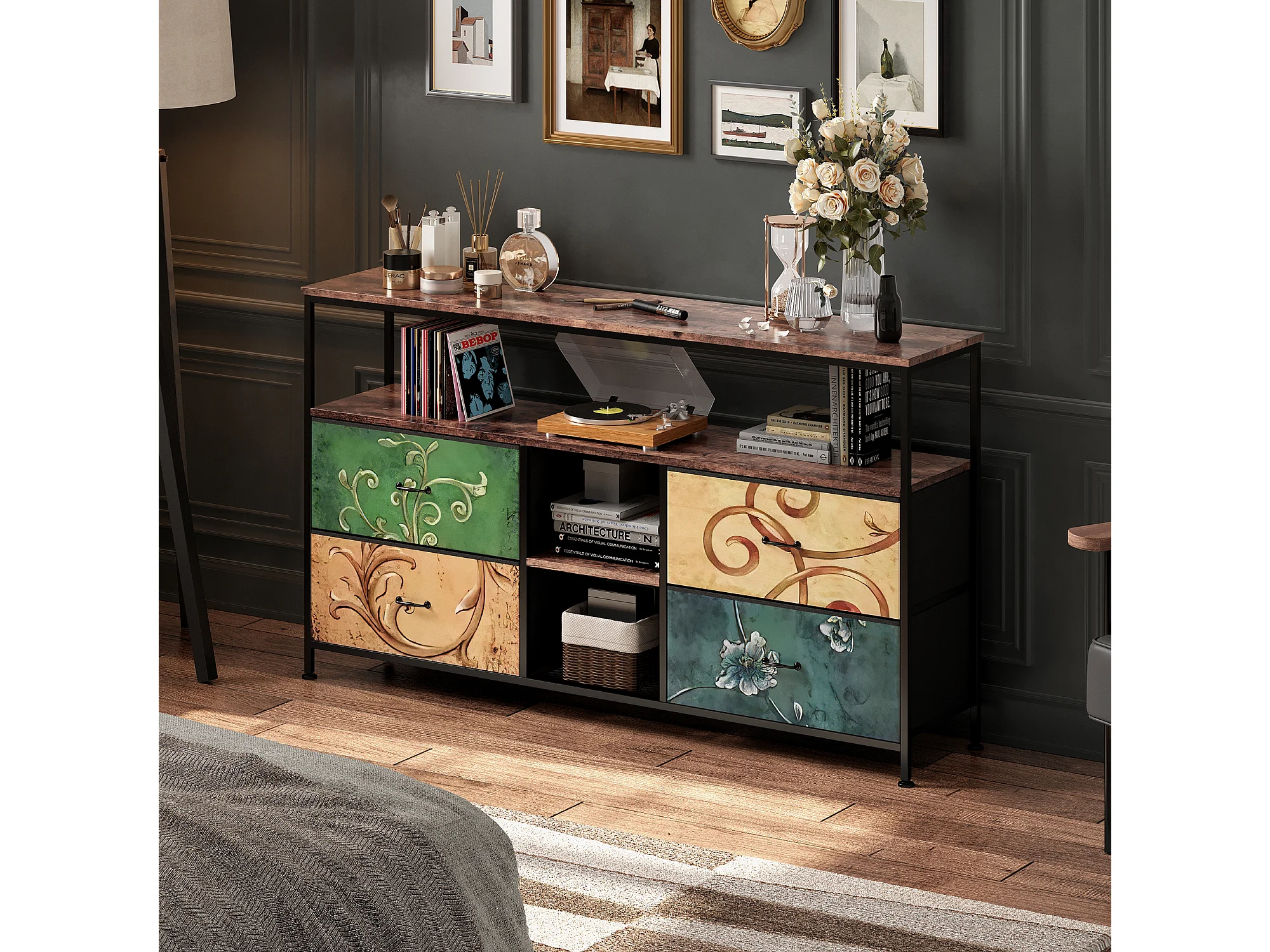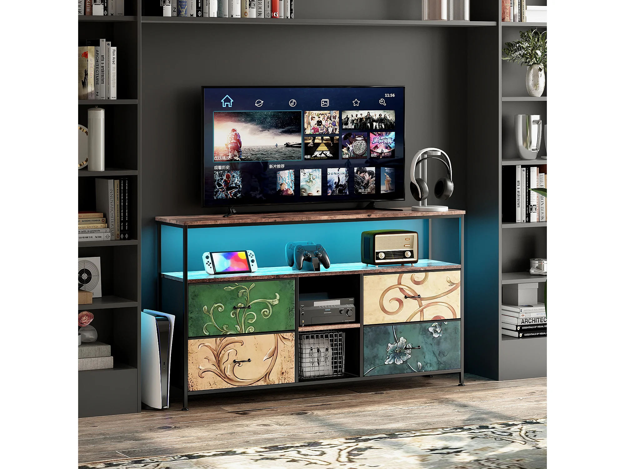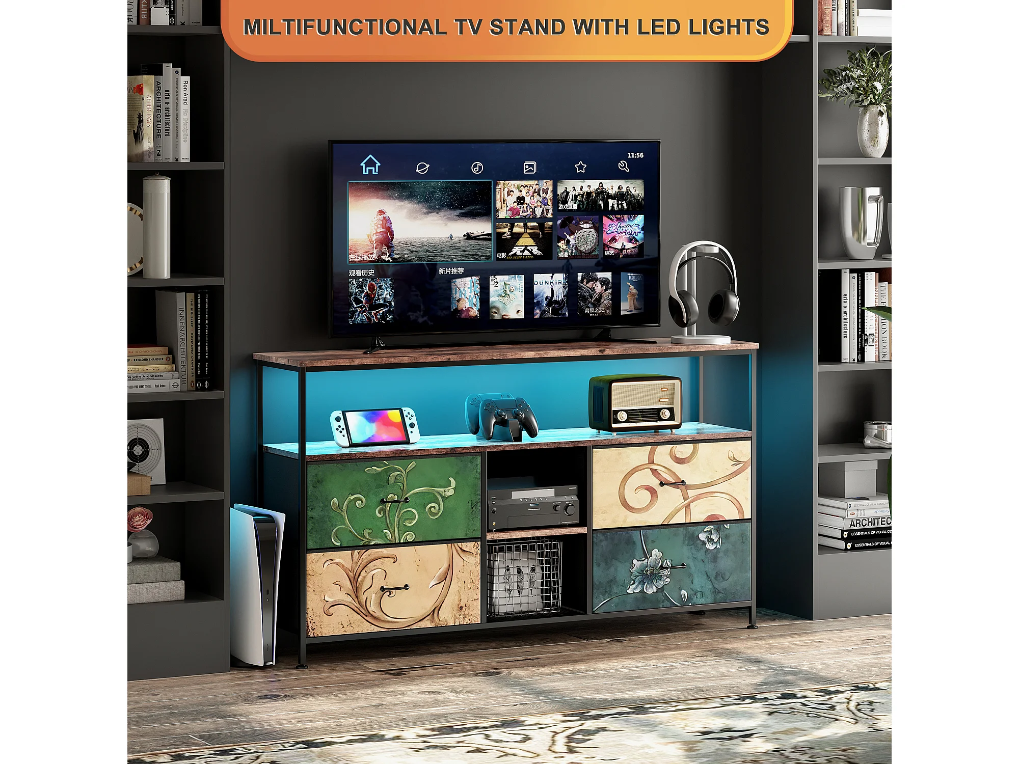 Meuble TV LED avec 4 Tiroirs, 108x30x78cm Banc TV Rétro Buffet, Tiroirs colorés