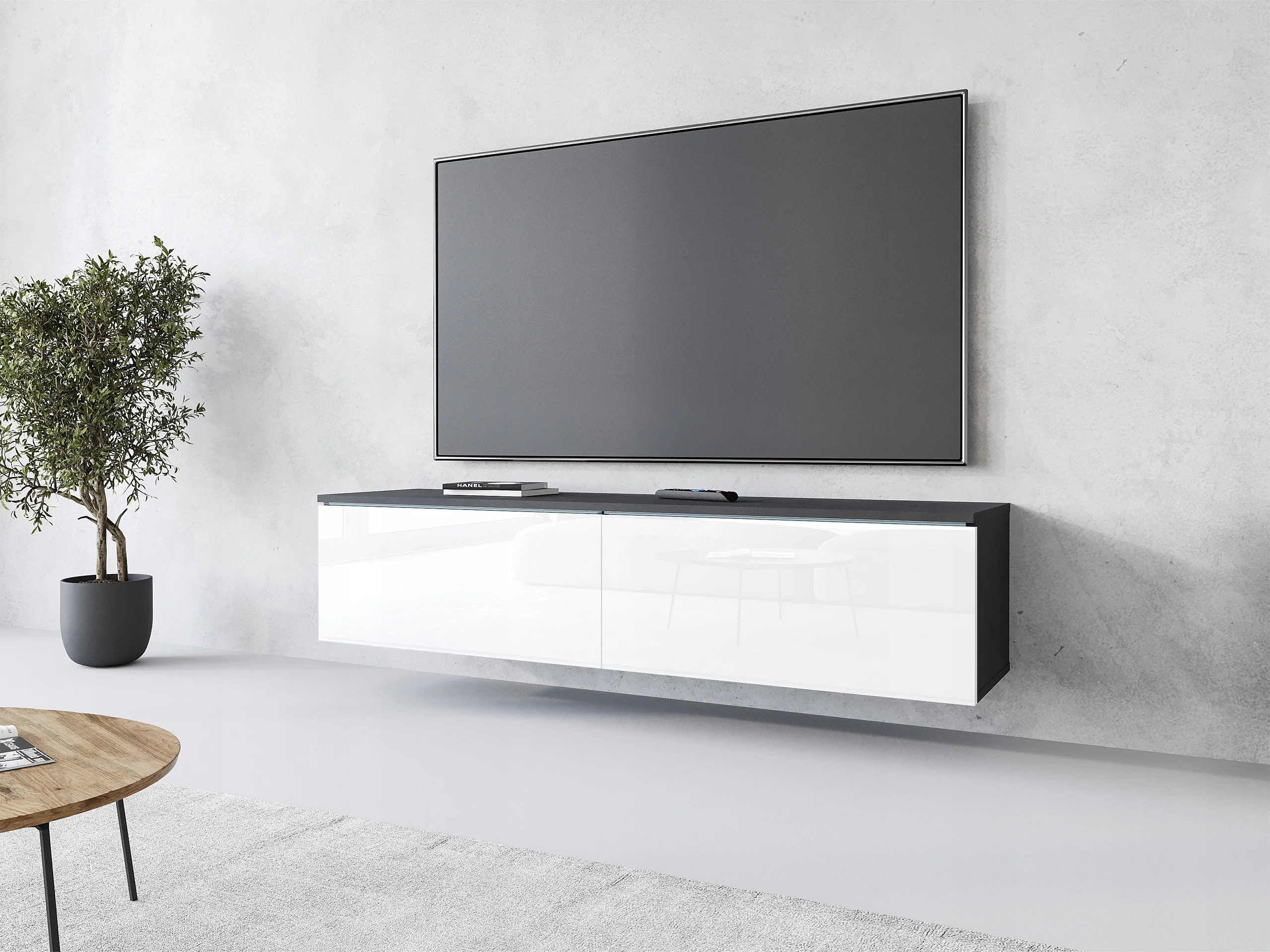 Meuble TV moderne 180 cm pour salon avec LED – 2 portes, sans poignées, caisson anthracite, façades châtaignier mat, à poser ou à suspendre