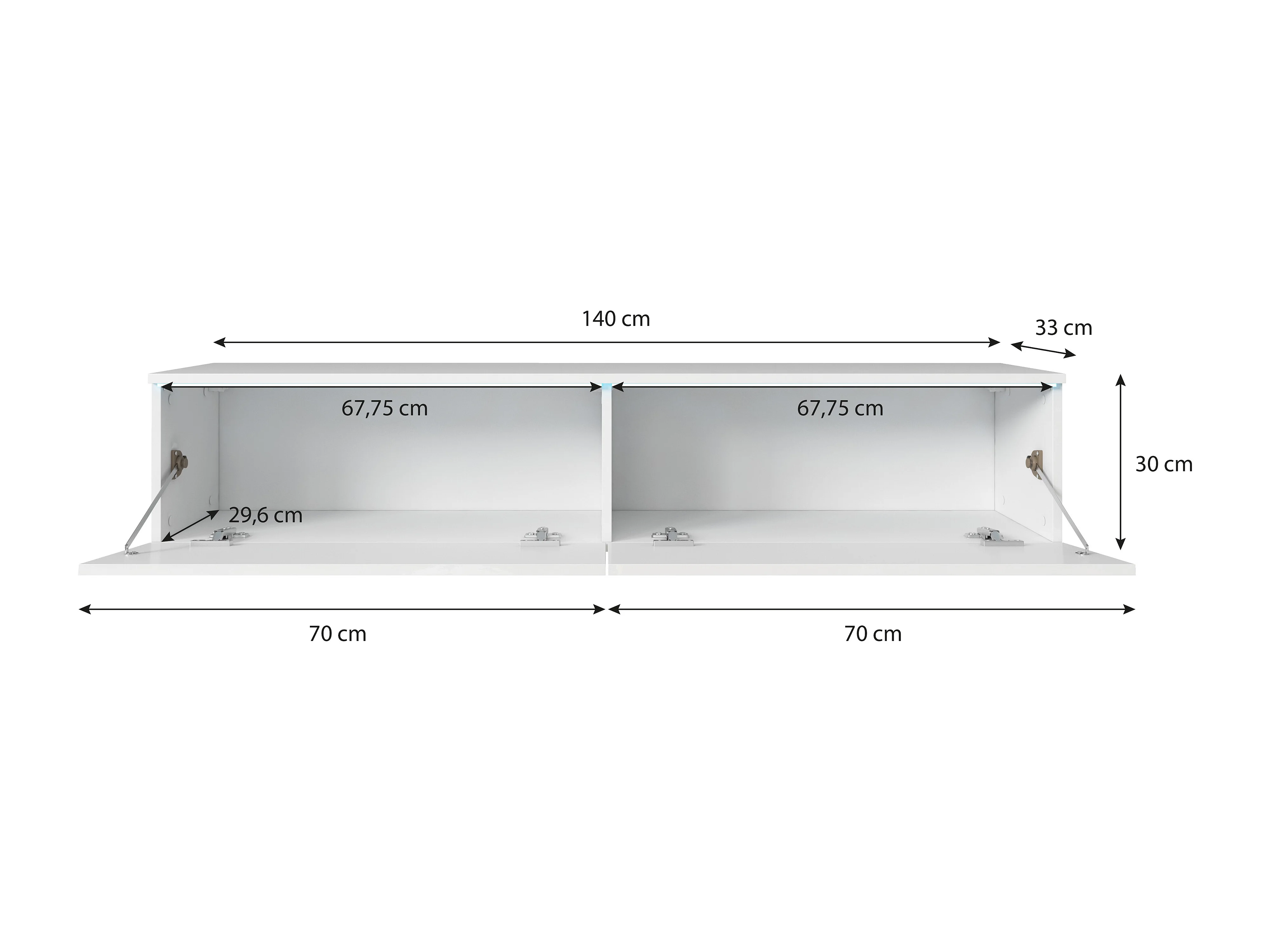 Meuble TV moderne 140 cm avec LED 2 portes, sans poignées, caisson matera, façades blanc brillant, posé ou suspendu