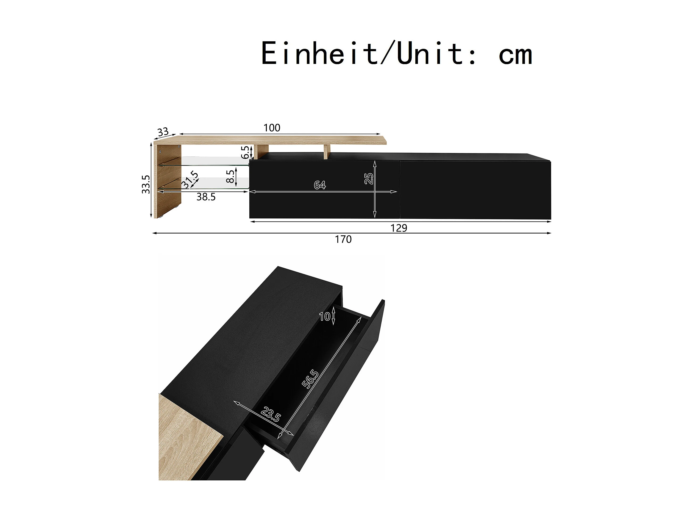 Armoire TV Noir avec tiroirs, buffet TV avec LED et étagères en verre, meuble TV pour salon