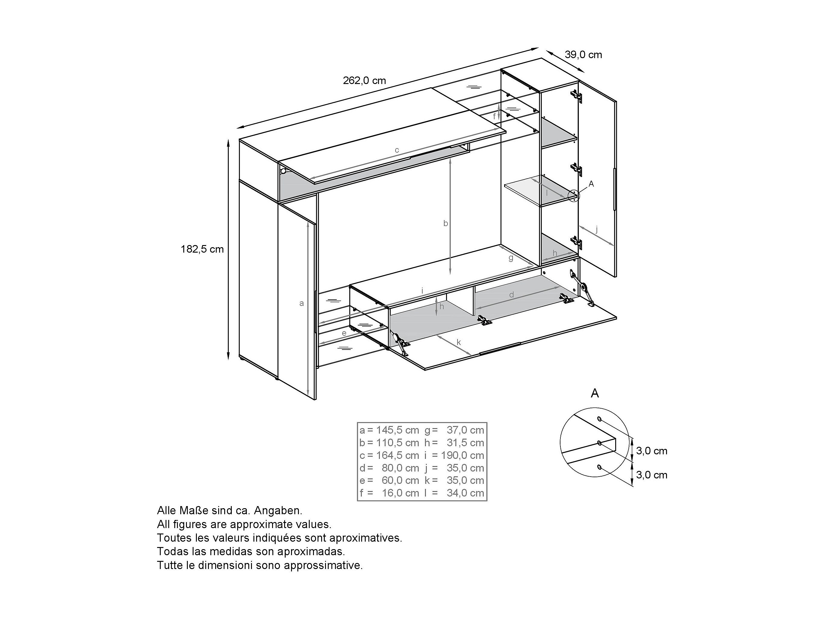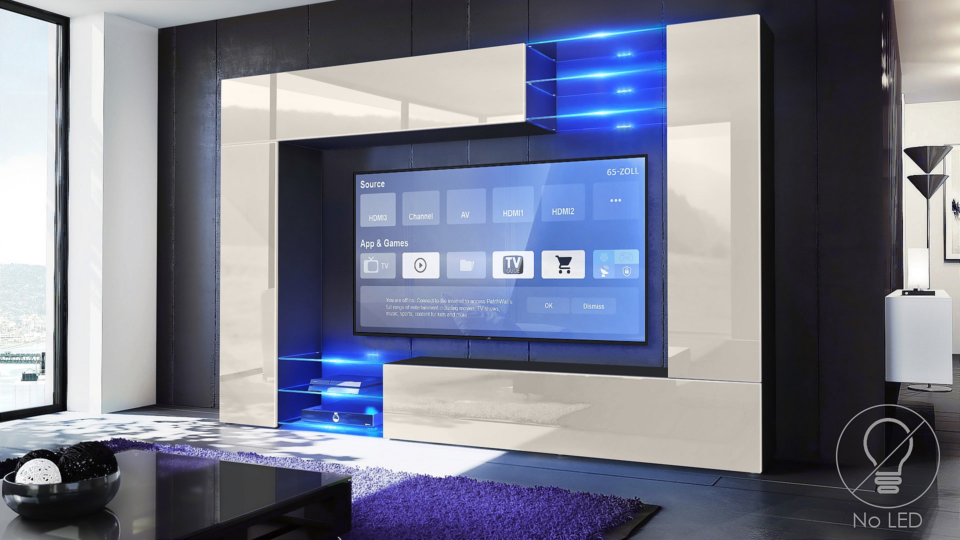 Meuble TV mural Mirage, Ensemble étagère TV avec panneau arrière et 2 portes, 2 clapets et 6 étagères en verre, Noir mat/Crème brillant (262 x 183 x 39 cm)