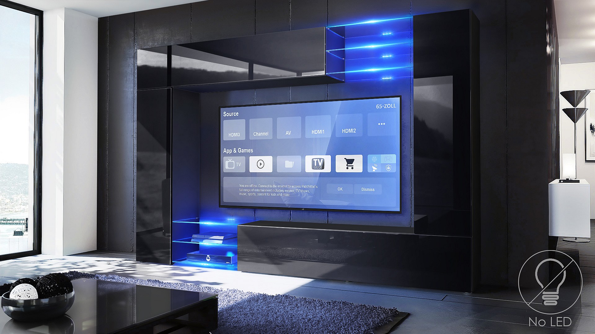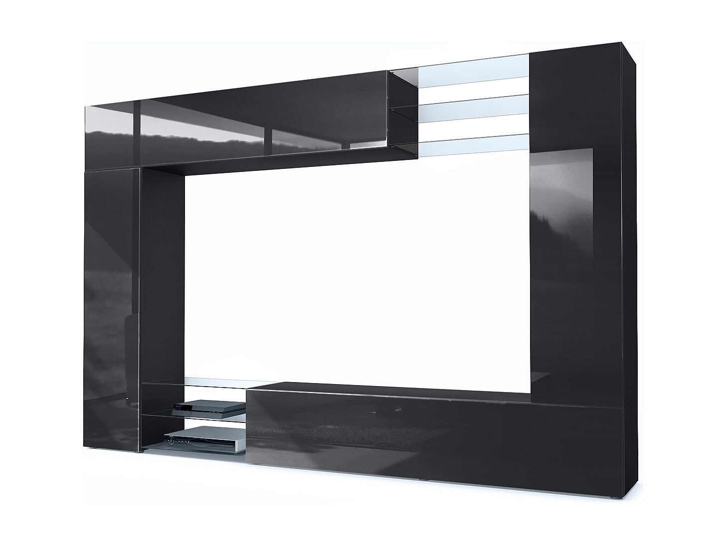 Meuble TV mural Mirage, Ensemble étagère TV avec panneau arrière et 2 portes, 2 clapets et 6 étagères en verre, Noir mat/Noir brillant (262 x 183 x 39 cm)