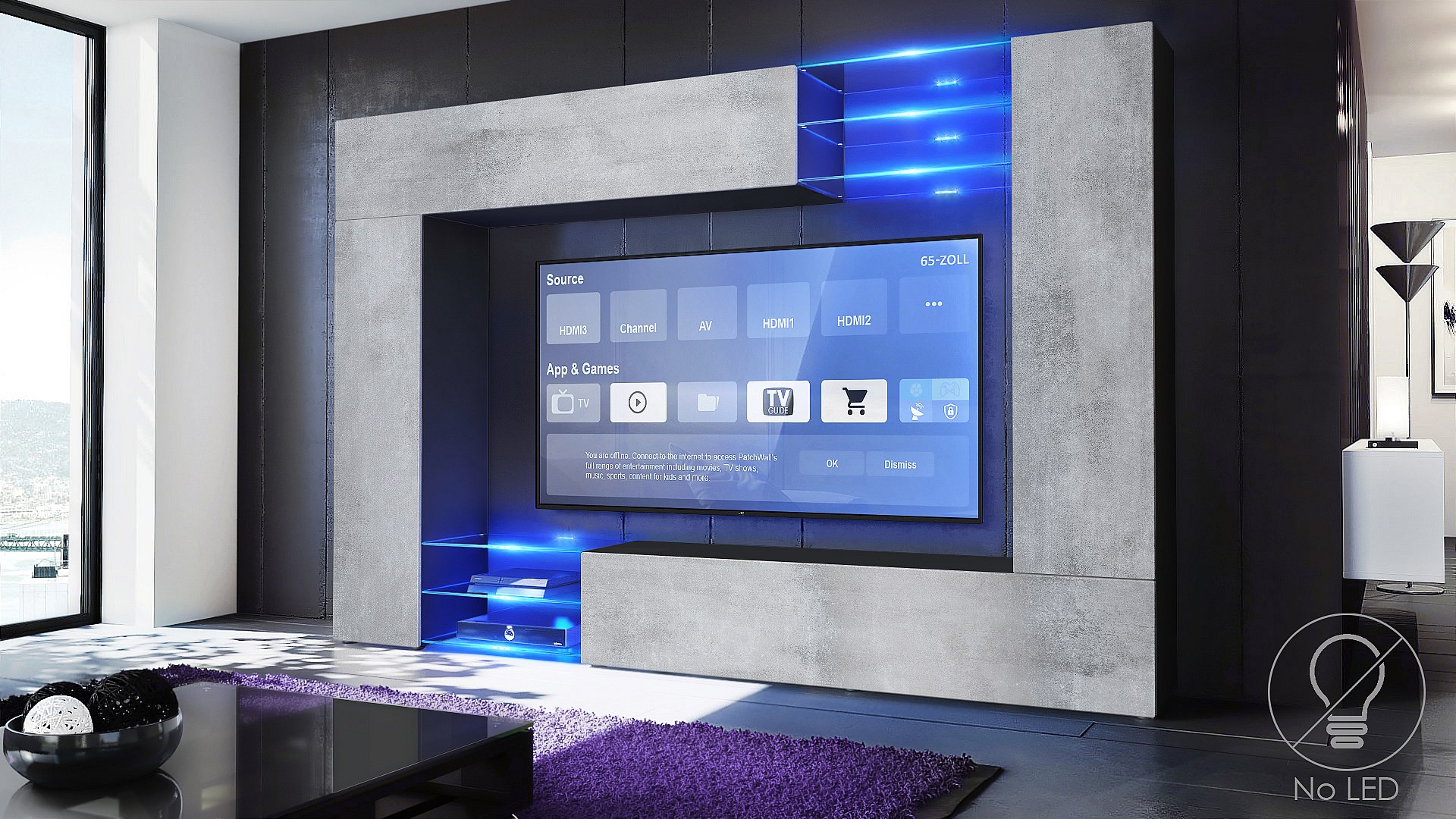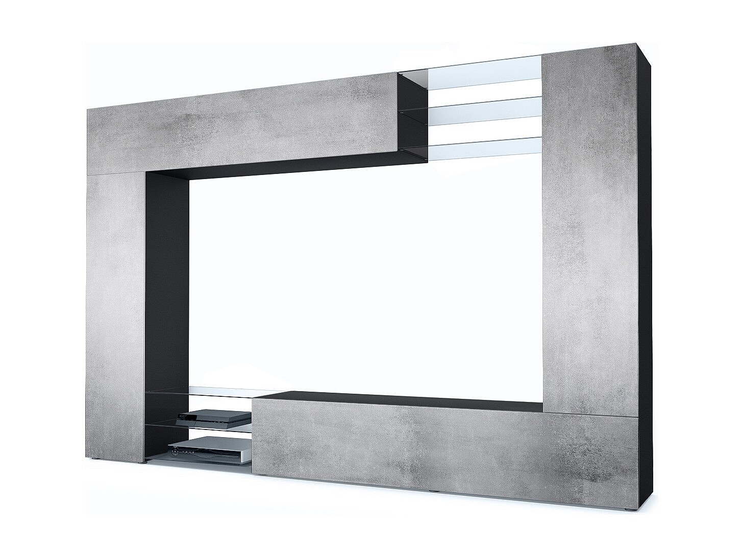 Meuble TV mural Mirage, Ensemble étagère TV et 2 portes, 2 clapets et 6 étagères en verre, Noir mat/Aspect Béton Oxyde (262 x 183 x 39 cm)