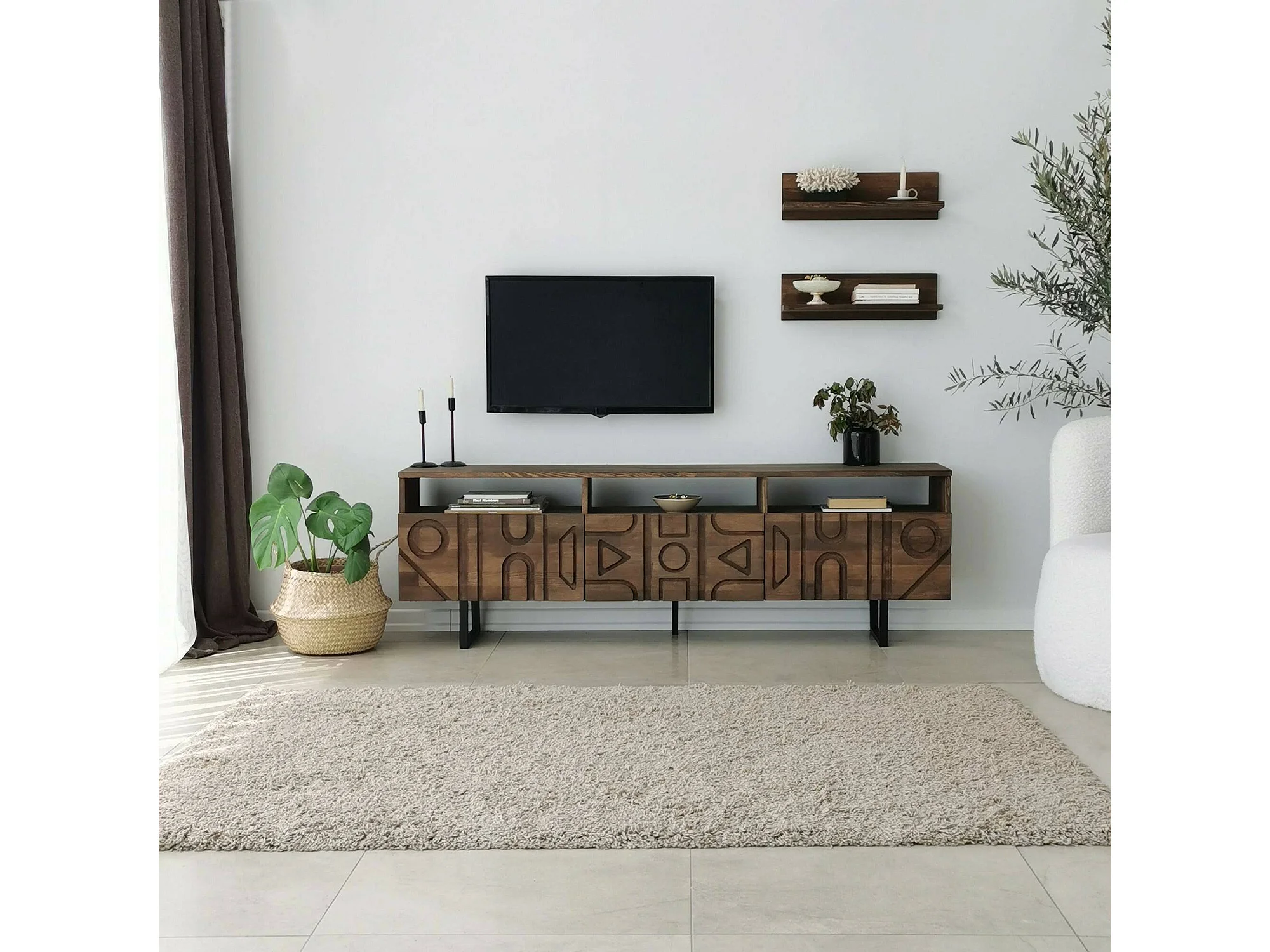 Meuble TV Novastra, Buffet de salon, Armoire basse pour TV, Base murale de rangement, 170x30h40 cm, Noyer