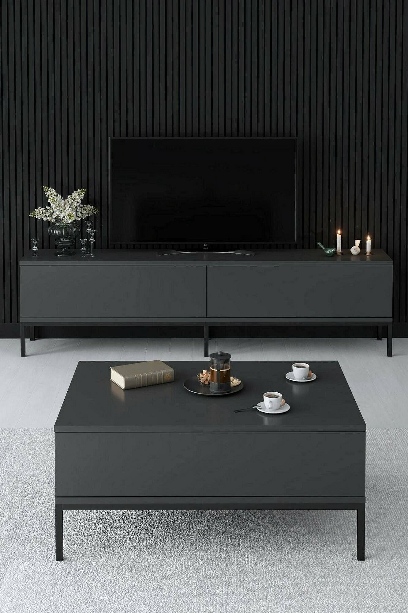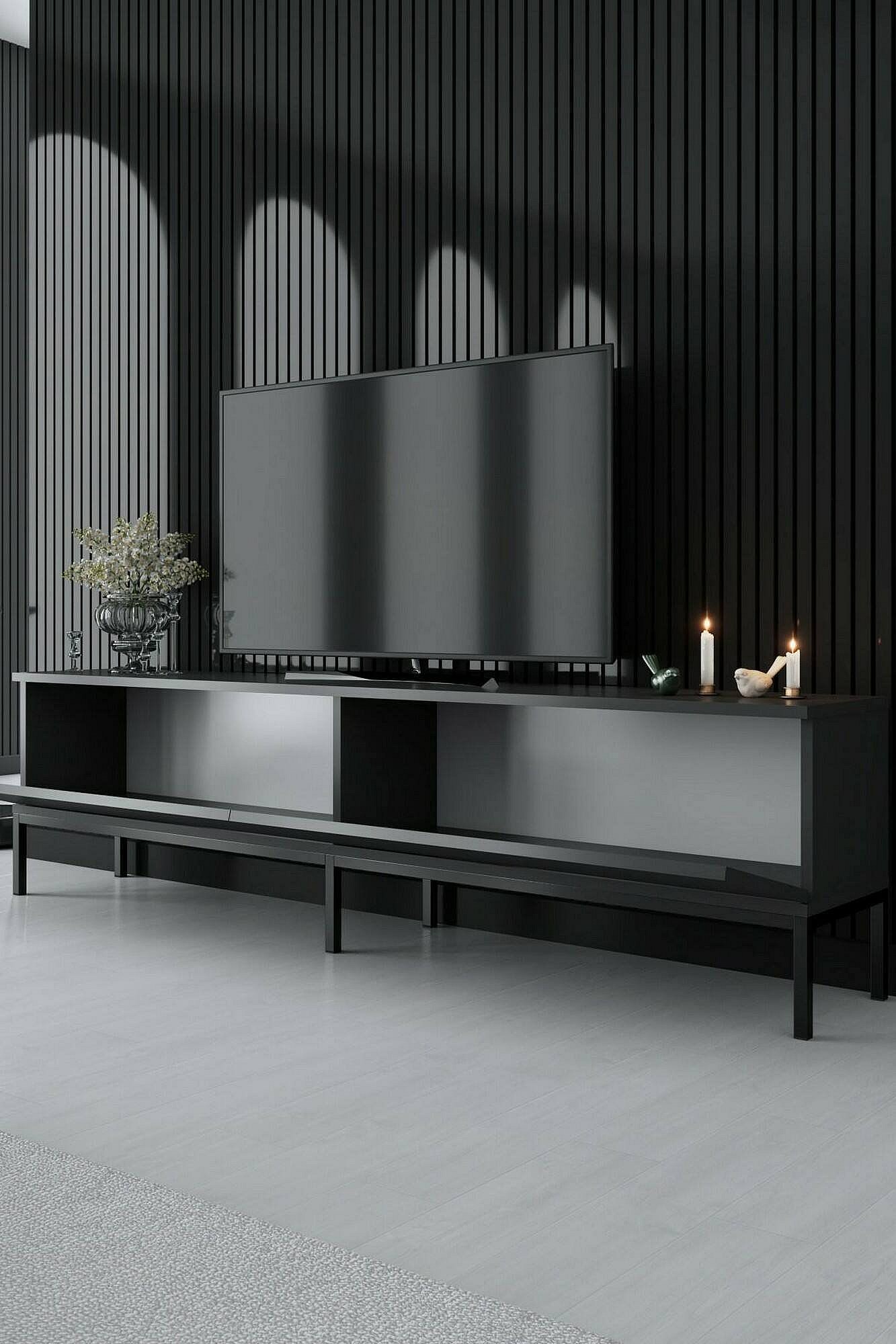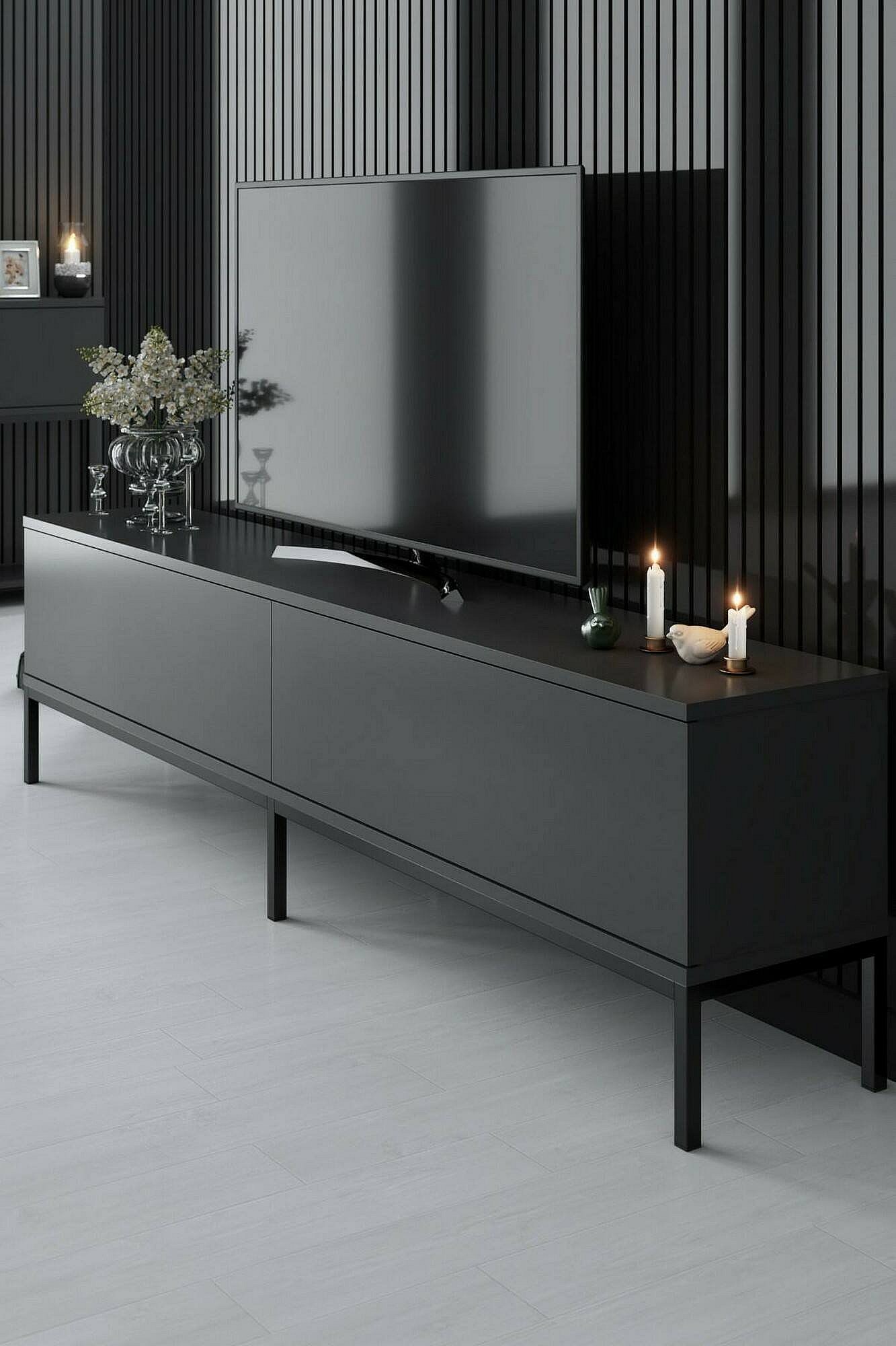 Meuble TV Regulus, Buffet de salon, Armoire basse pour TV, Base murale de rangement, 180x30h47 cm, Anthracite et Noir