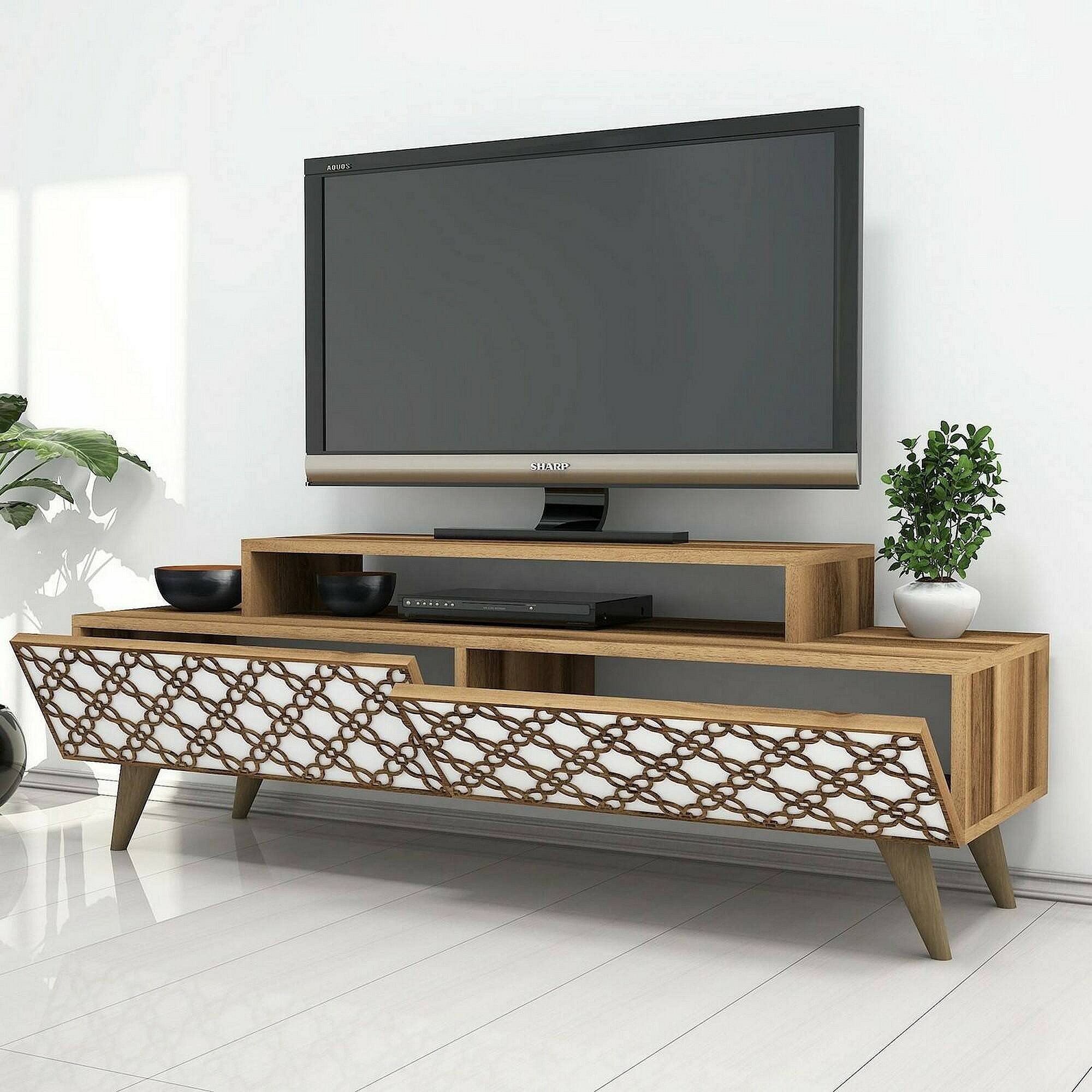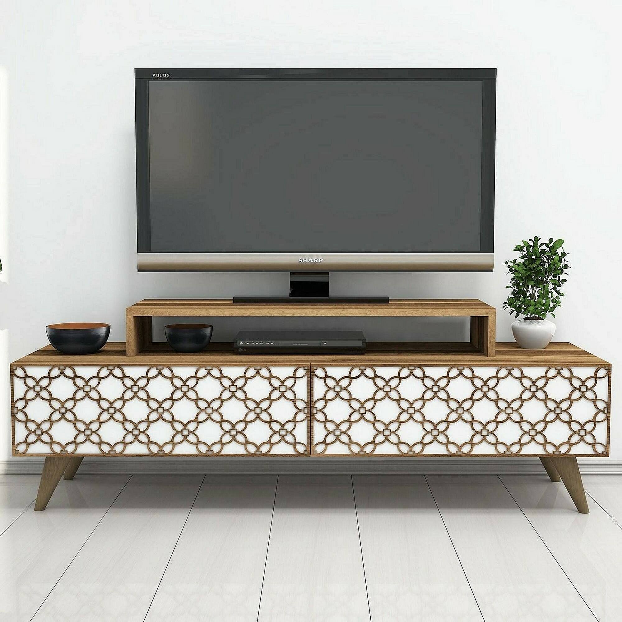 Meuble TV Sheratan, Buffet de salon, Armoire basse pour TV, Base murale de rangement, 140x42h49 cm, Noyer et Blanc