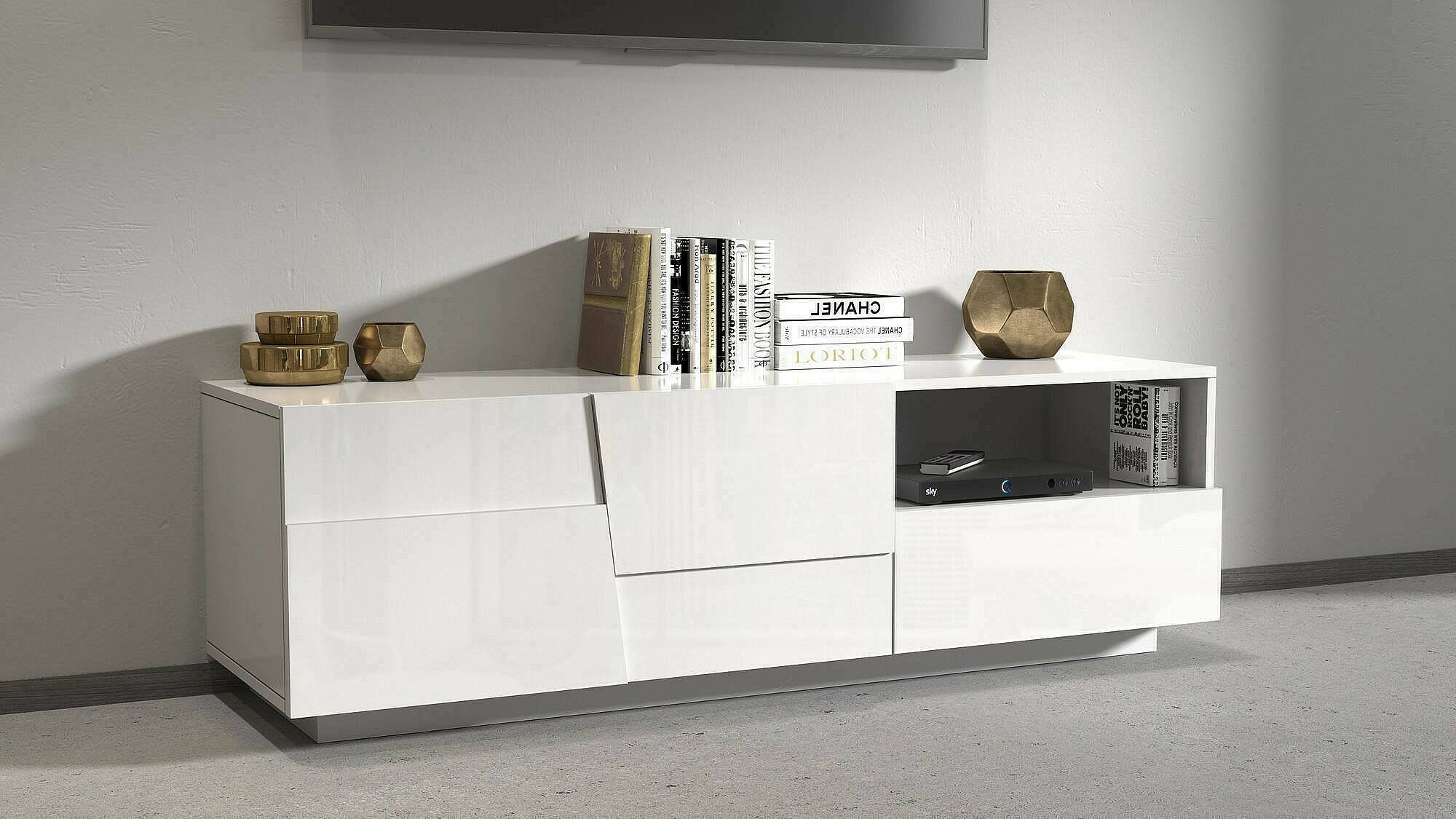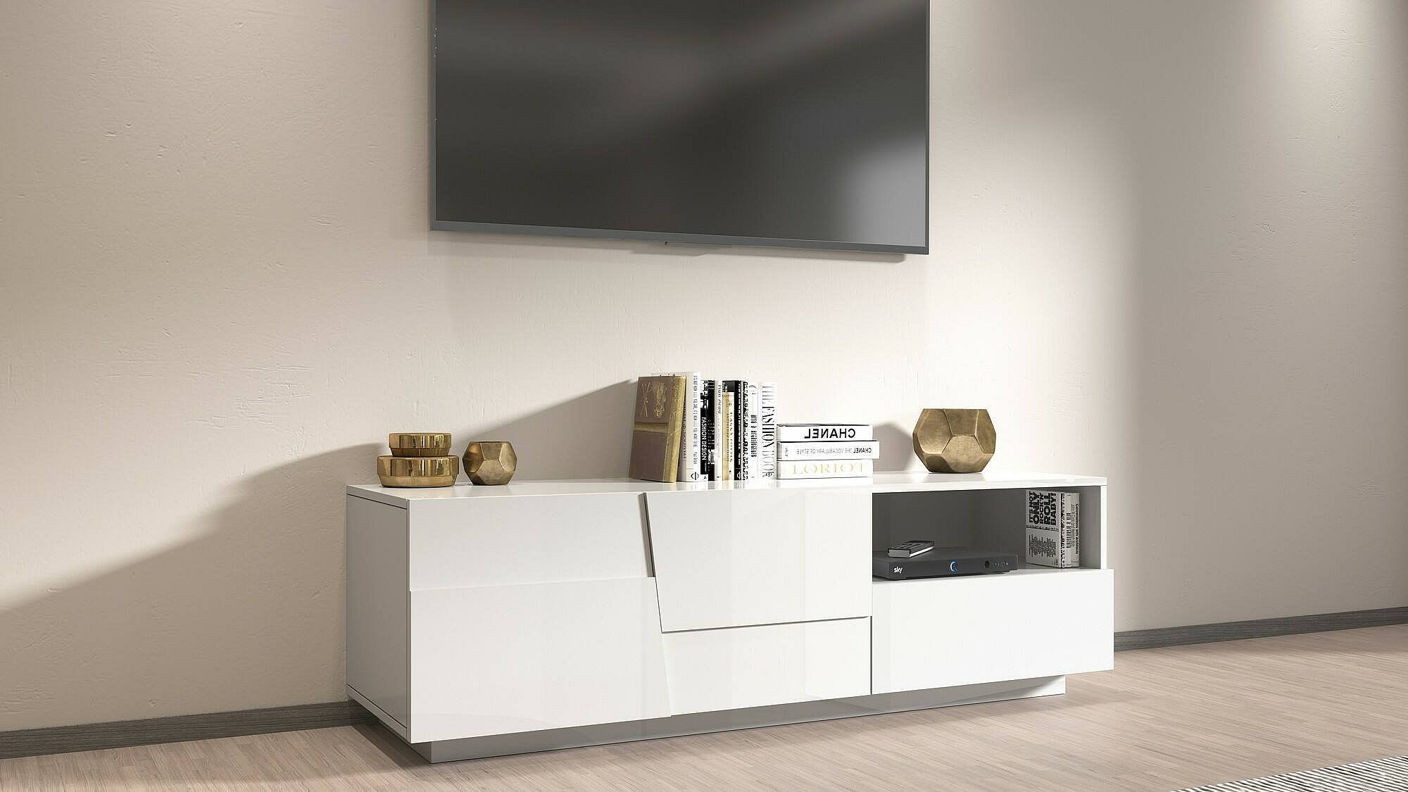 Meuble TV Velio, Buffet bas de salon avec 2 portes et 1 tiroir, Base meuble TV, 150x44h46 cm, Blanc brillant