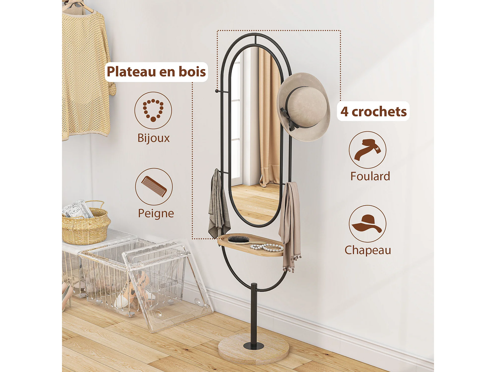 Miroir étagère design H.175 cm - miroir sur pied - tablette, 4 patères - métal noir bois hévéa verni naturel