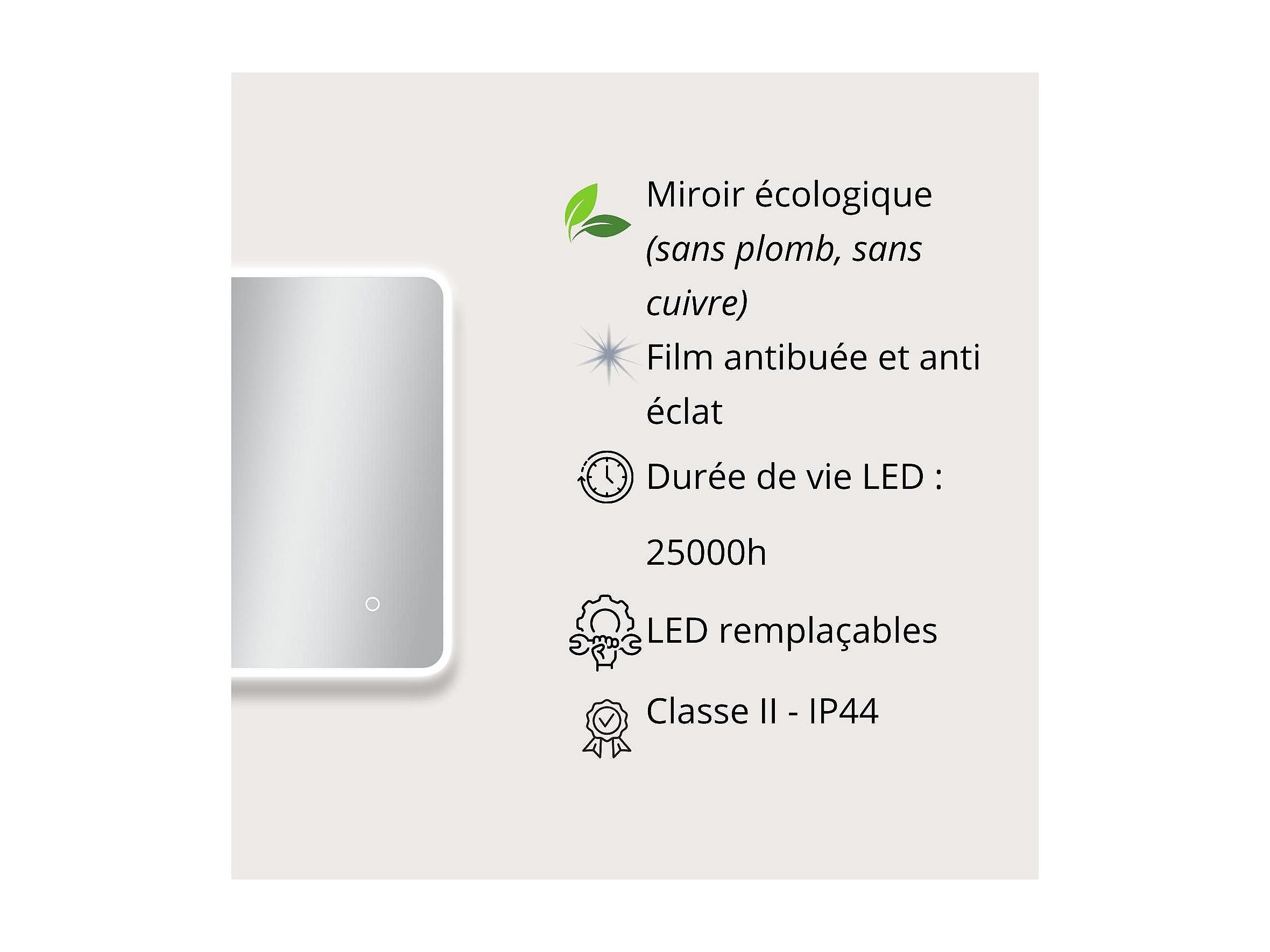Miroir LED rectangulaire L60/80/90/120cm avec cadre rétro-éclairé