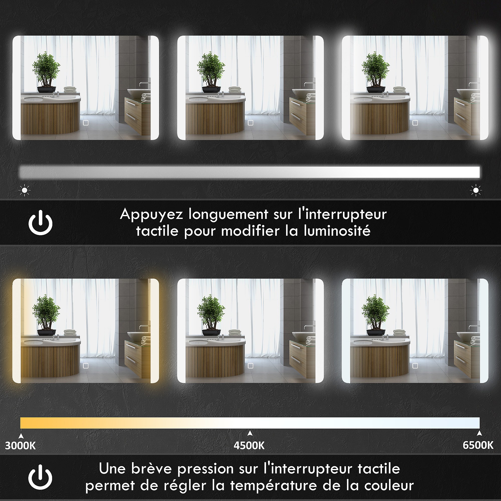 Miroir LED mural de salle de bain - 50L x 70H cm - luminosité réglable 3 couleurs - interrupteur tactile - système antibué