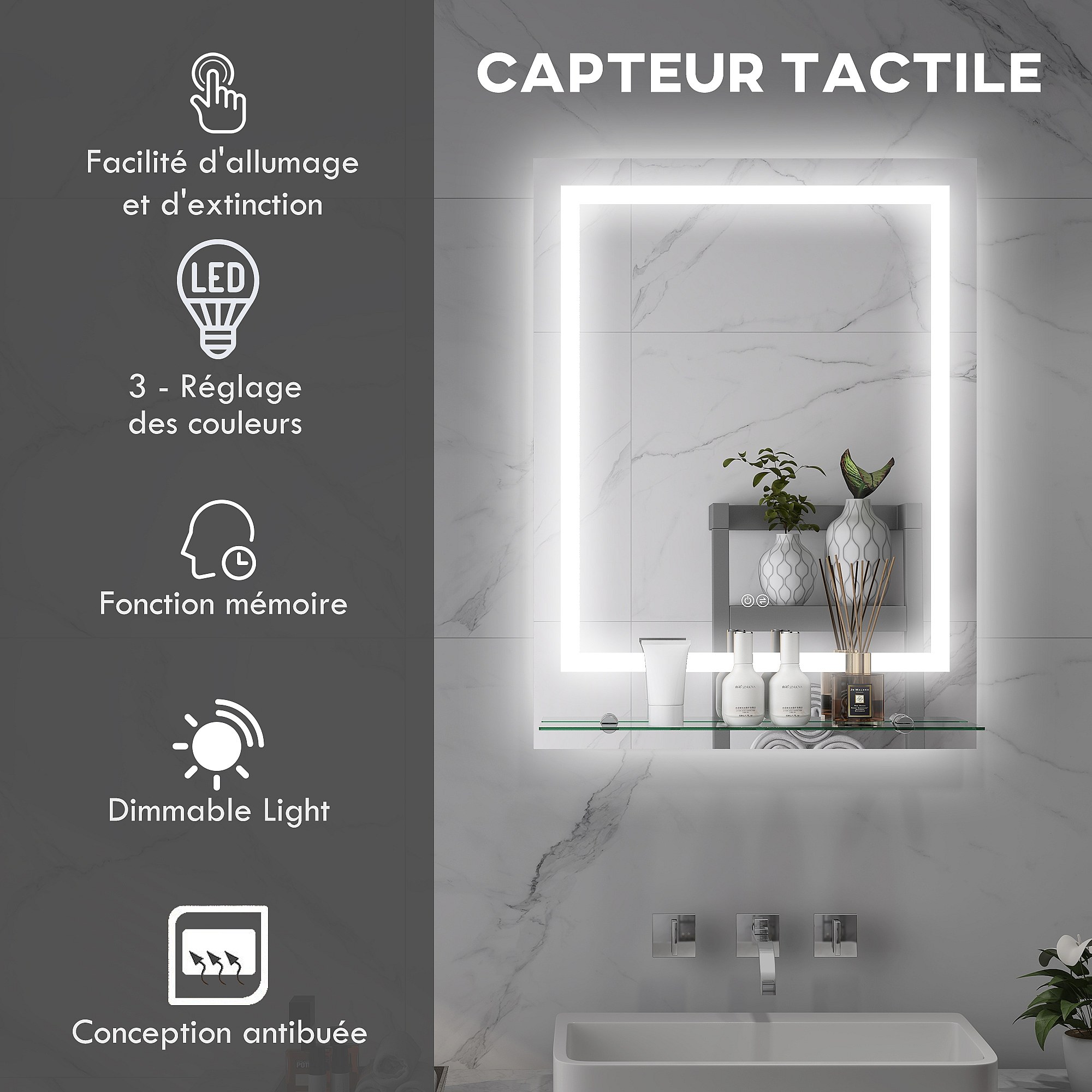 Miroir lumineux LED 20 W interrupteur tactile étagère intégrée 50L x 12l x 70H cm