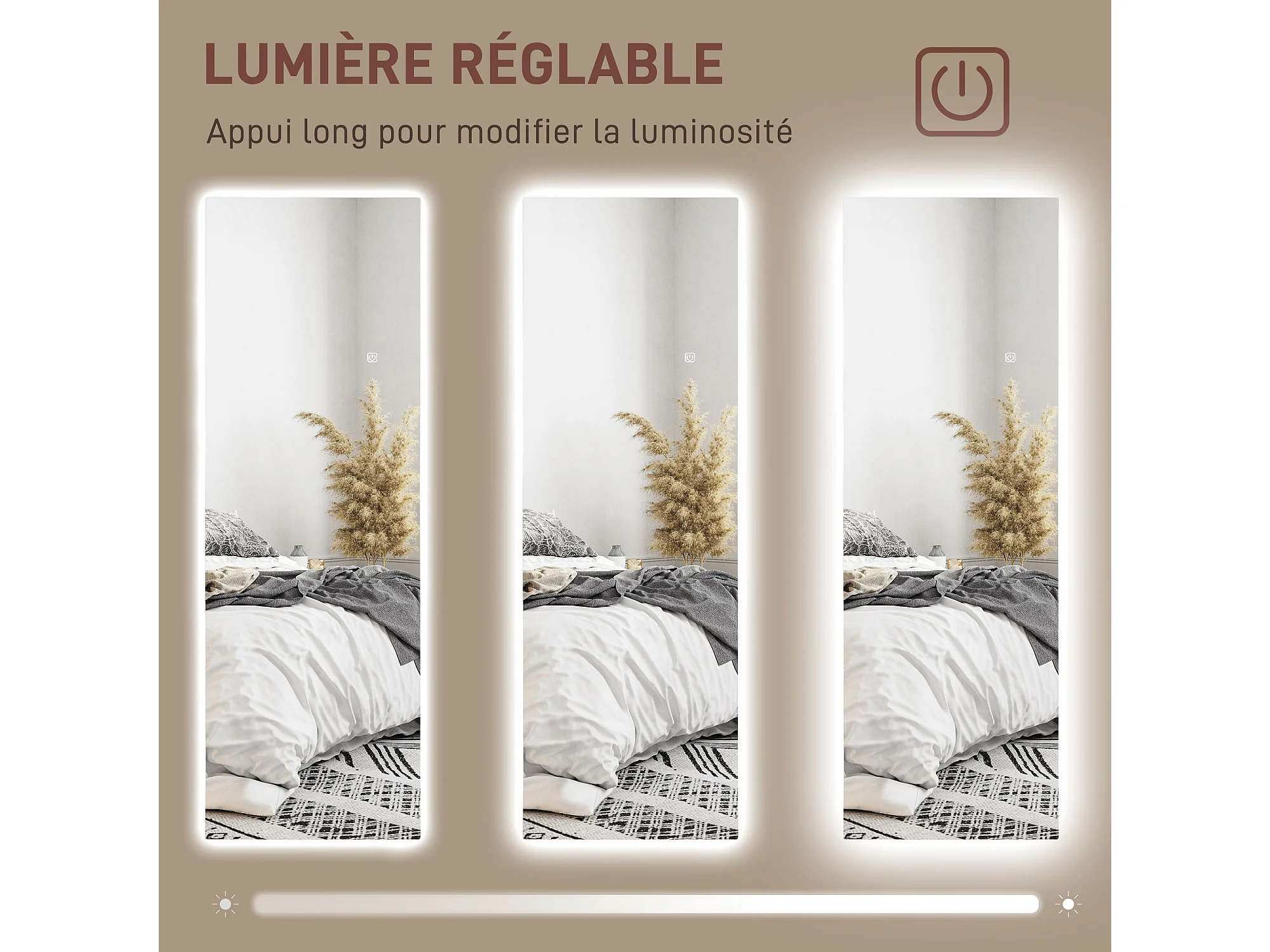 Miroir mural LED pleine longueur dim. 40L x 120H cm - miroir LED réglable tactile - verre trempé