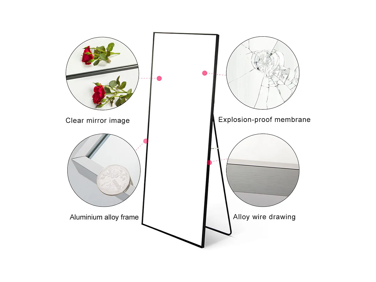 Miroir sur Pied 165x60 cm, Cadre Aluminium Noir, Miroir Mural Moderne à Poser ou Suspendre