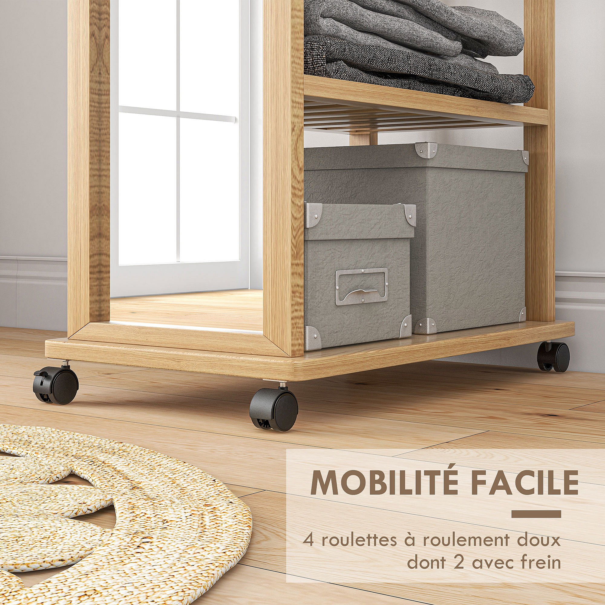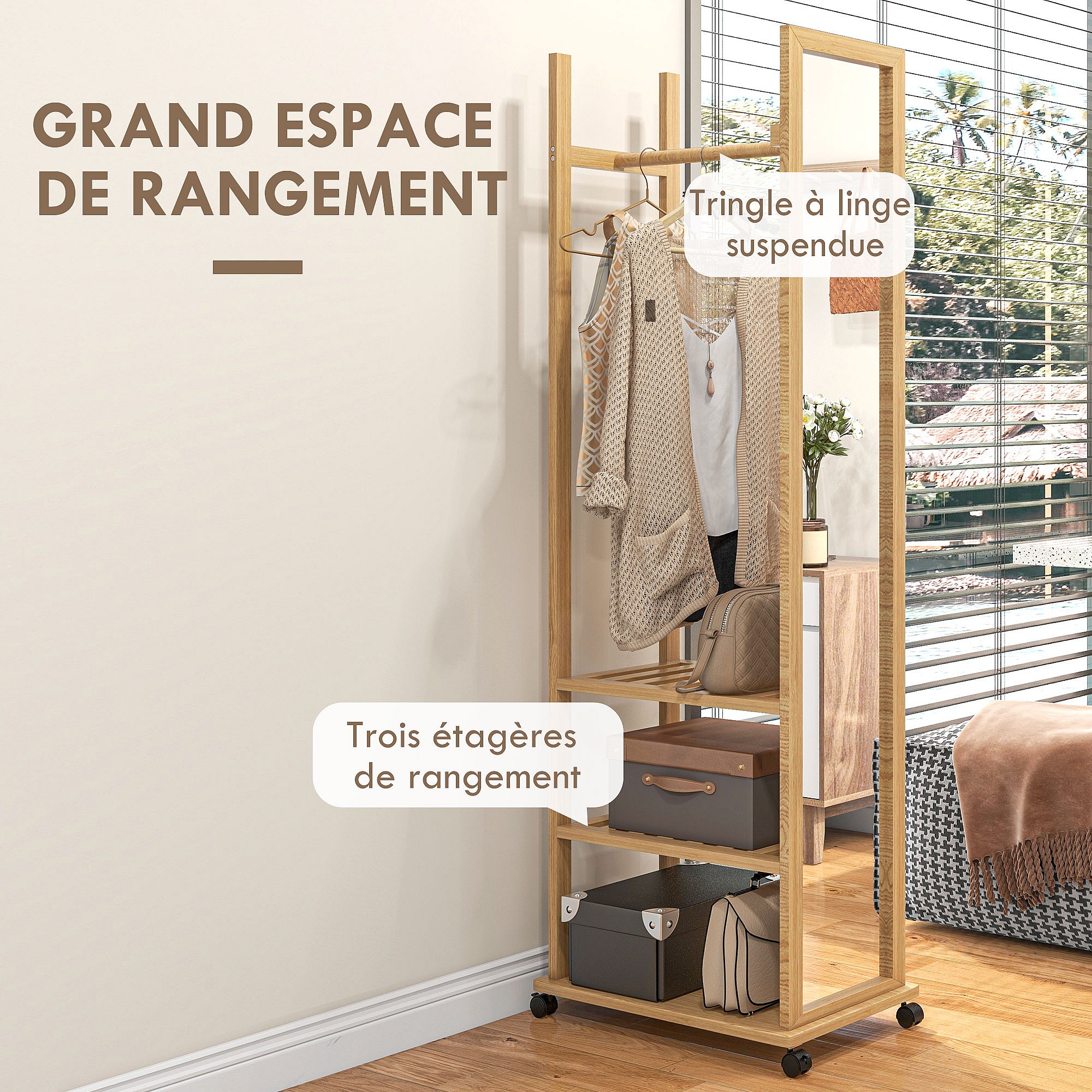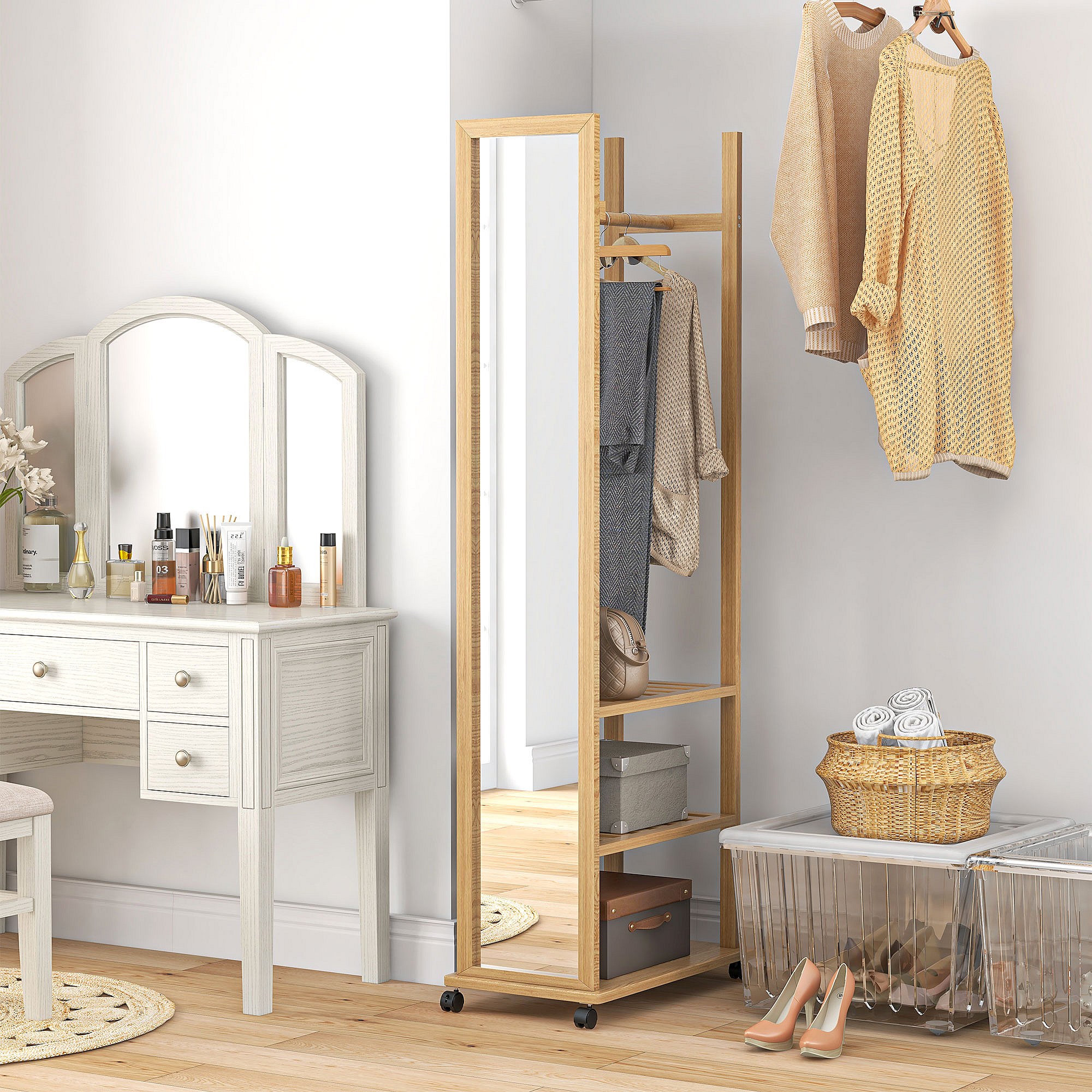 Miroir sur pied avec roulettes - portant, 3 étagères - dim. 59L x 35P x 170H cm - bois de jabon verni