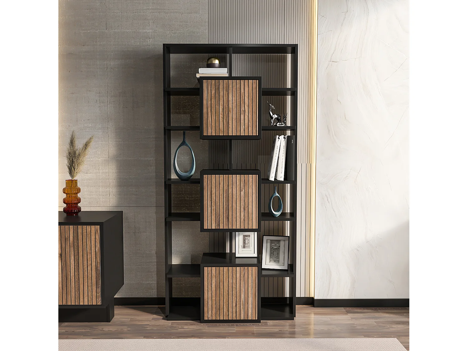 Monaco Bibliothèque Hauteur de 176 cm Armoires et Niches (Noir et Alina)