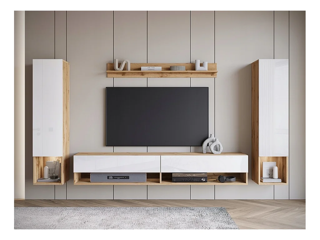 Mur TV moderne avec LED – ensemble mural suspendu pour salon 2 colonnes + meuble TV 180 cm + étagère, corps chêne wotan, façades blanc brillant