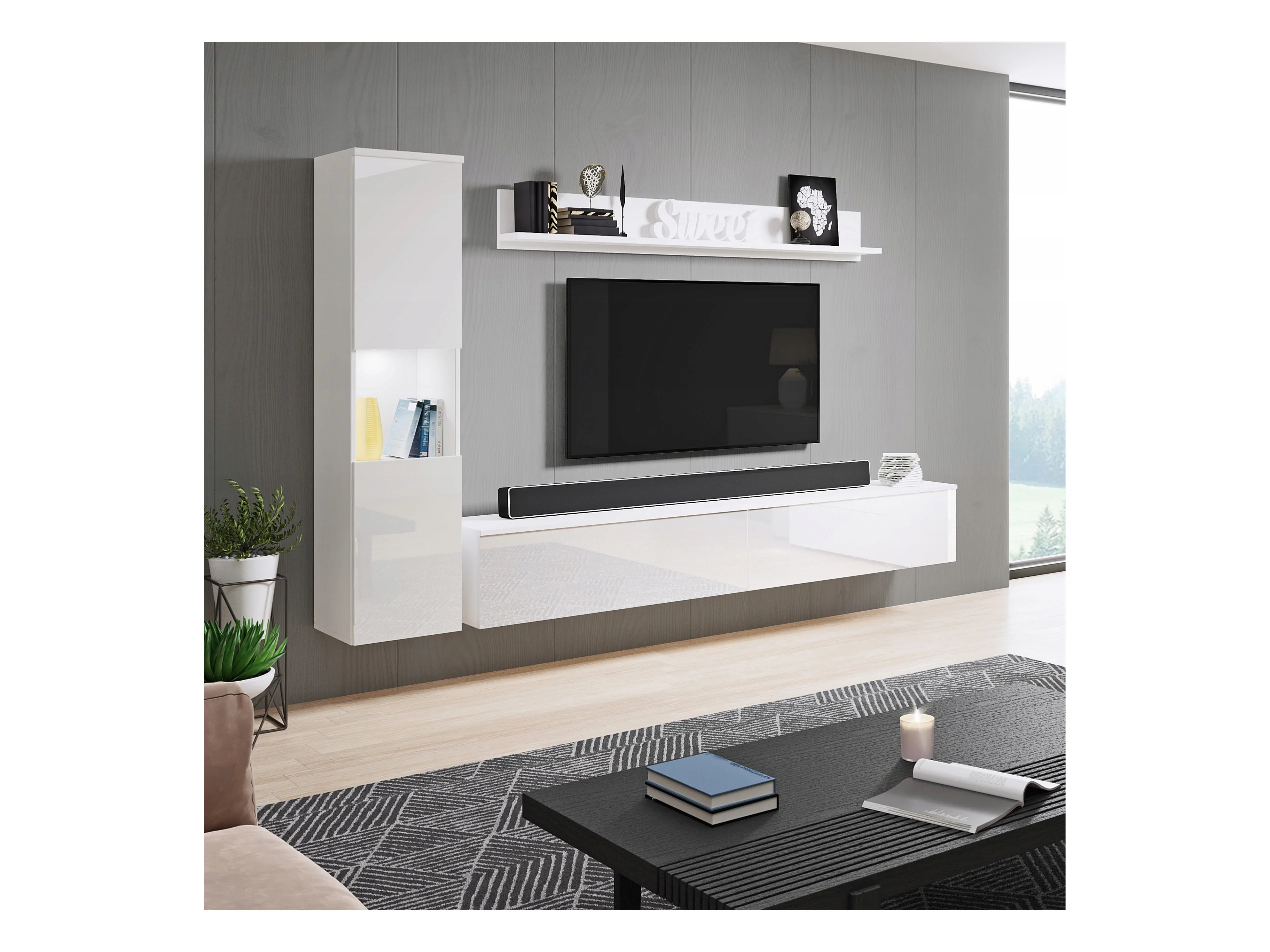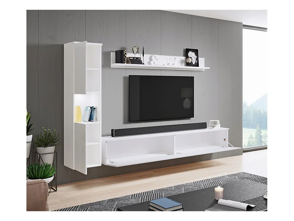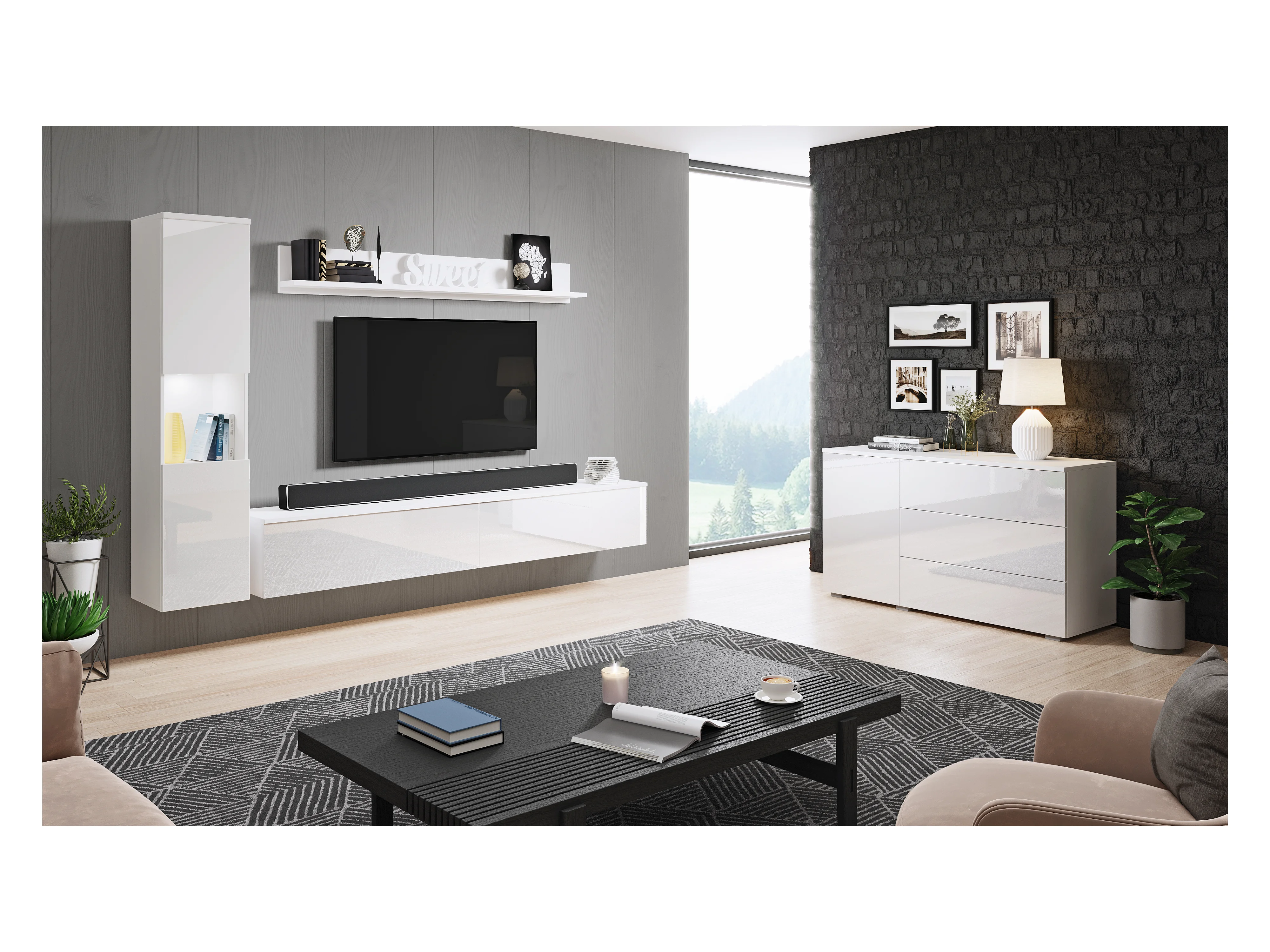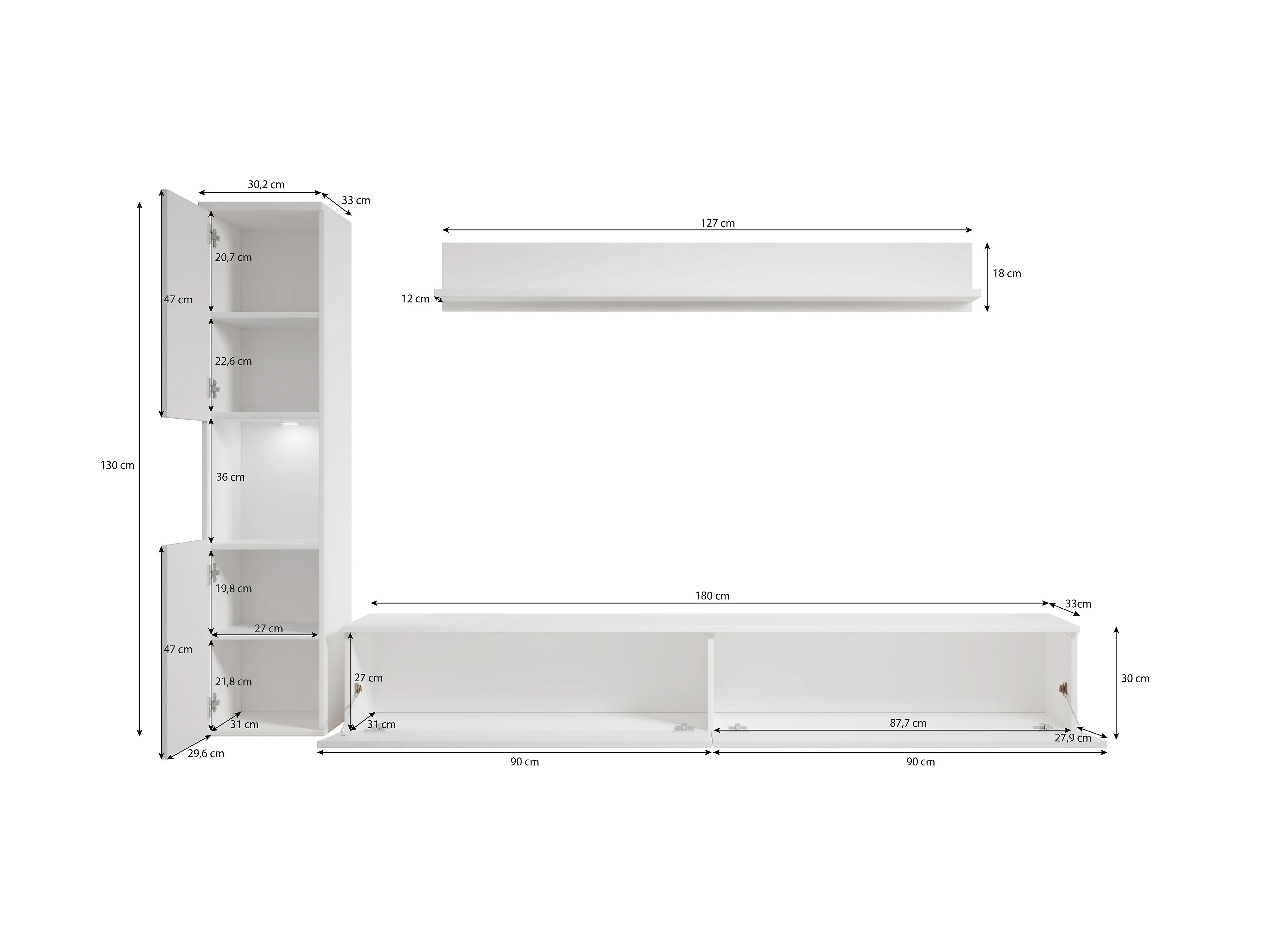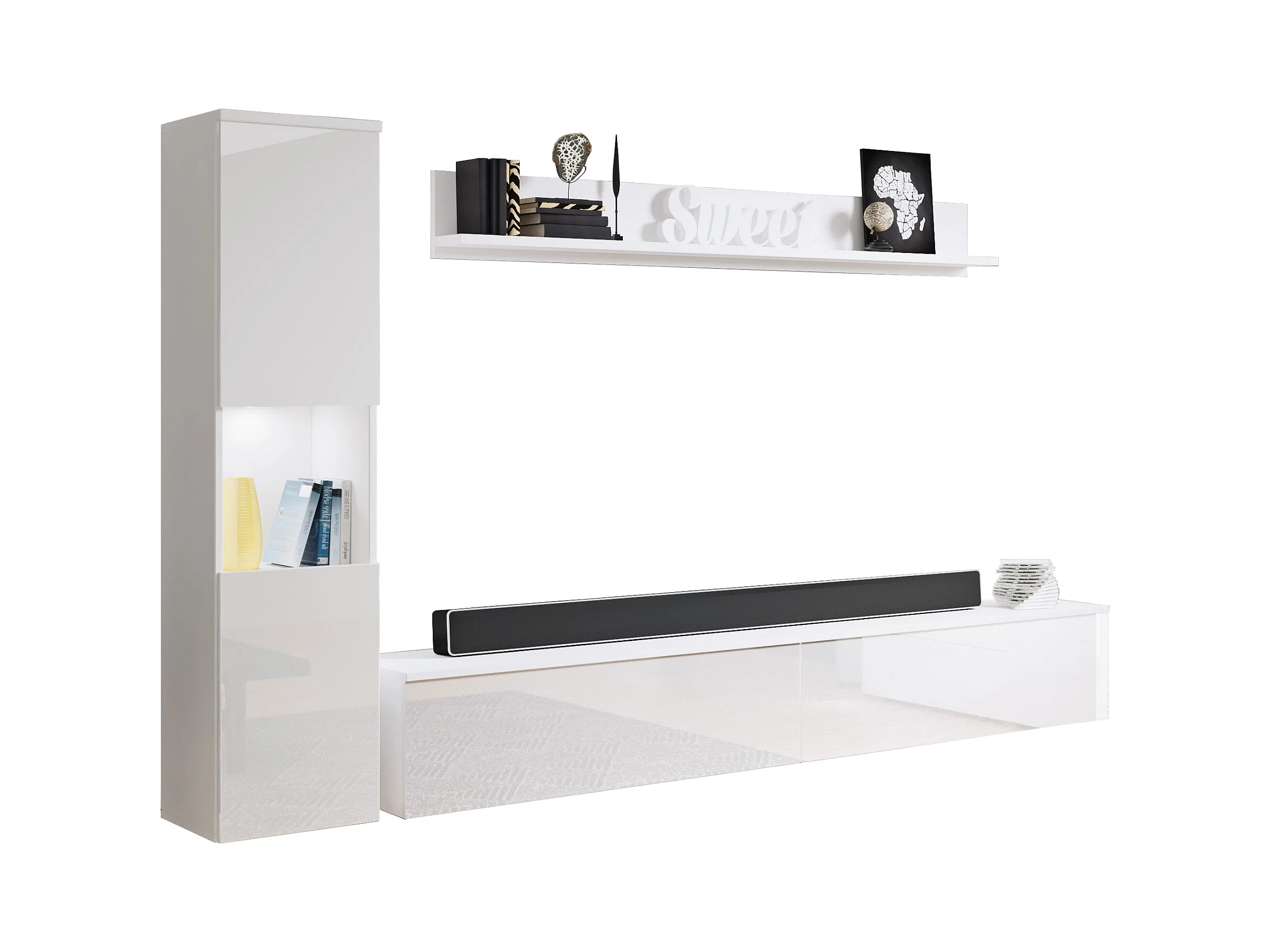 Mural de salon moderne 3 éléments avec LED, façades brillantes, colonne et meuble TV 180 cm corps blanc mat, façades blanc brillant