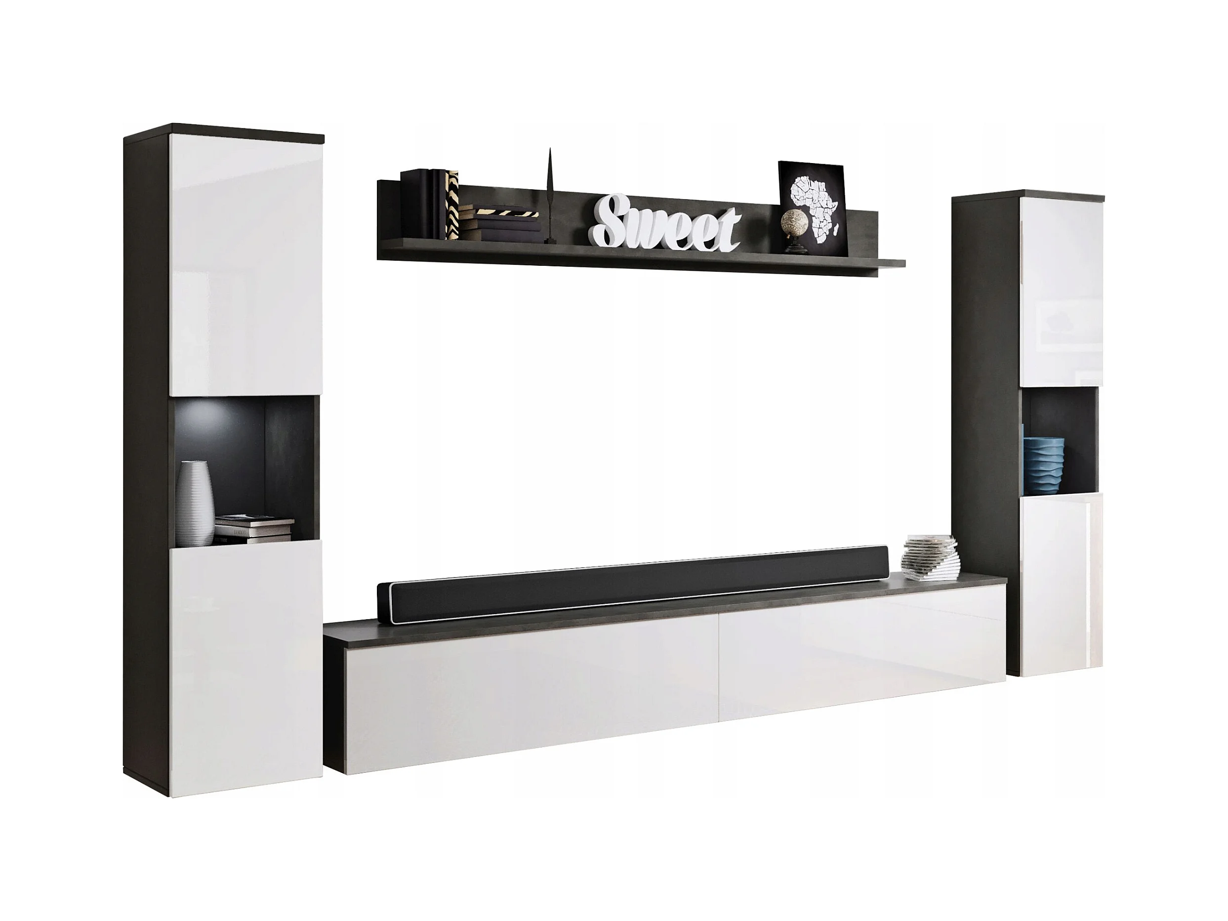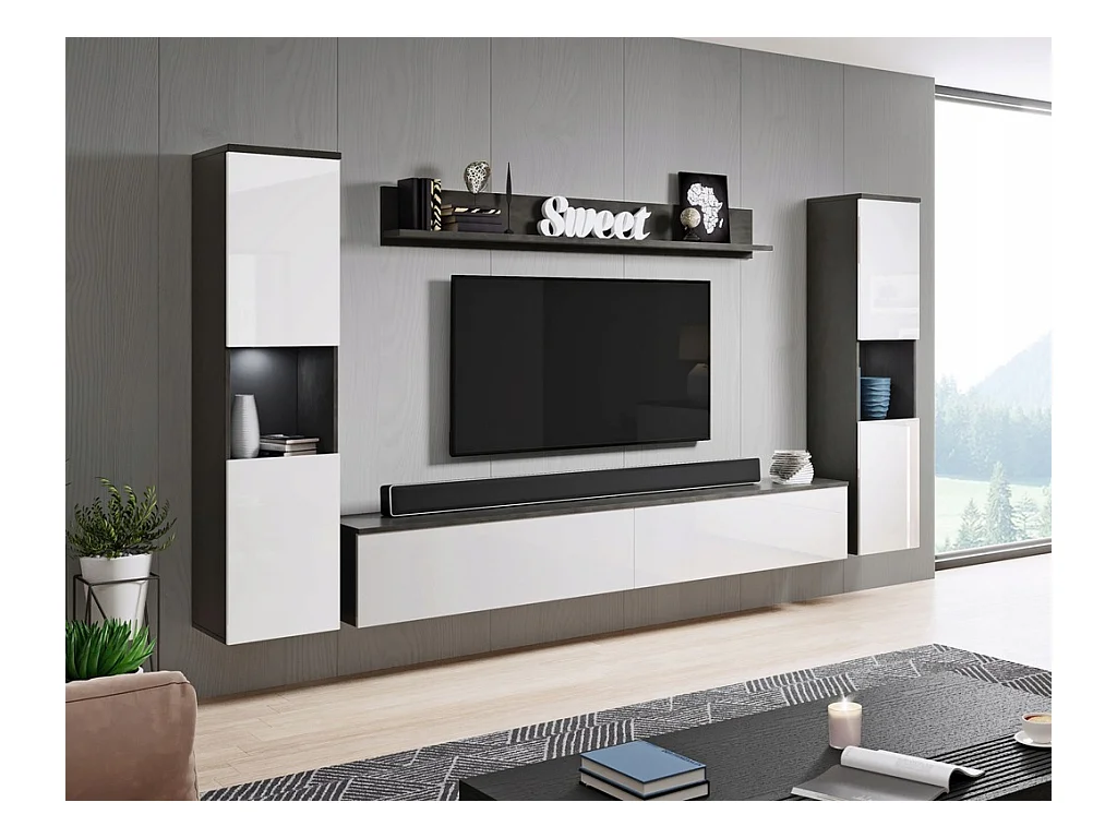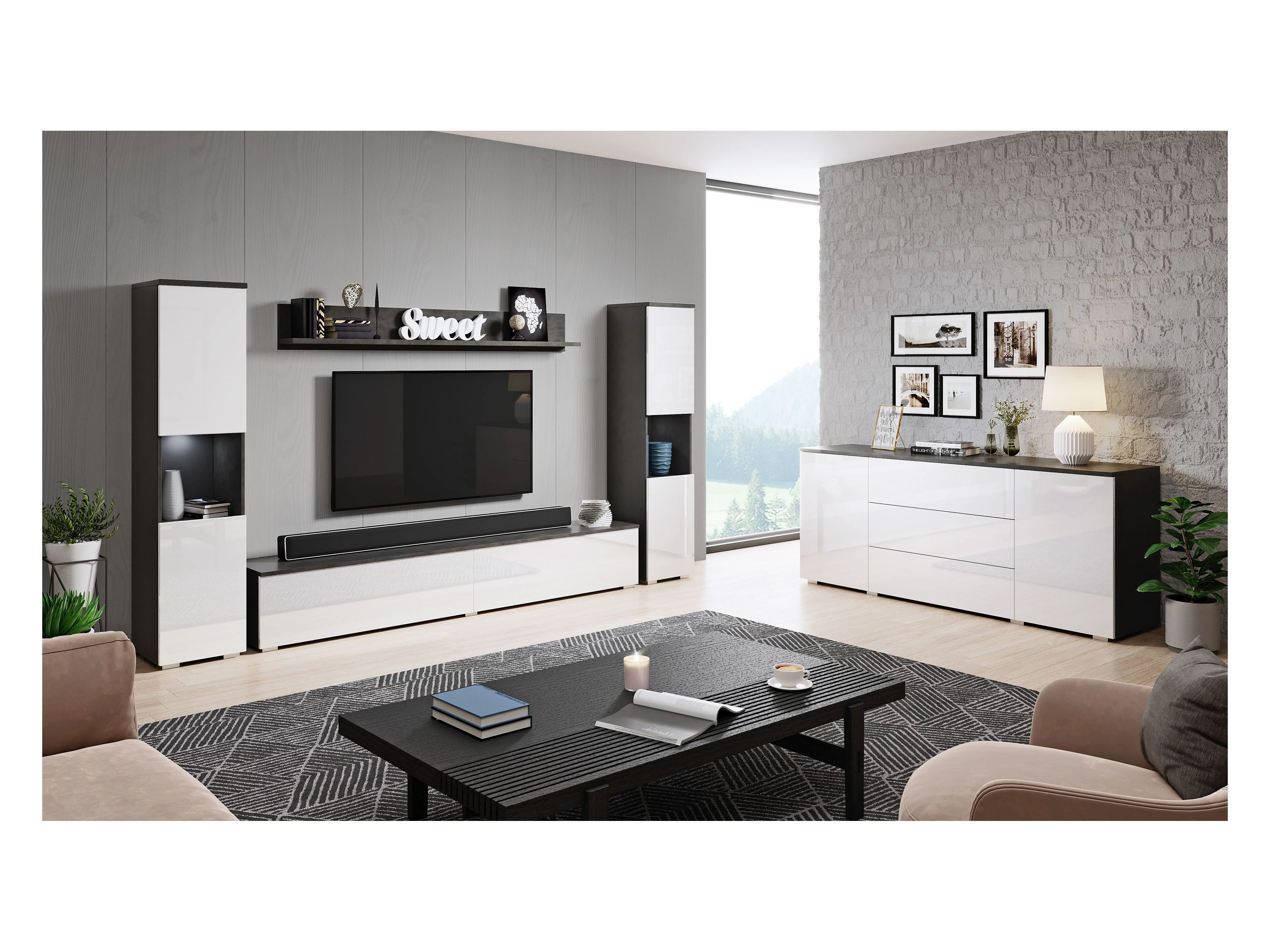 Mural de salon moderne 4 éléments avec LED, 2 colonnes, meuble TV 180 cm et étagère, corps anthracite mat, façades blanc brillant
