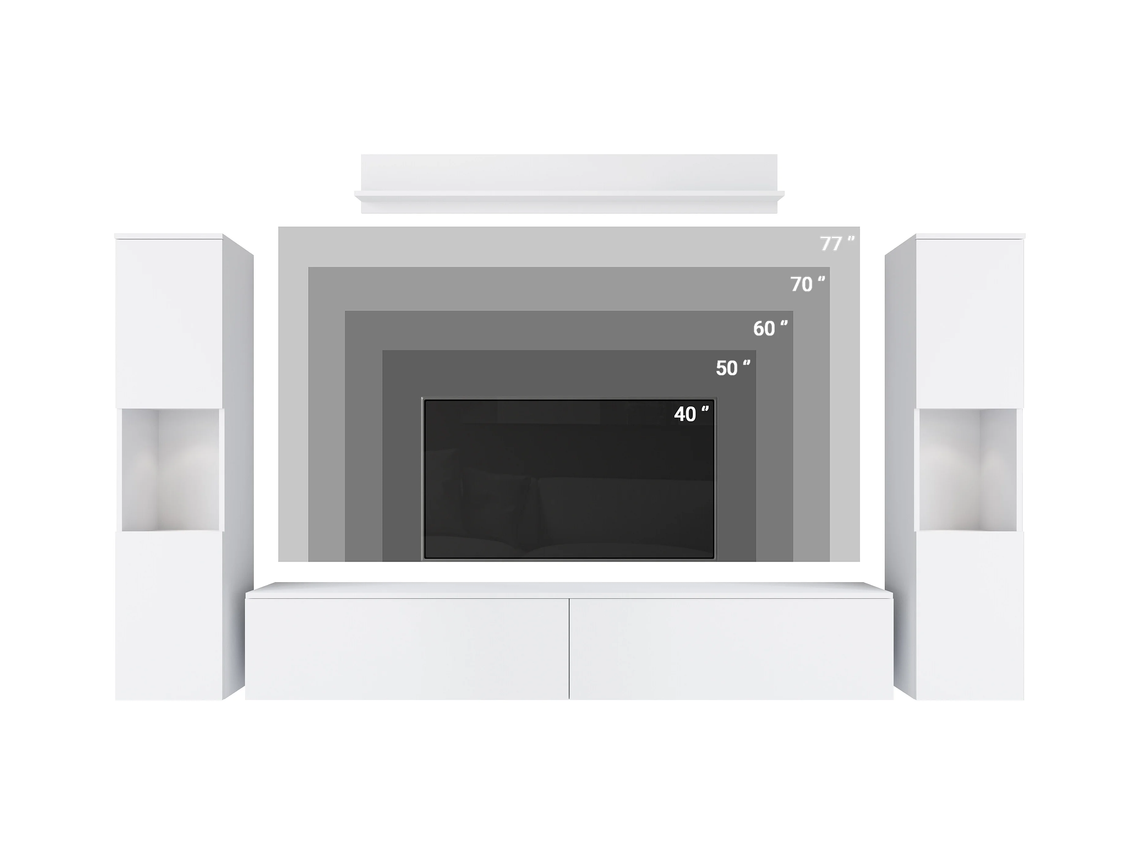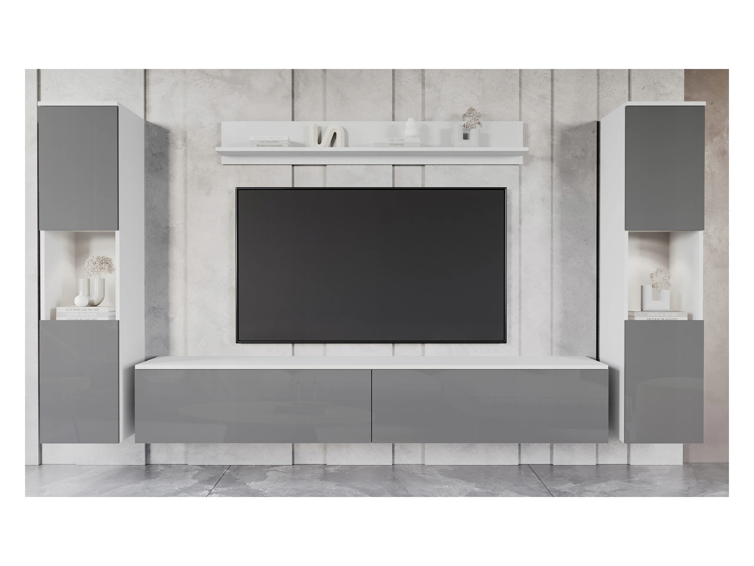 Mural de salon moderne 4 éléments avec LED, 2 colonnes, meuble TV 180 cm et étagère, corps blanc mat, façades gris brillant
