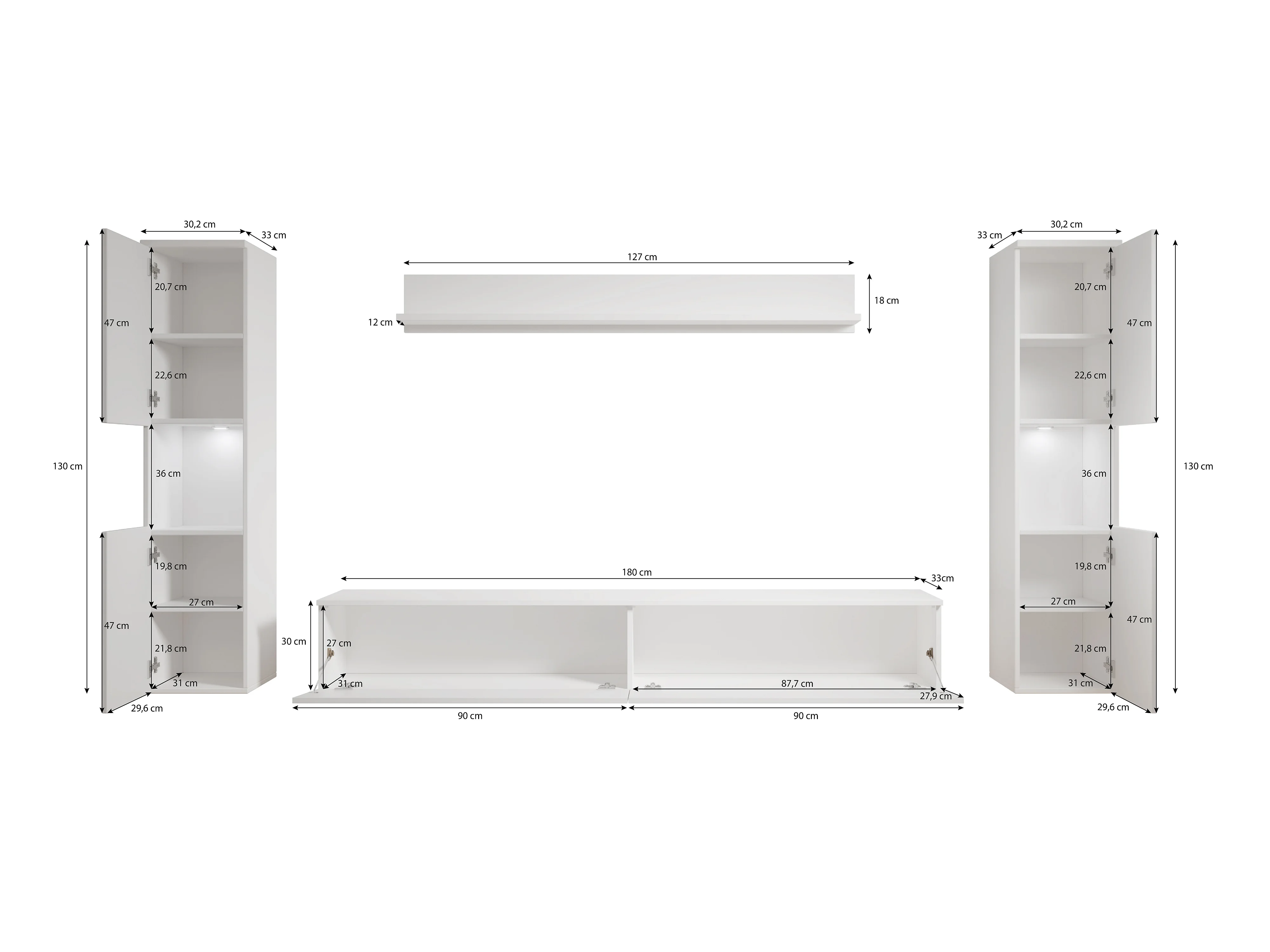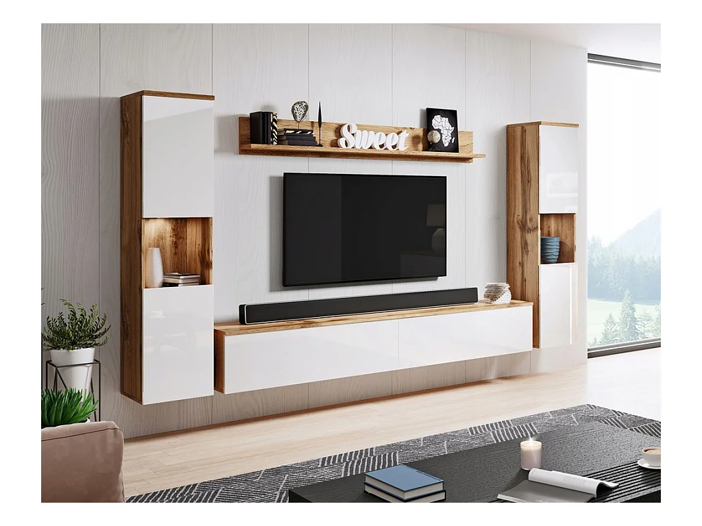 Mural de salon moderne 4 éléments avec LED, 2 colonnes, meuble TV 180 cm et étagère, corps chêne wotan, façades blanc brillant
