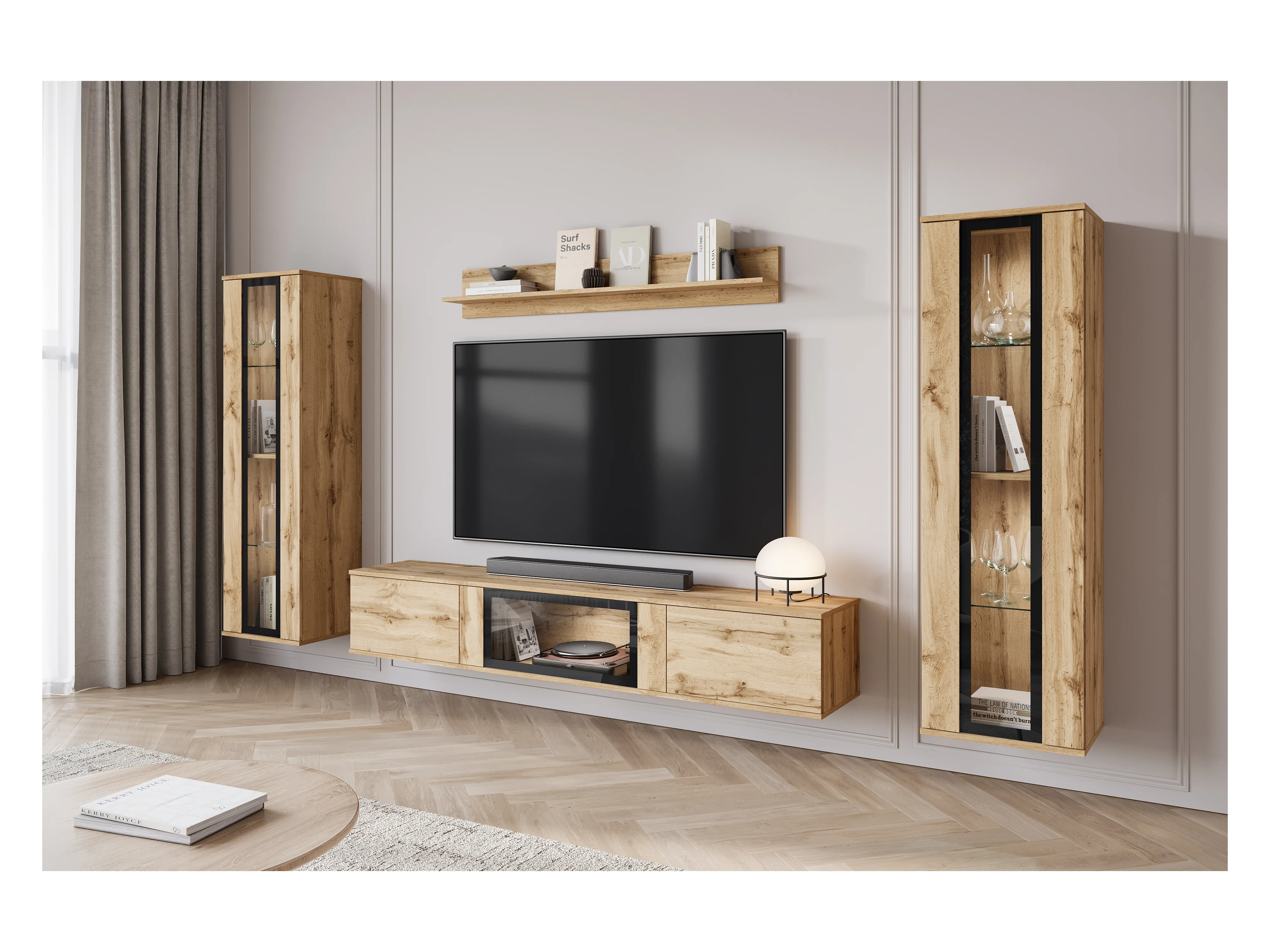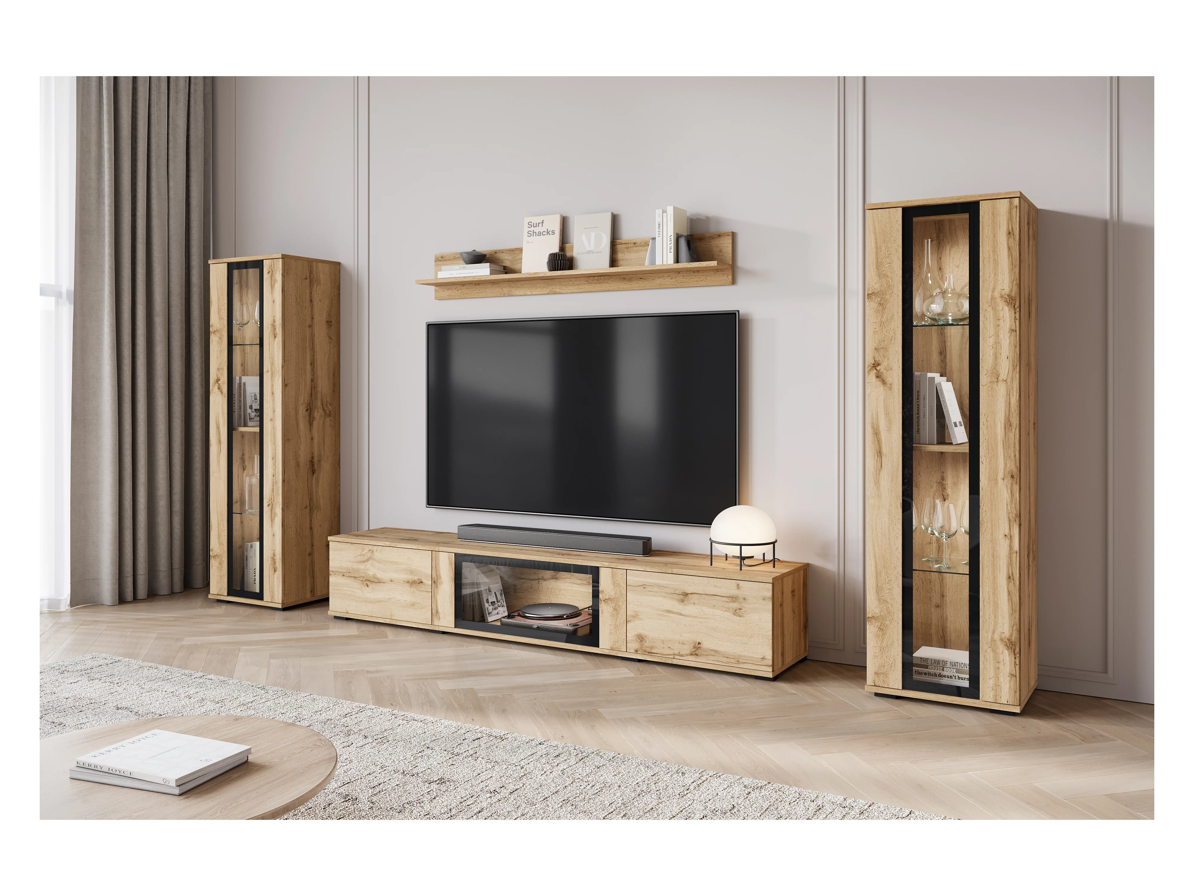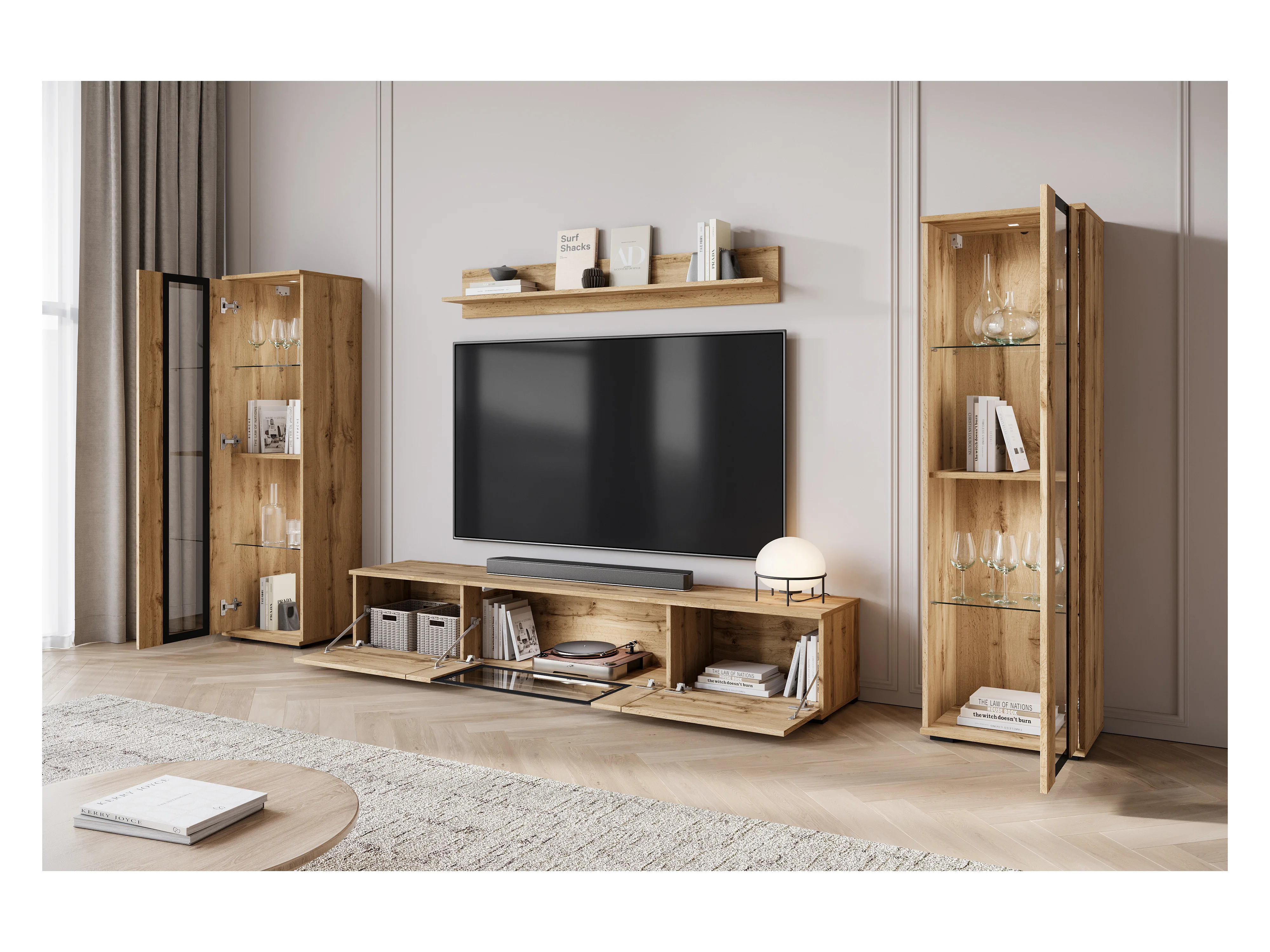 Mural de salon moderne avec LED mat 2 vitrines et meuble TV 180 cm chêne wotan