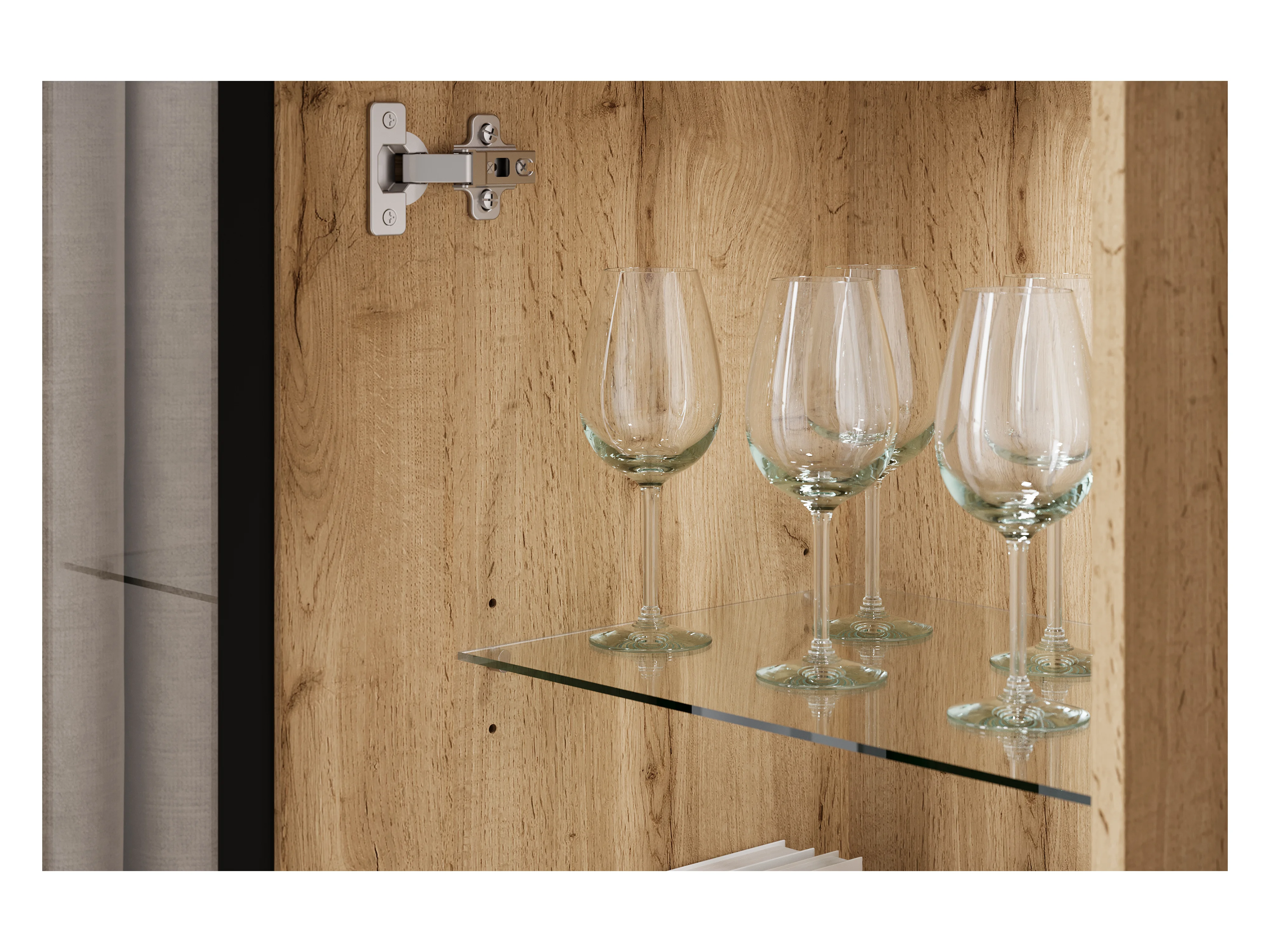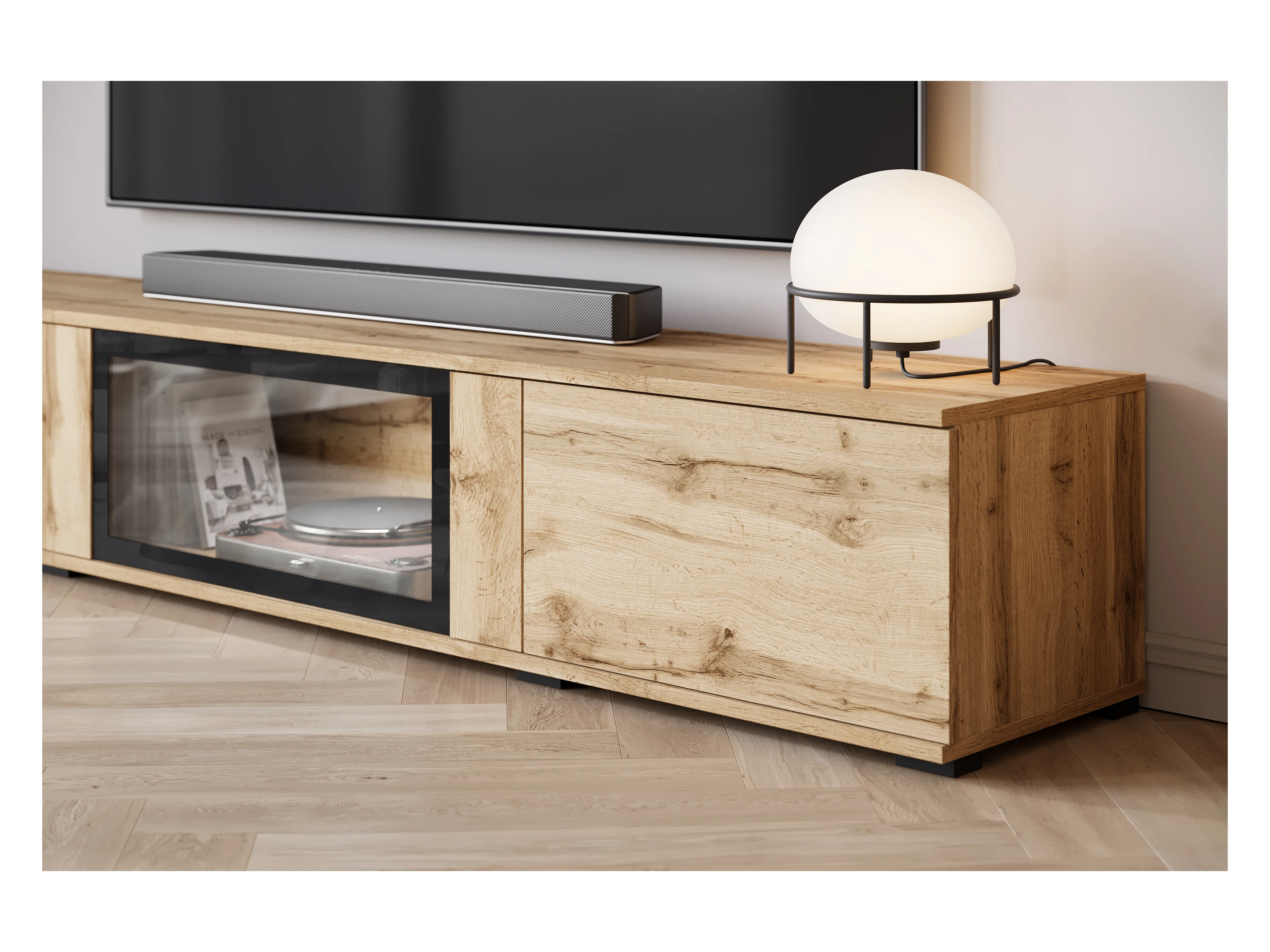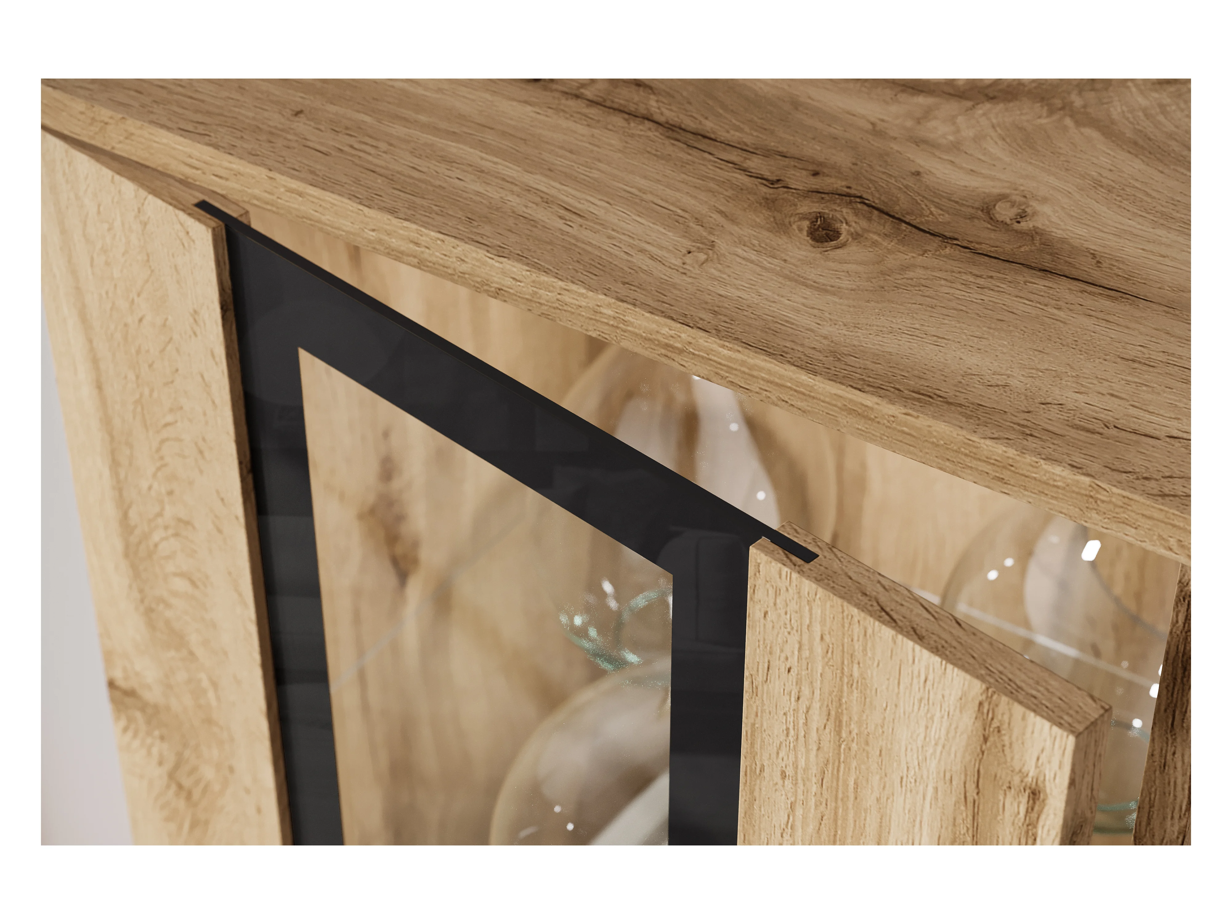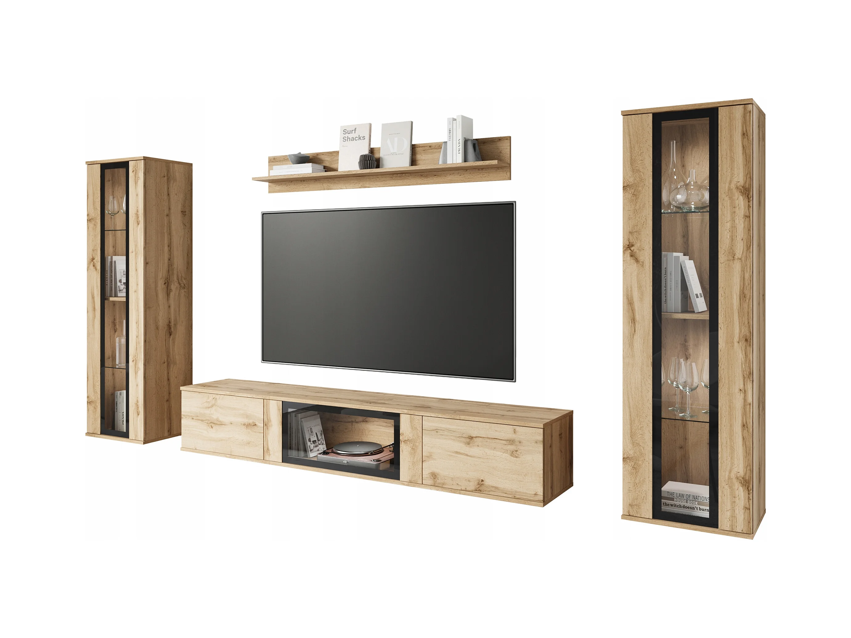 Mural de salon moderne avec LED mat 2 vitrines et meuble TV 180 cm chêne wotan