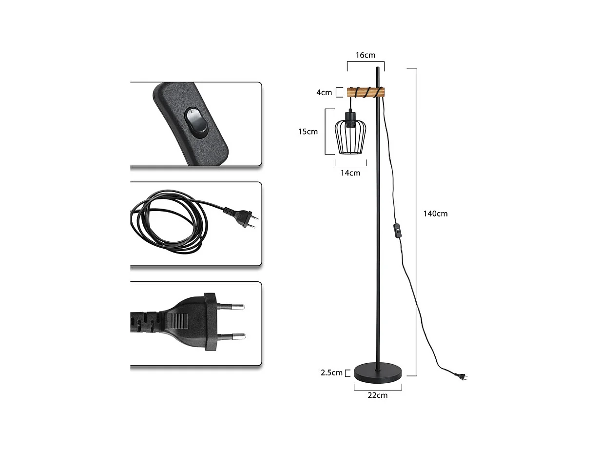 NETTLIFE Lampadaire de salon en bois Lampe de sol vintage : Lampe de salon noire Lampadaire sur pied au Douille E27 146 cm (sans ampoule)