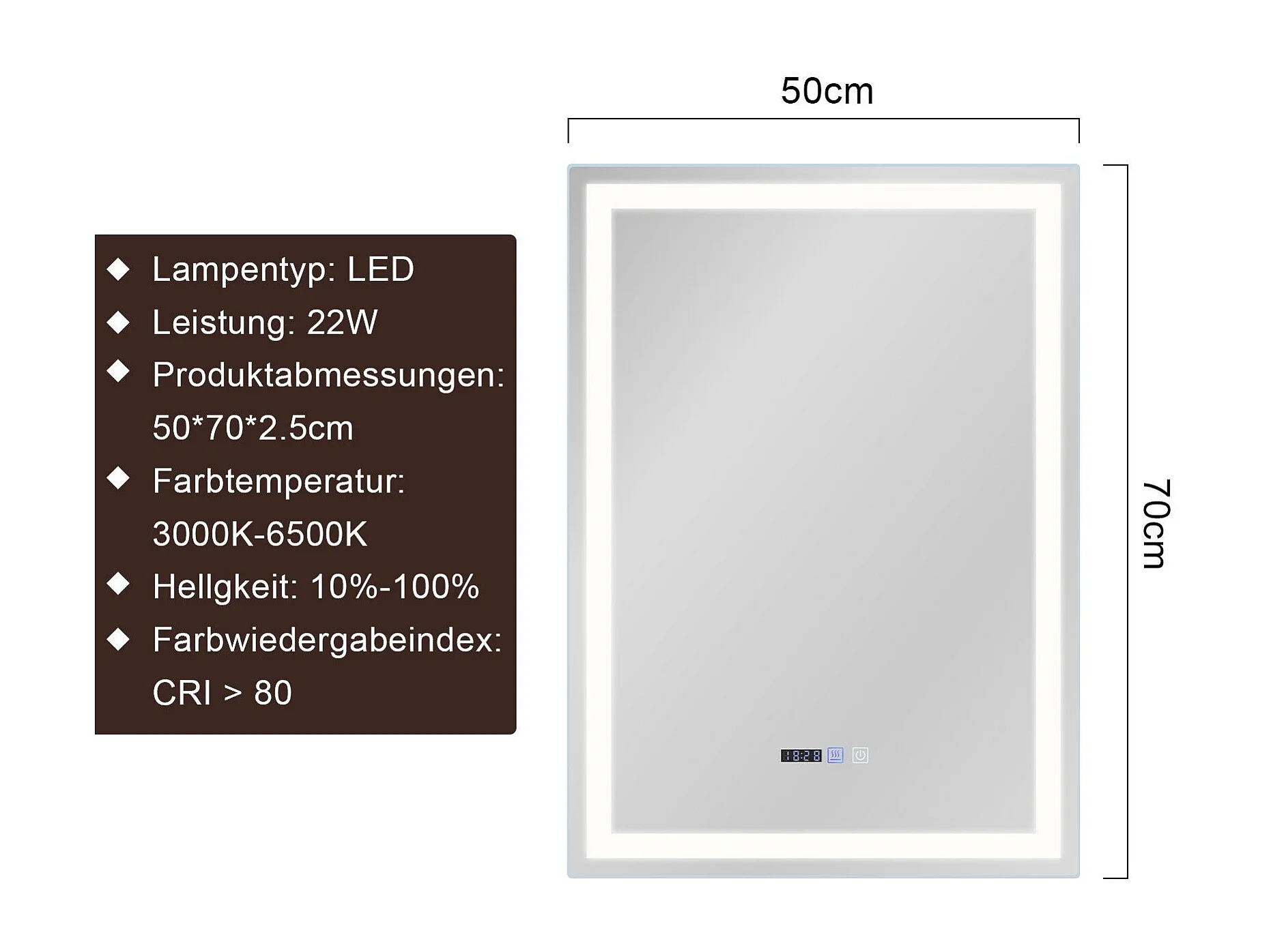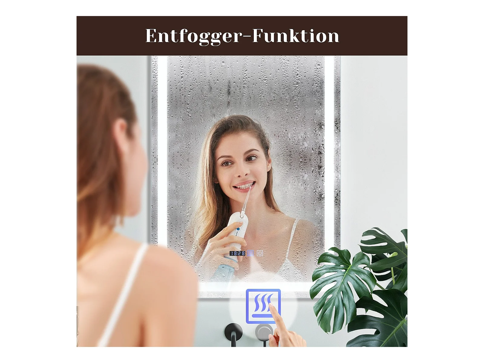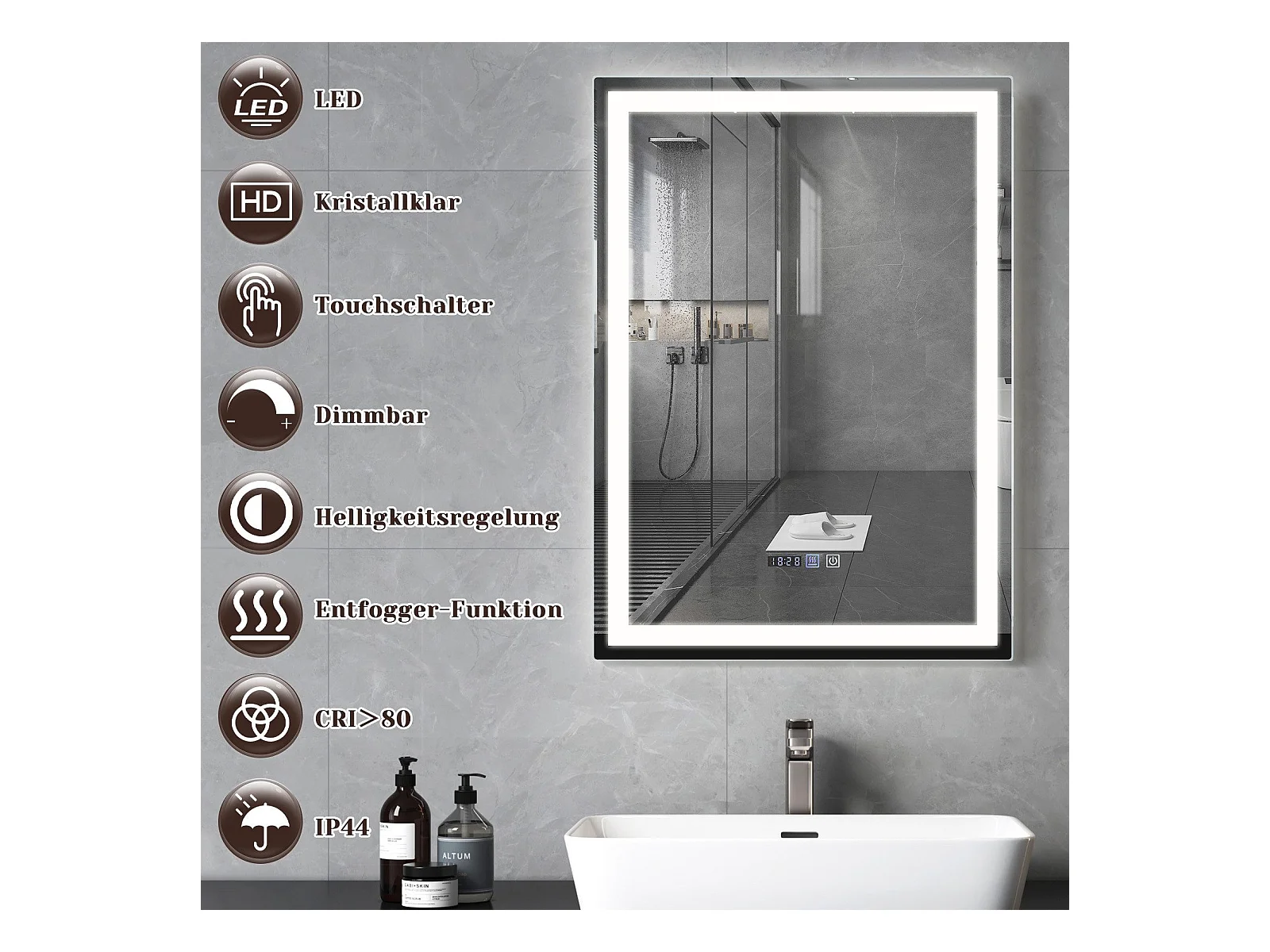 NETTLIFE Miroir lumineux salle de bain - 50x70 cm LED, mural, IP44, interrupteur tactile, horloge, antibuée, réglable