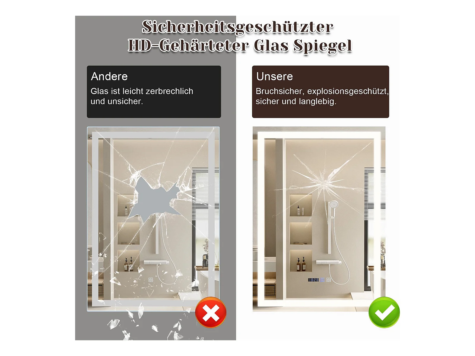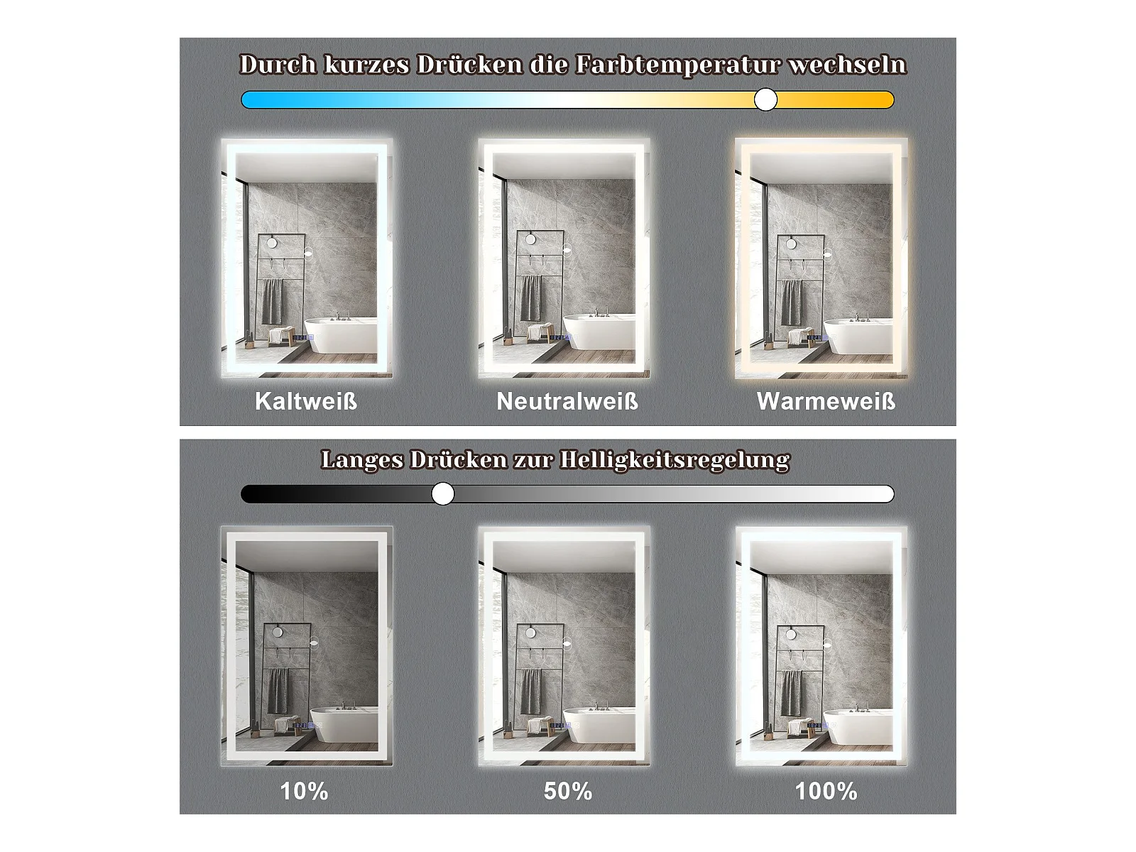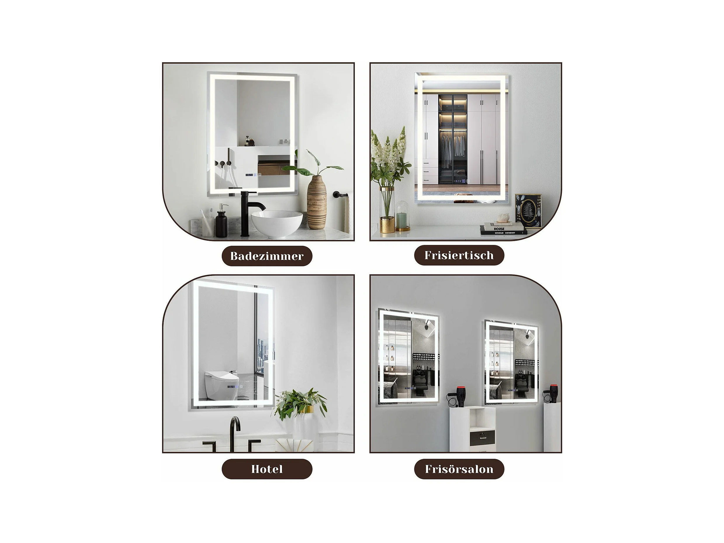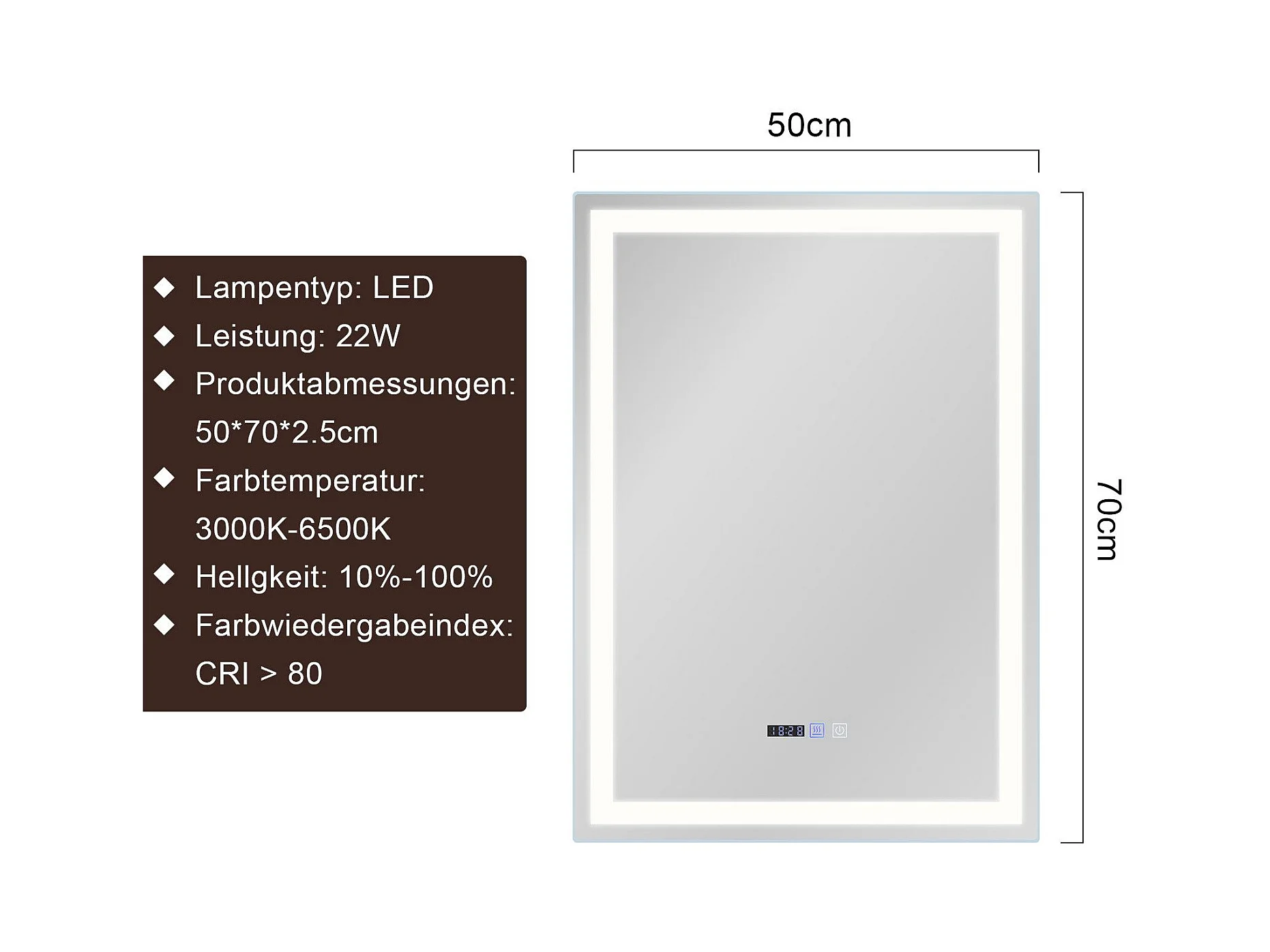 NETTLIFE Miroir lumineux salle de bain - 50x70 cm LED, mural, IP44, interrupteur tactile, horloge, antibuée, réglable