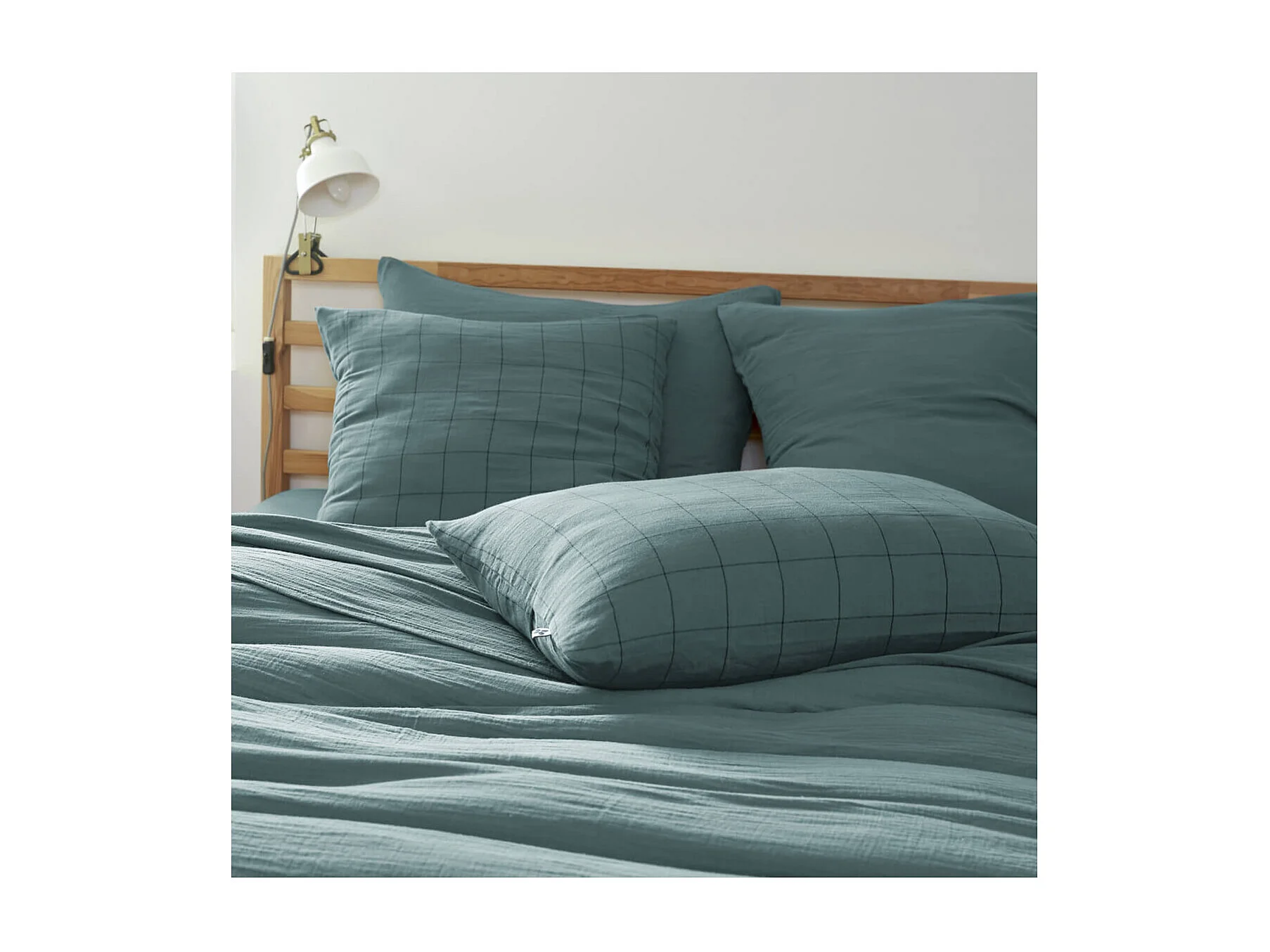 Taie d'oreiller à carreaux double gaze de coton bleu canard 50x70